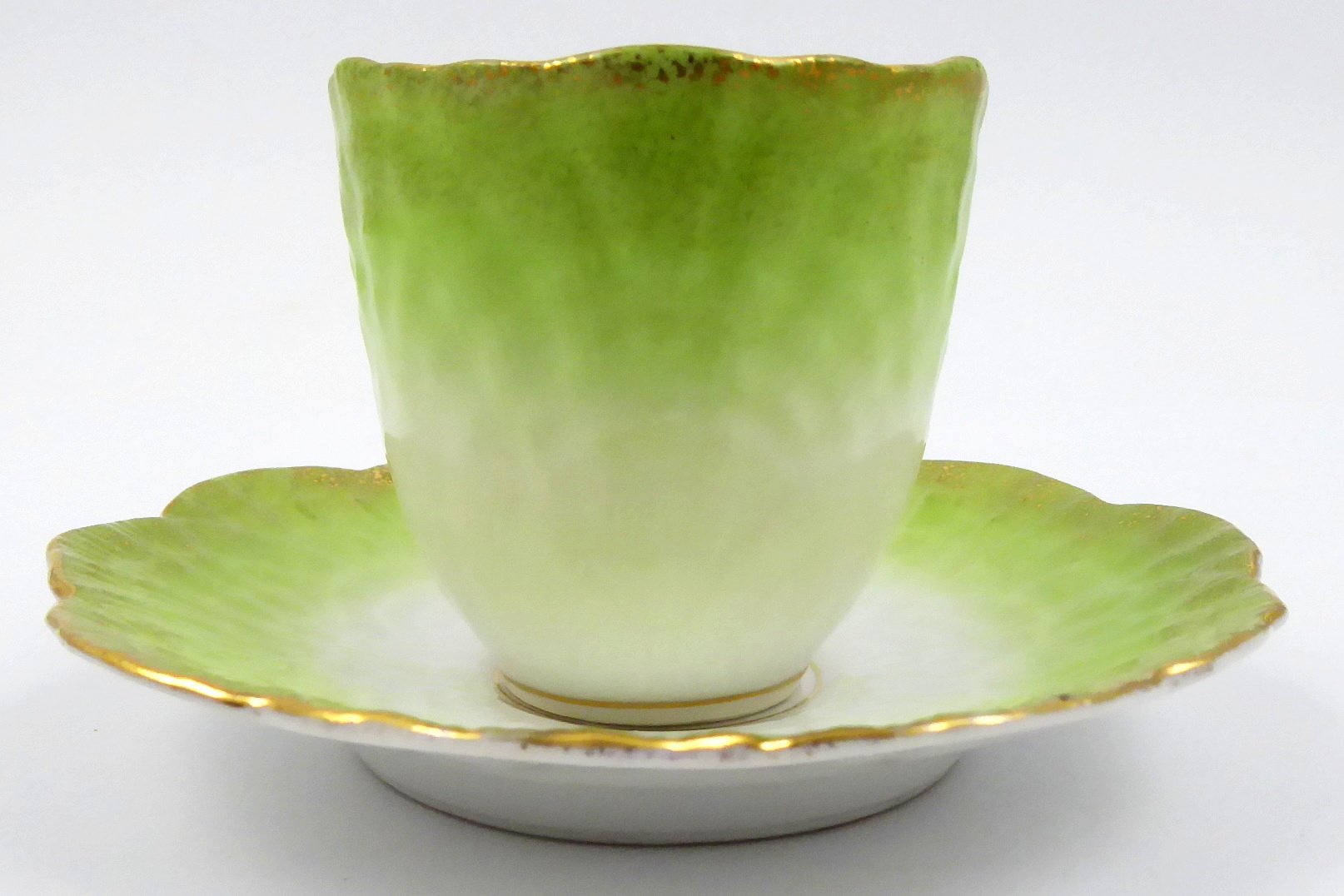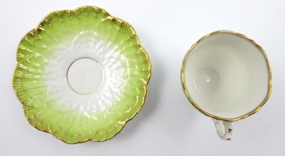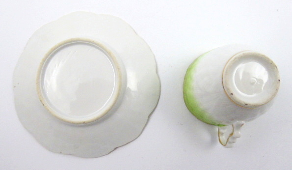 Bílý, barevný a ručně zlacený porcelán. Koflík s podšálkem v bílé a zelinkavé barevnosti s reliéfními ornamenty stylizovanými do vrstev okvětních lístků doplněných o ručně zlacený dekor. Neznačeno. Čechy 1880 – 1910. Výška šálku 6 cm, průměr podšálku 11 cm.