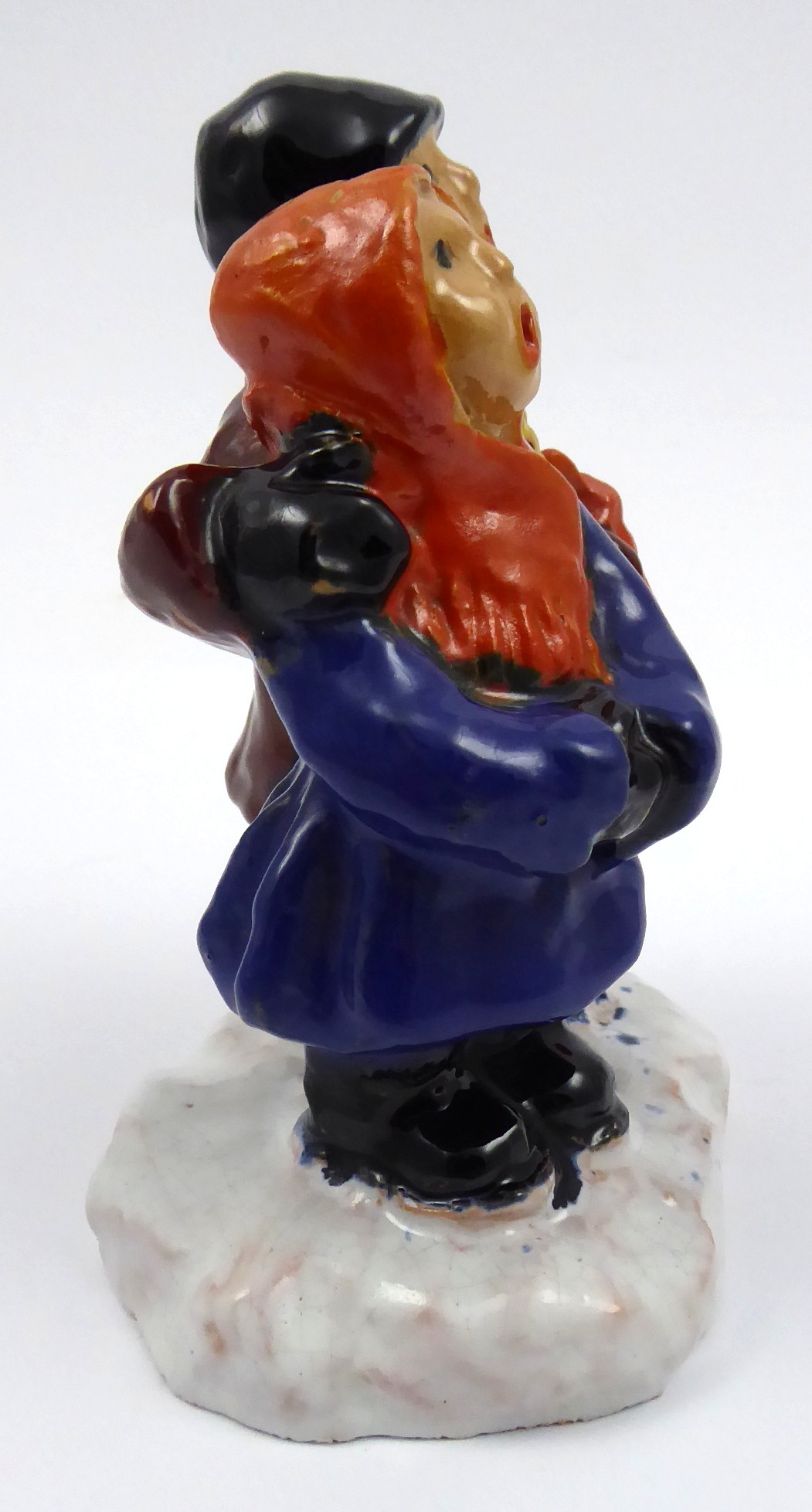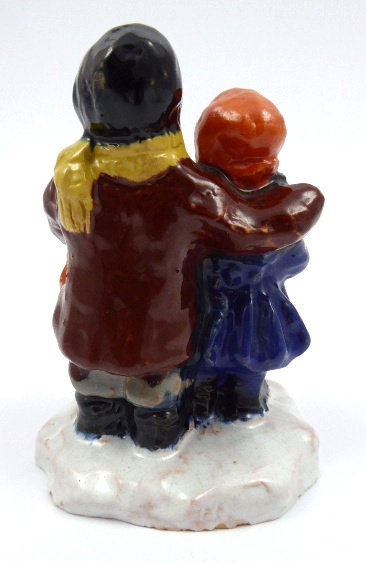 Ručně barevně malovaná a glazovaná umělecká keramika. Malí koledníci v zimních kabátcích s pytlem na koledu z ručně barevně malované a glazované umělecké keramiky. Do sněhové pokrývky stylizovaný reliéfní podstavec. Značeno zespodu: tužkou psaná čísla 17/47 (počet kusů ?), čísla 76.40 a vtlačené MADE IN CZECHOSLOVAKIA. Československo 1950 – 1970. Výška 14 cm, rozměr podstavce 9,5 cm x 7,5 cm.