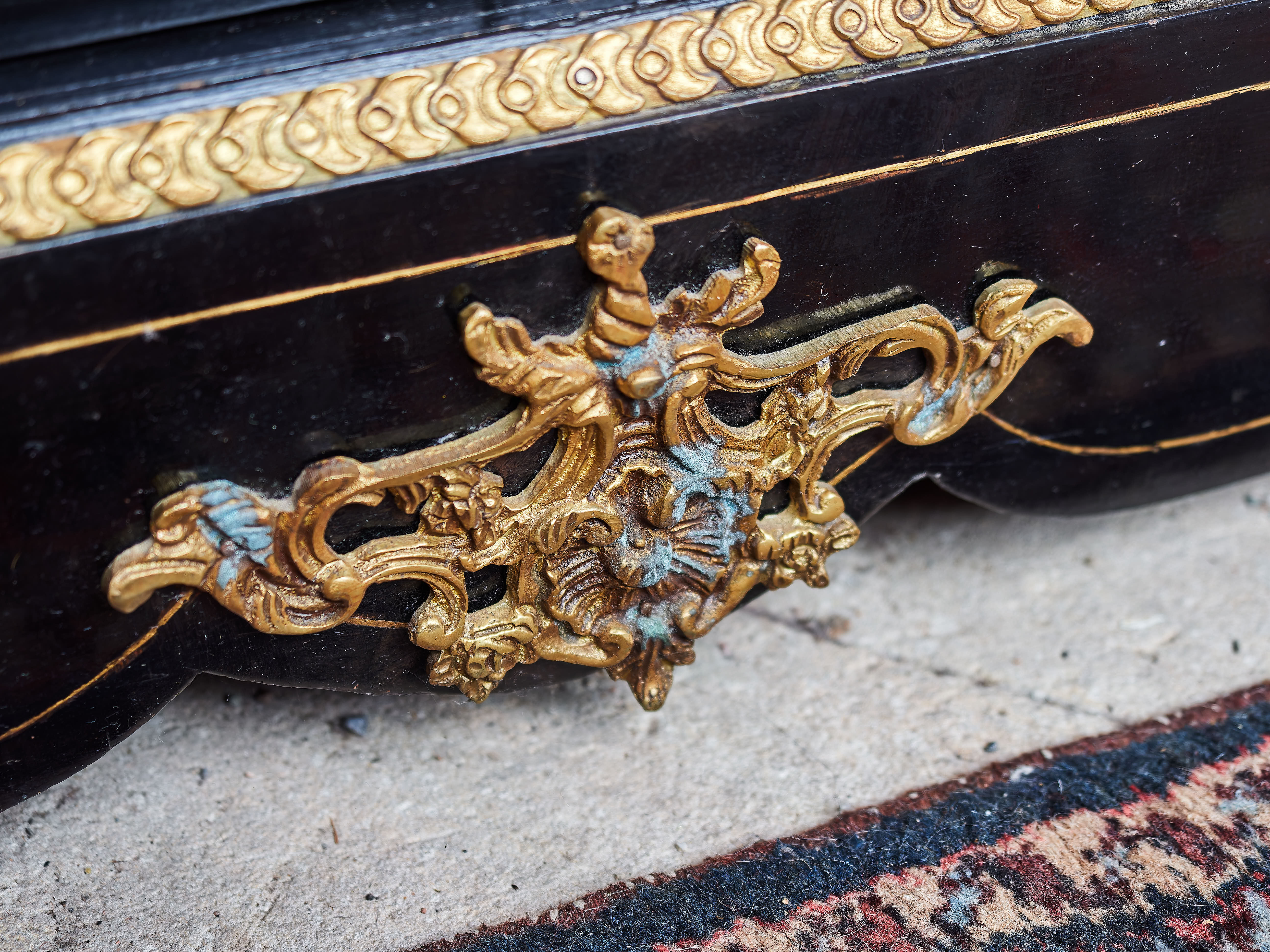 Reprezentativní komoda ve stylu Charlese Boulleho, vyrobená ve druhé polovině 20. století. Tento nábytek navazuje na tradici francouzského baroka a období Ludvíka XIV., kdy se technika tzv. boulle intarzie stala symbolem luxusu a vysoce ceněného uměleckého řemesla.