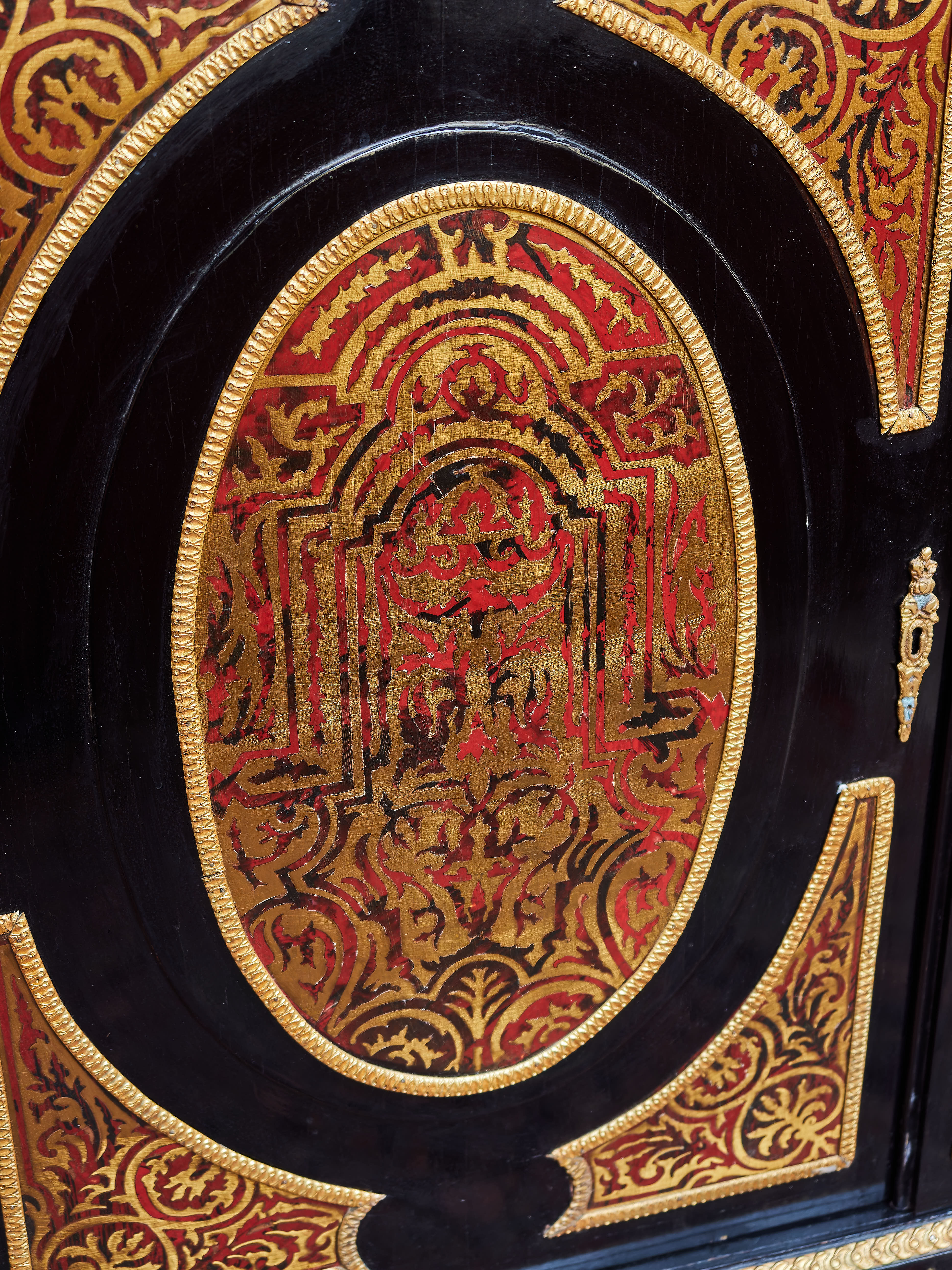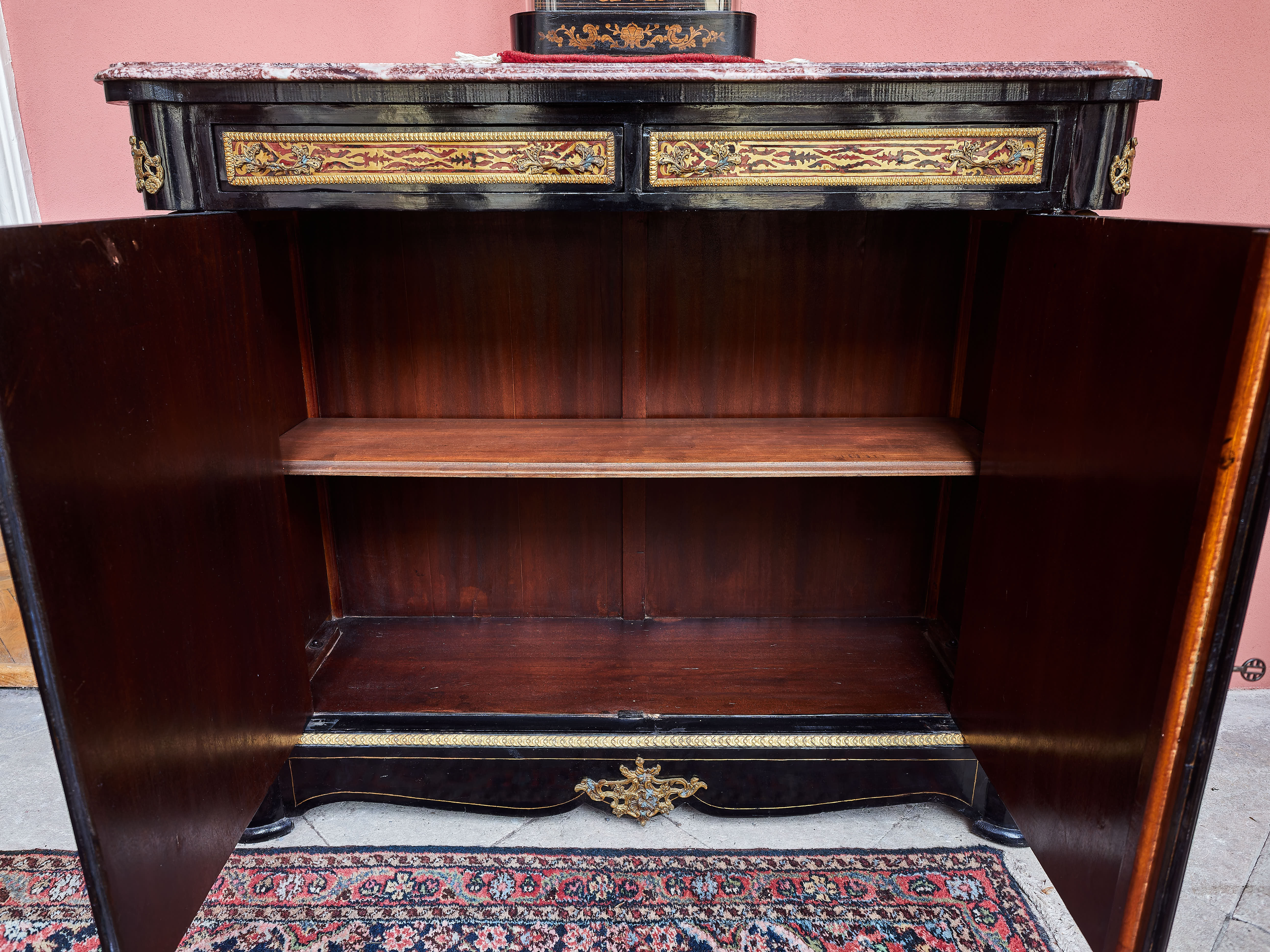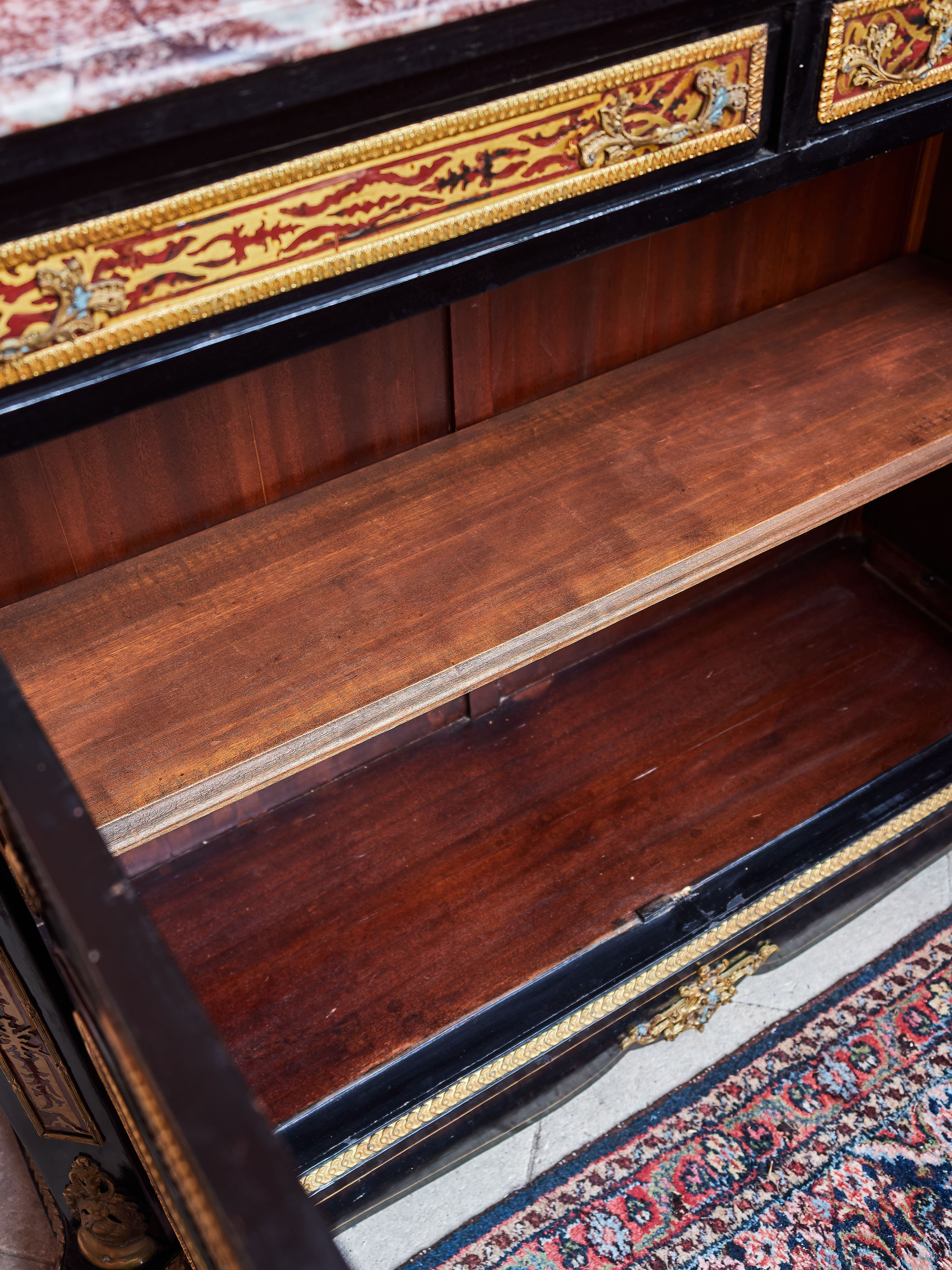 Komoda má dvoudveřový korpus doplněný o dva horní šuplíky, které poskytují dostatek úložného prostoru. Černě lakovaný povrch je bohatě zdoben typickou mosaznou a cínovou intarzií na podkladu připomínající červenou želvovinu, tvořící dekorativní rostlinné a ornamentální motivy. Dekor je dále zvýrazněn zlacenými bronzovými aplikacemi v podobě bočních herm, stylizovaných rozvilin a bohatě zdobených klíčových štítků. Horní část je osazena elegantní mramorovou deskou v odstínech červené a bílé, která podtrhuje luxusní vzhled kusu.
