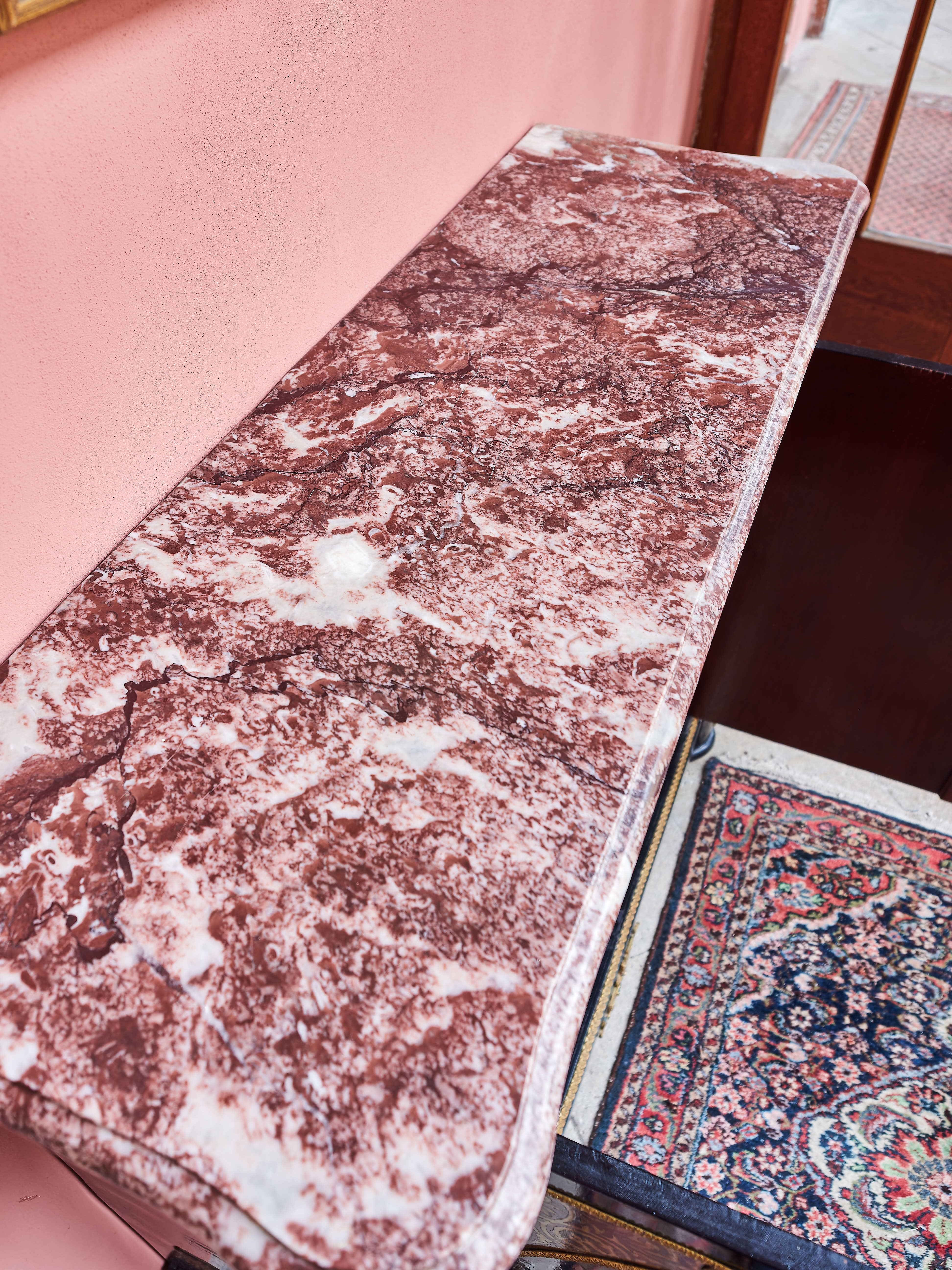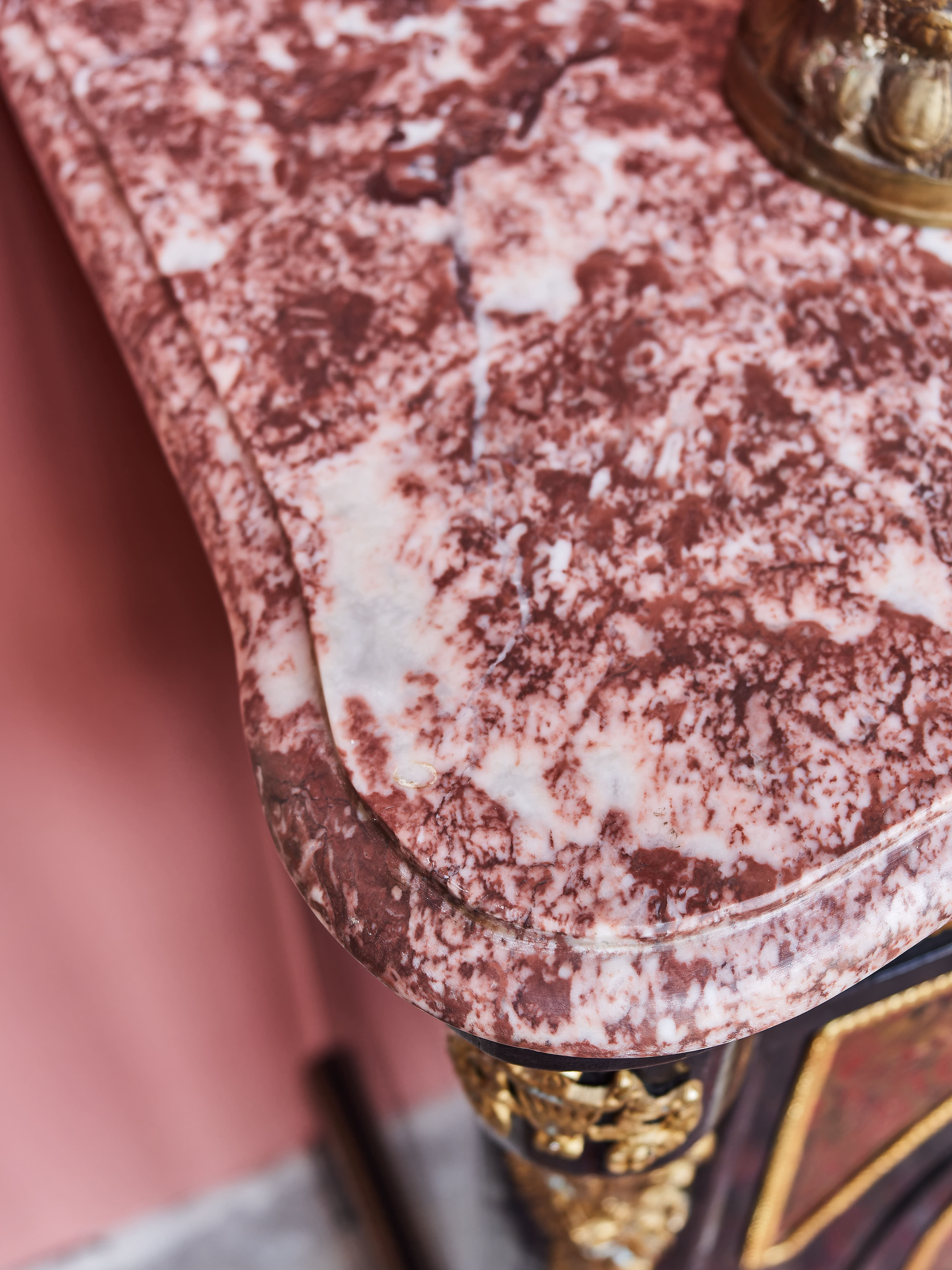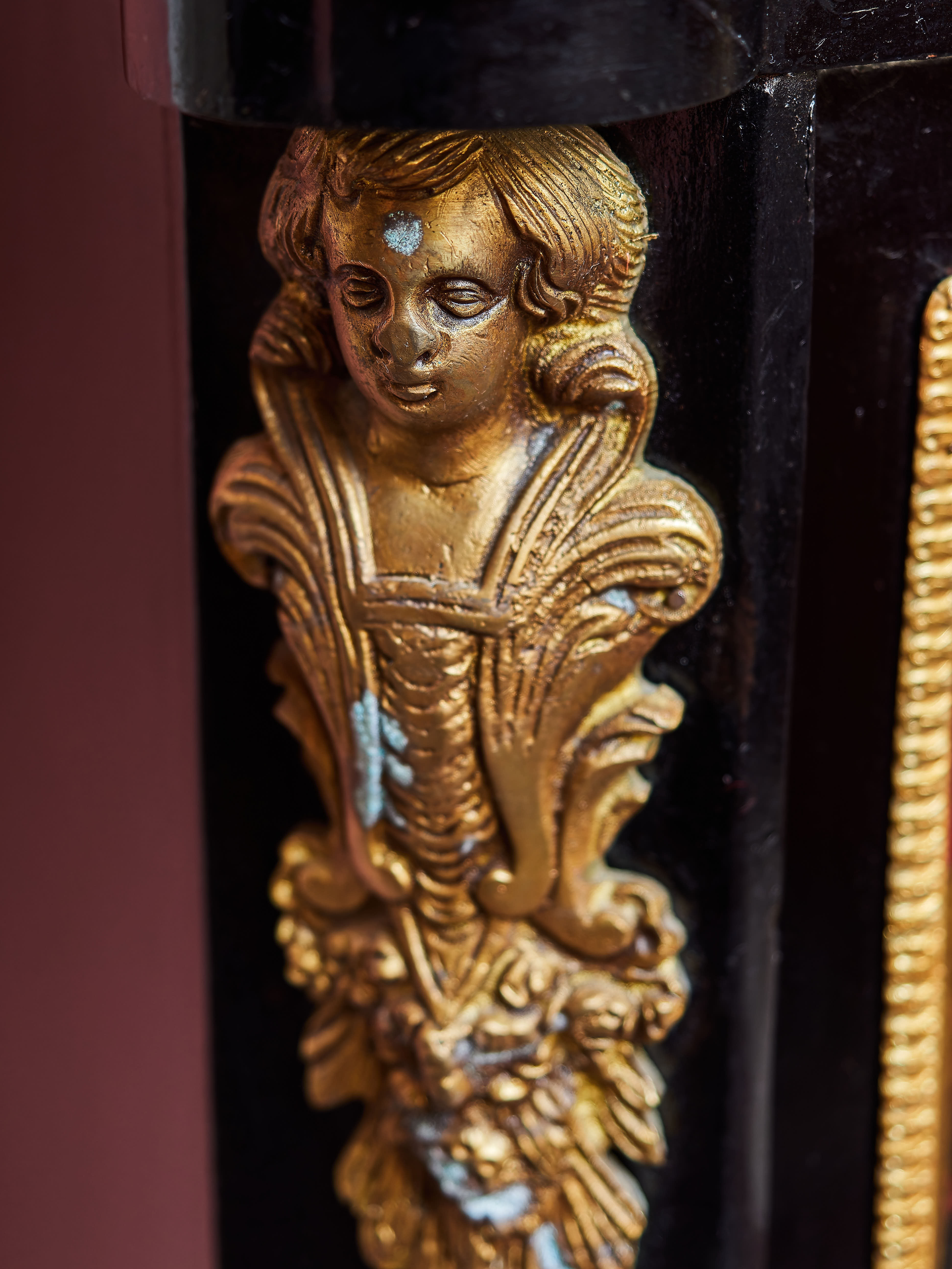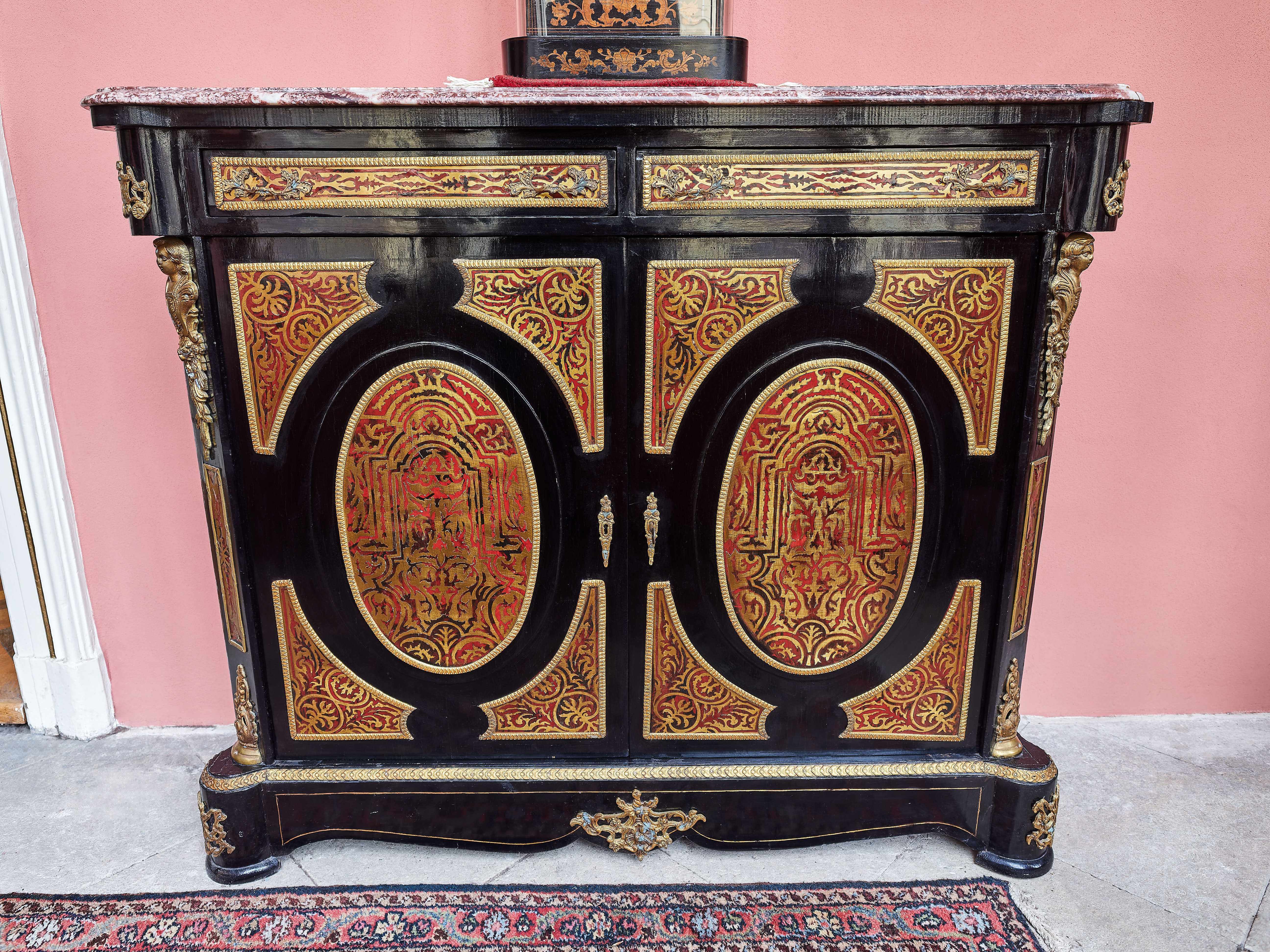 Komoda má dvoudveřový korpus doplněný o dva horní šuplíky, které poskytují dostatek úložného prostoru. Černě lakovaný povrch je bohatě zdoben typickou mosaznou a cínovou intarzií na podkladu připomínající červenou želvovinu, tvořící dekorativní rostlinné a ornamentální motivy. Dekor je dále zvýrazněn zlacenými bronzovými aplikacemi v podobě bočních herm, stylizovaných rozvilin a bohatě zdobených klíčových štítků. Horní část je osazena elegantní mramorovou deskou v odstínech červené a bílé, která podtrhuje luxusní vzhled kusu.