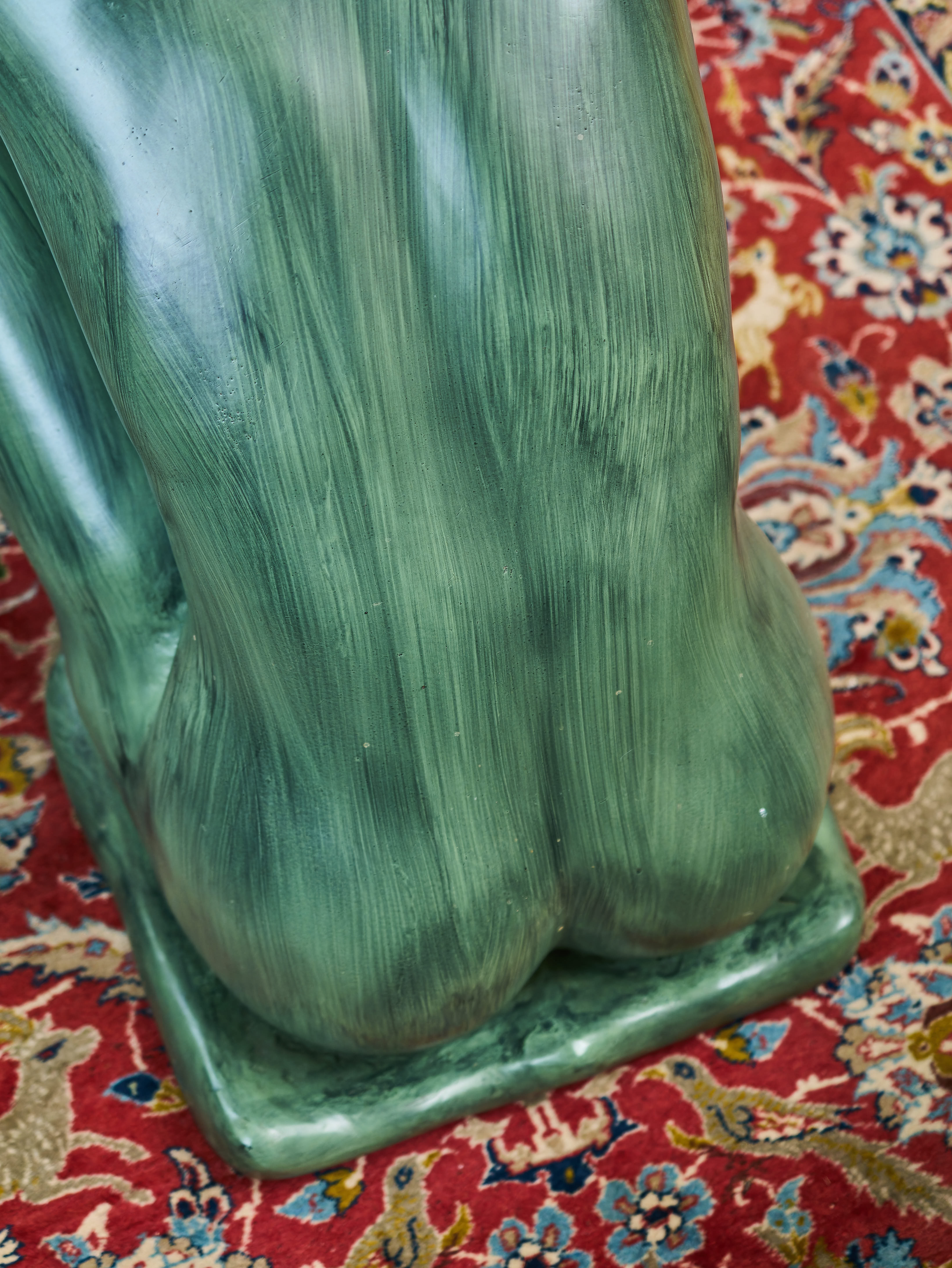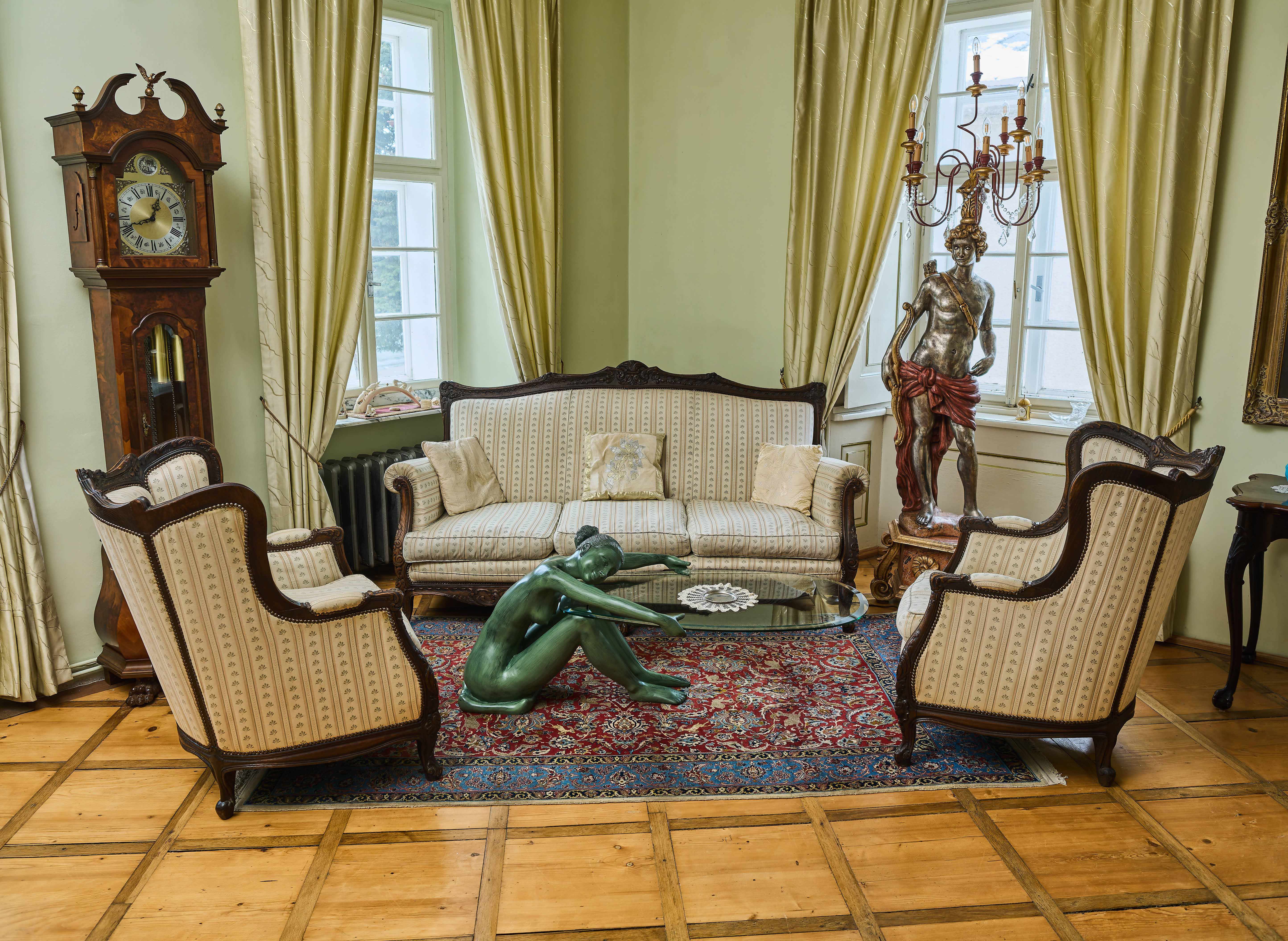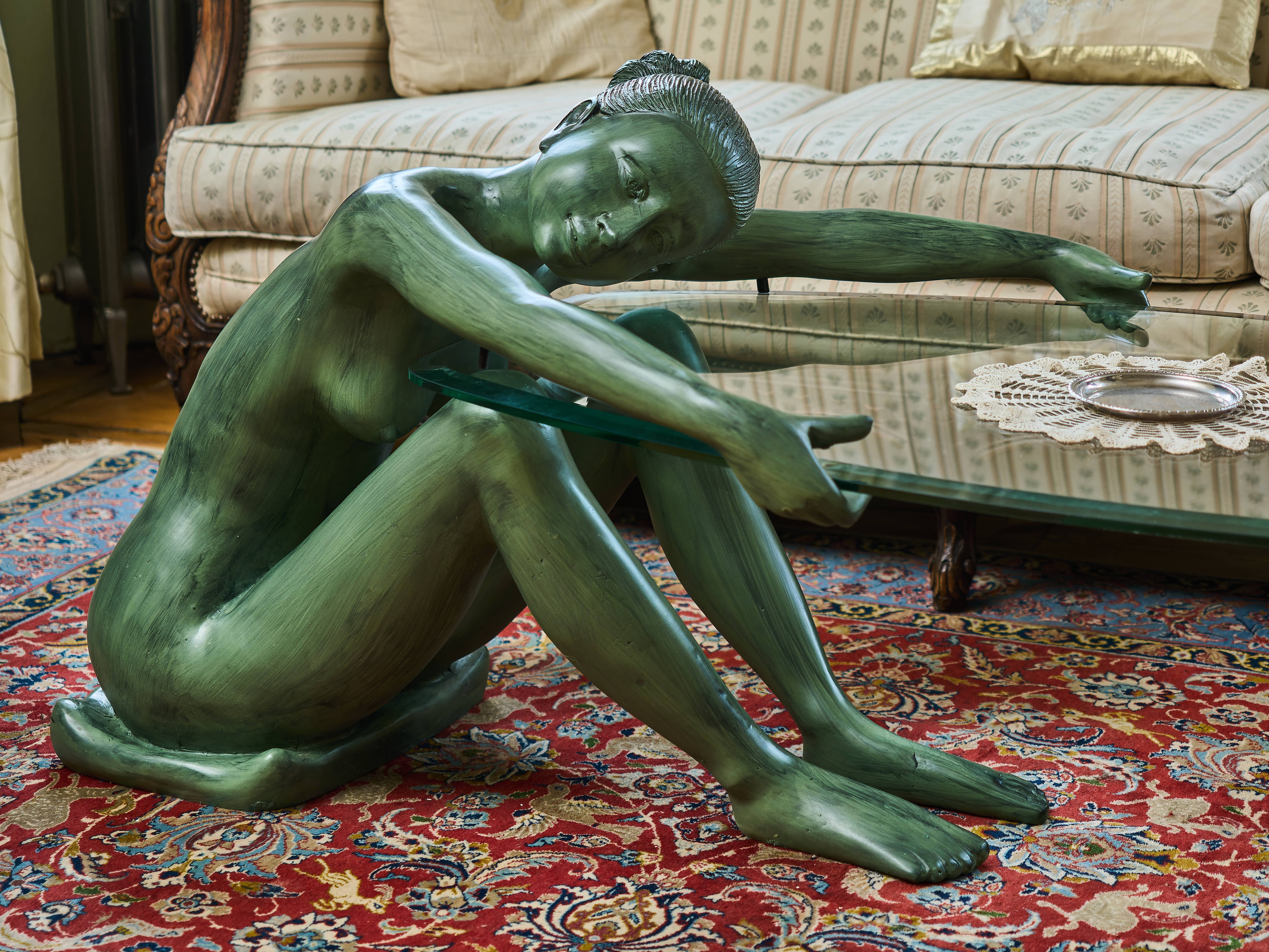 Výjimečný konferenční stolek, který okamžitě upoutá pozornost a stane se dominantním prvkem každého interiéru. Základ stolu tvoří plastika nahé ženy z bronzu, která sedí v uvolněné, téměř meditativní pozici na malém polštáři. Postava natahuje ruce vpřed a podpírá elegantní skleněnou desku stolu, jejíž jemně eliptický tvar přirozeně navazuje na dynamiku celé kompozice.