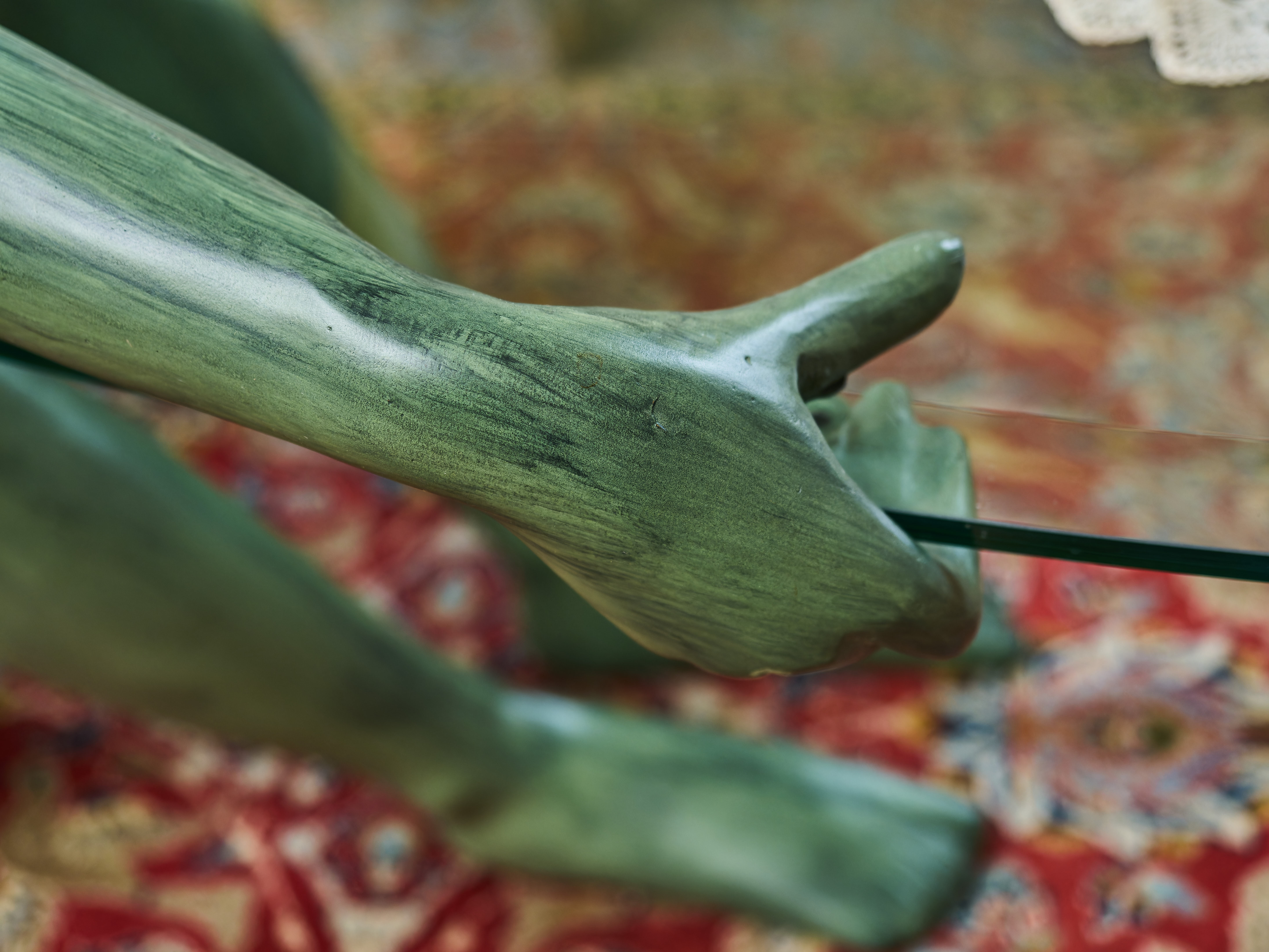 Skleněná deska je nesena konstrukcí, která je elegantně zakomponována do samotné figury, takže celek působí velmi lehce a vyváženě. Díky své výrazné formě se stolek uplatní jak v interiéru zařízeném starožitným nábytkem, tak i v moderním prostoru, kde může fungovat jako výrazný designový akcent.