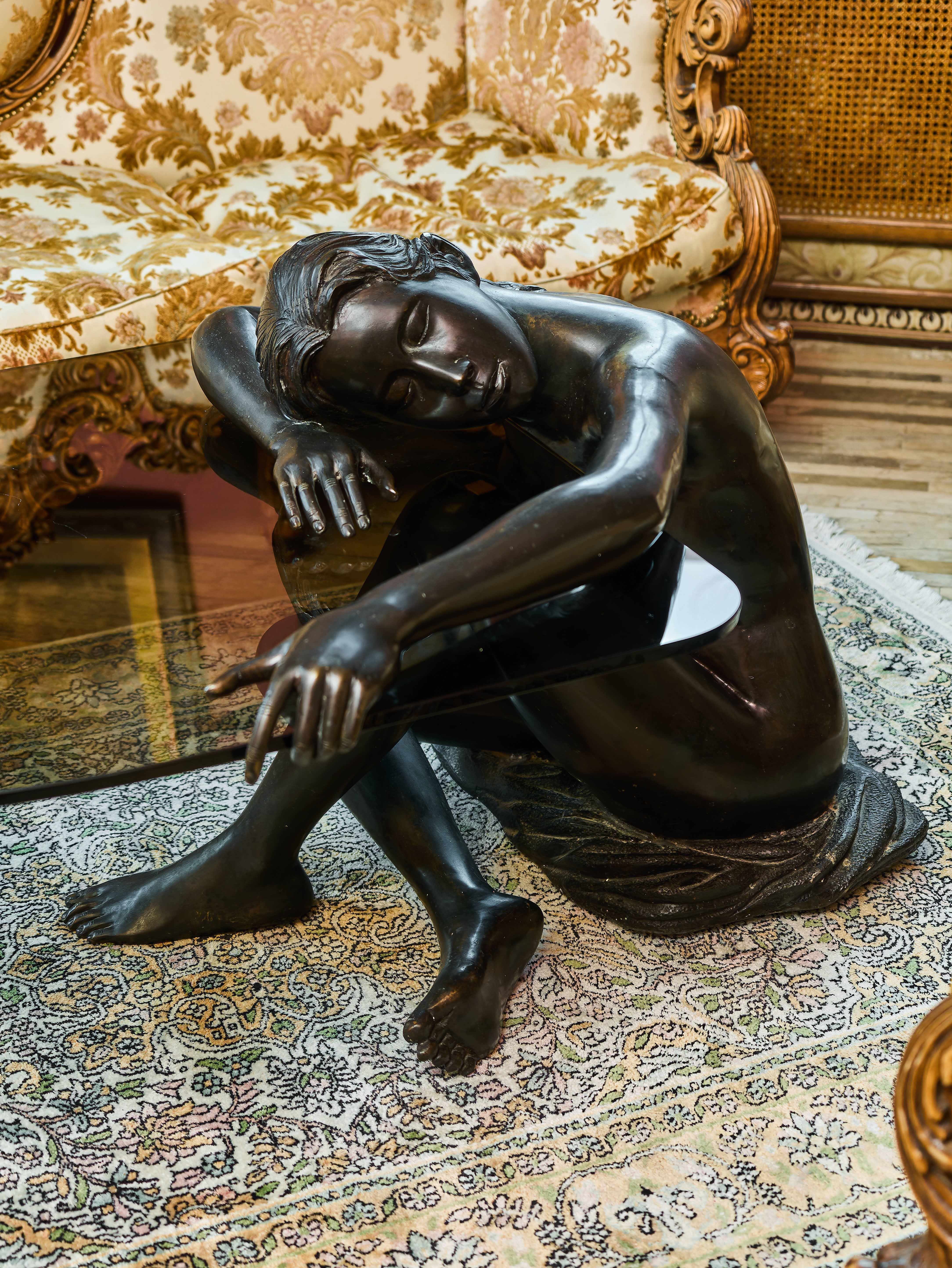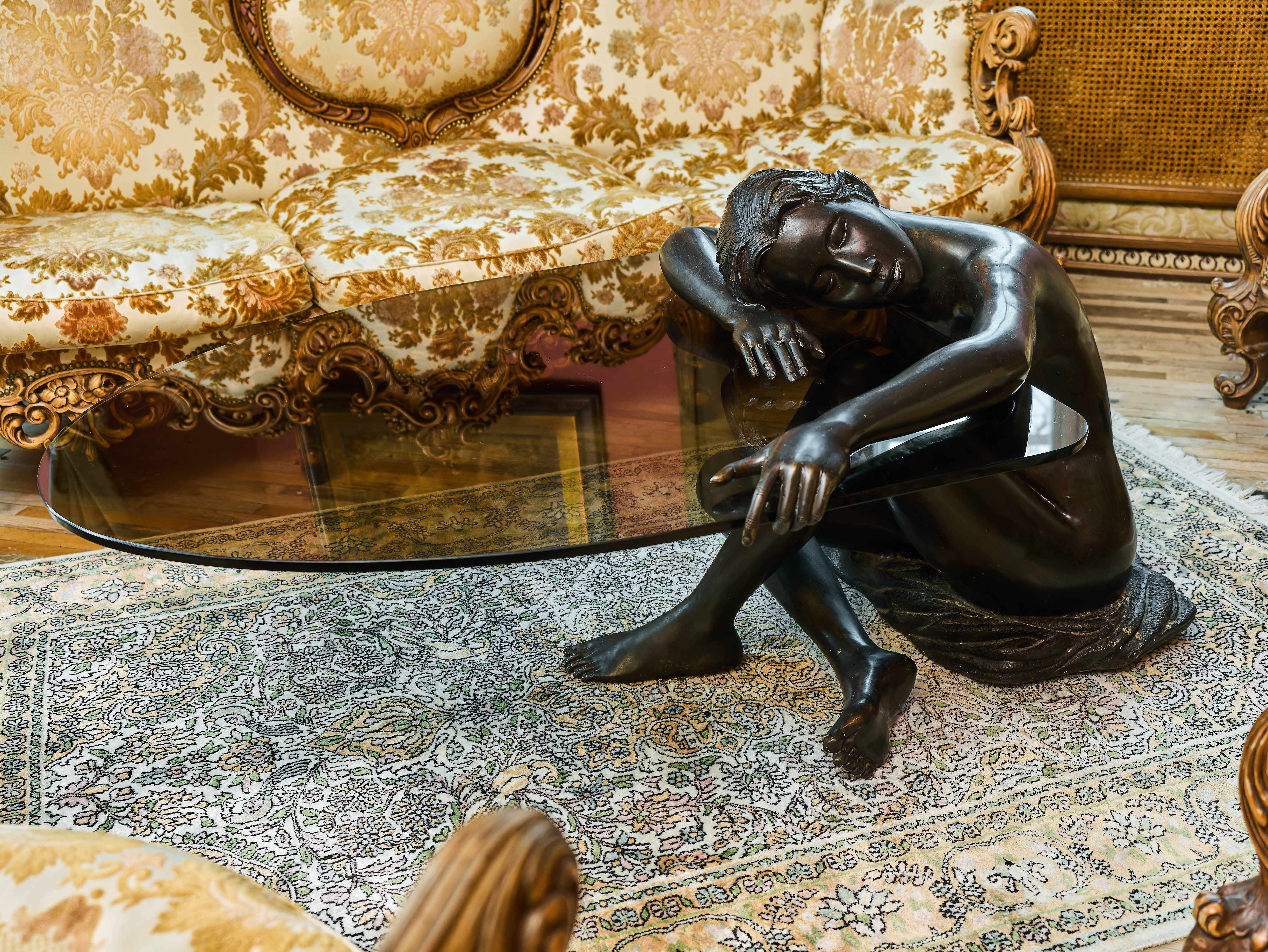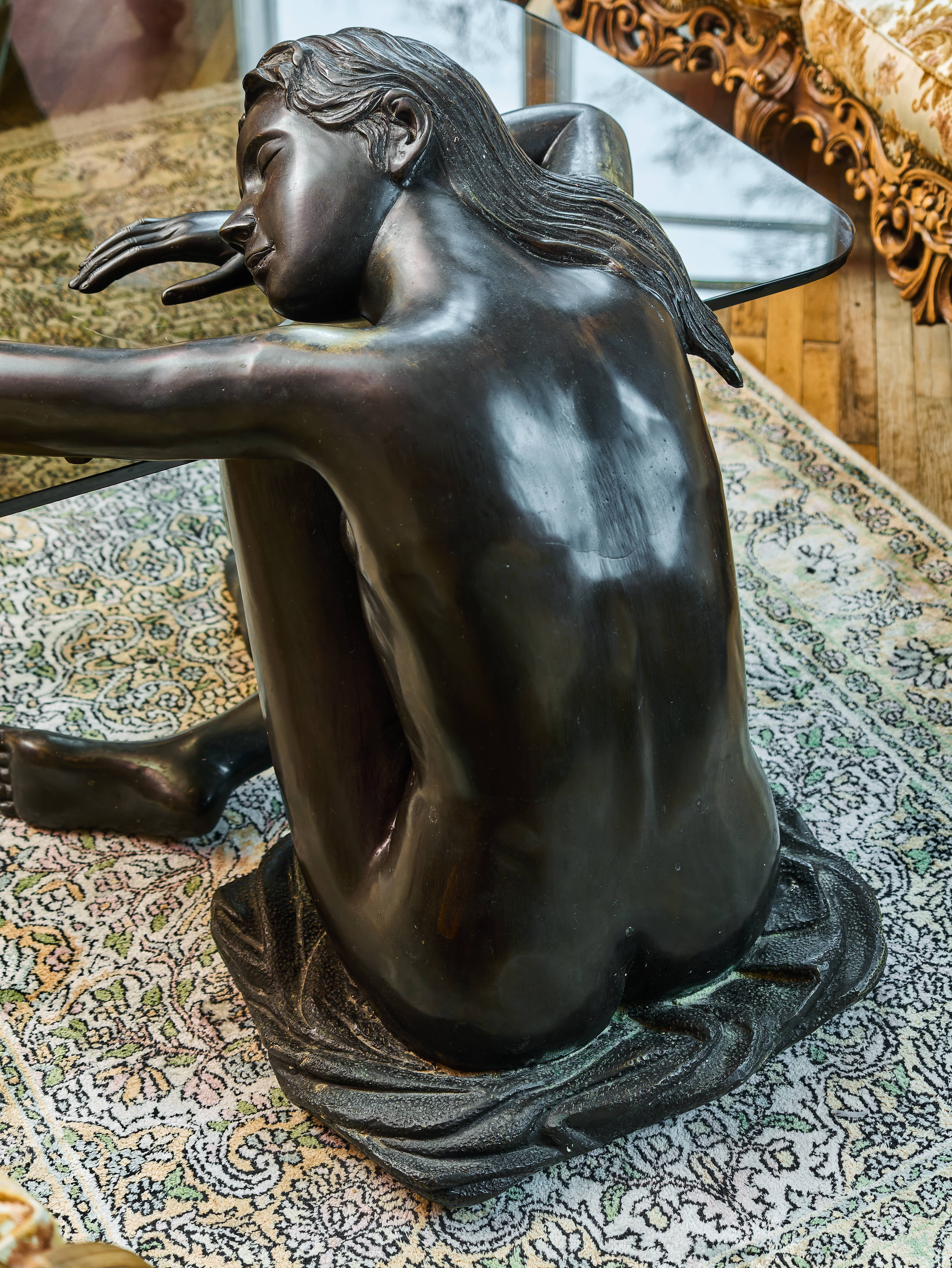 Výjimečný konferenční stolek, který okamžitě upoutá pozornost a stane se dominantním prvkem každého interiéru. Základ stolu tvoří plastika nahé ženy z bronzu, která sedí v uvolněné, téměř meditativní pozici na malém polštáři. Postava natahuje ruce vpřed a podpírá elegantní skleněnou desku stolu, jejíž jemně eliptický tvar přirozeně navazuje na dynamiku celé kompozice.