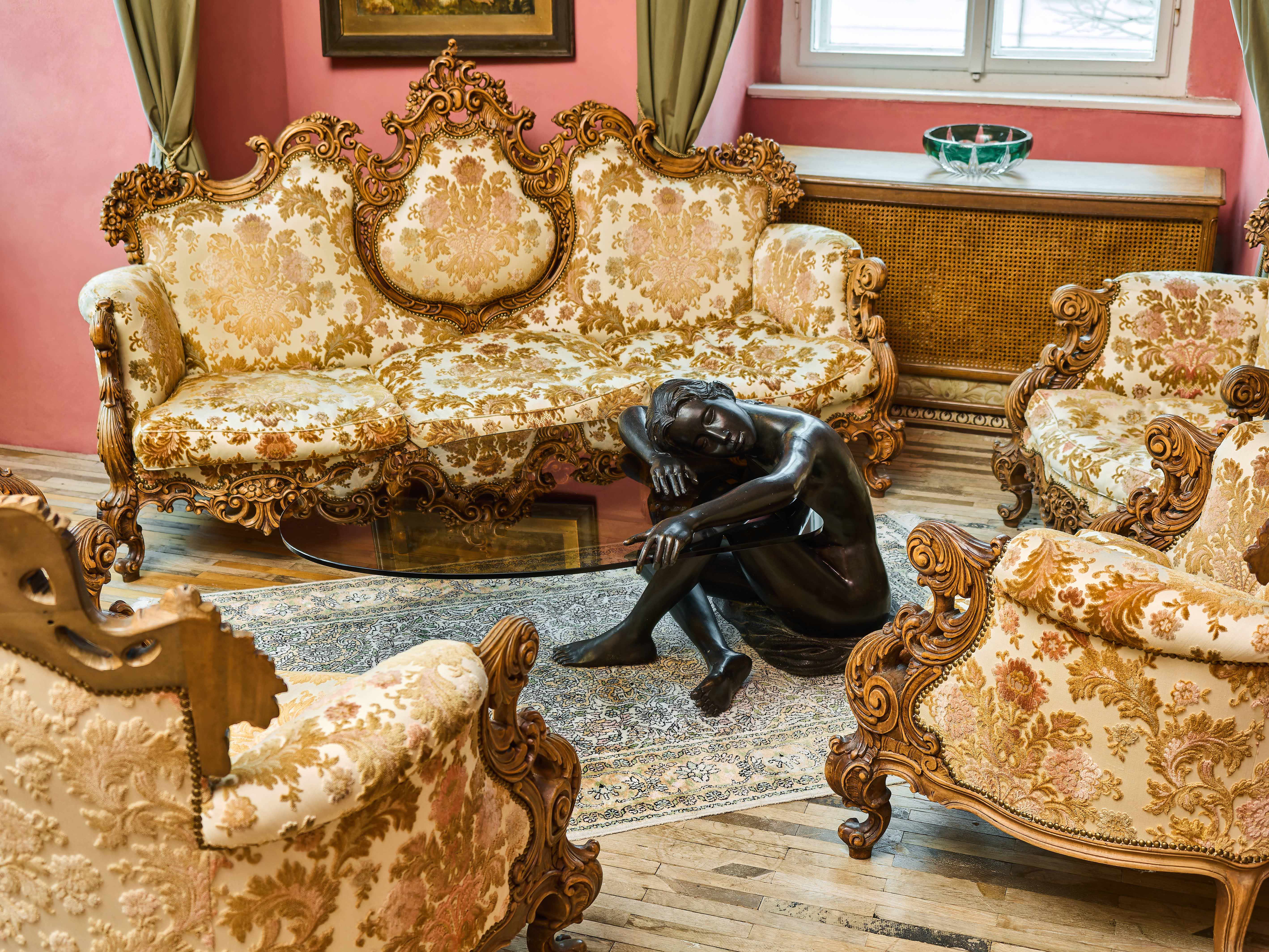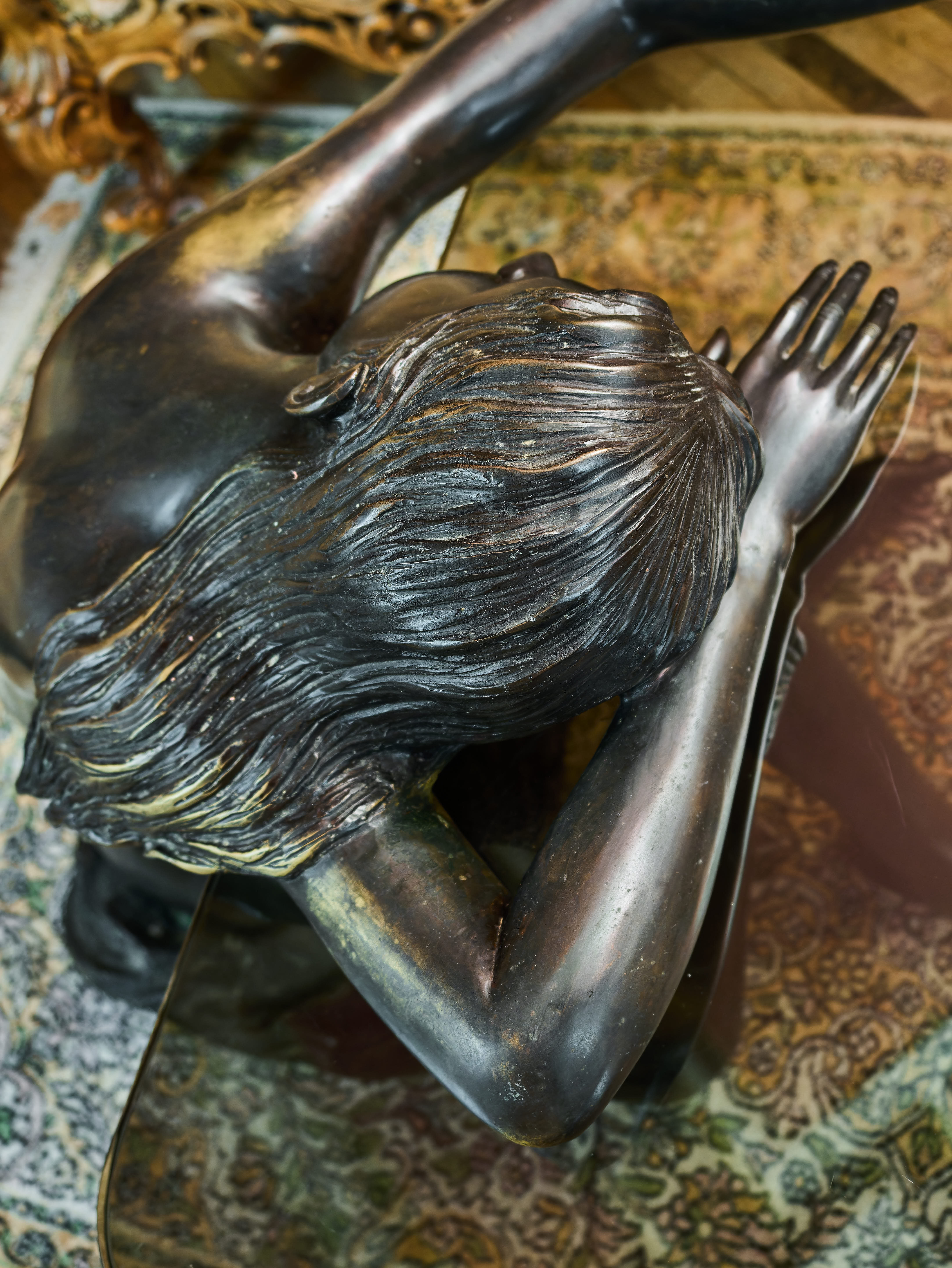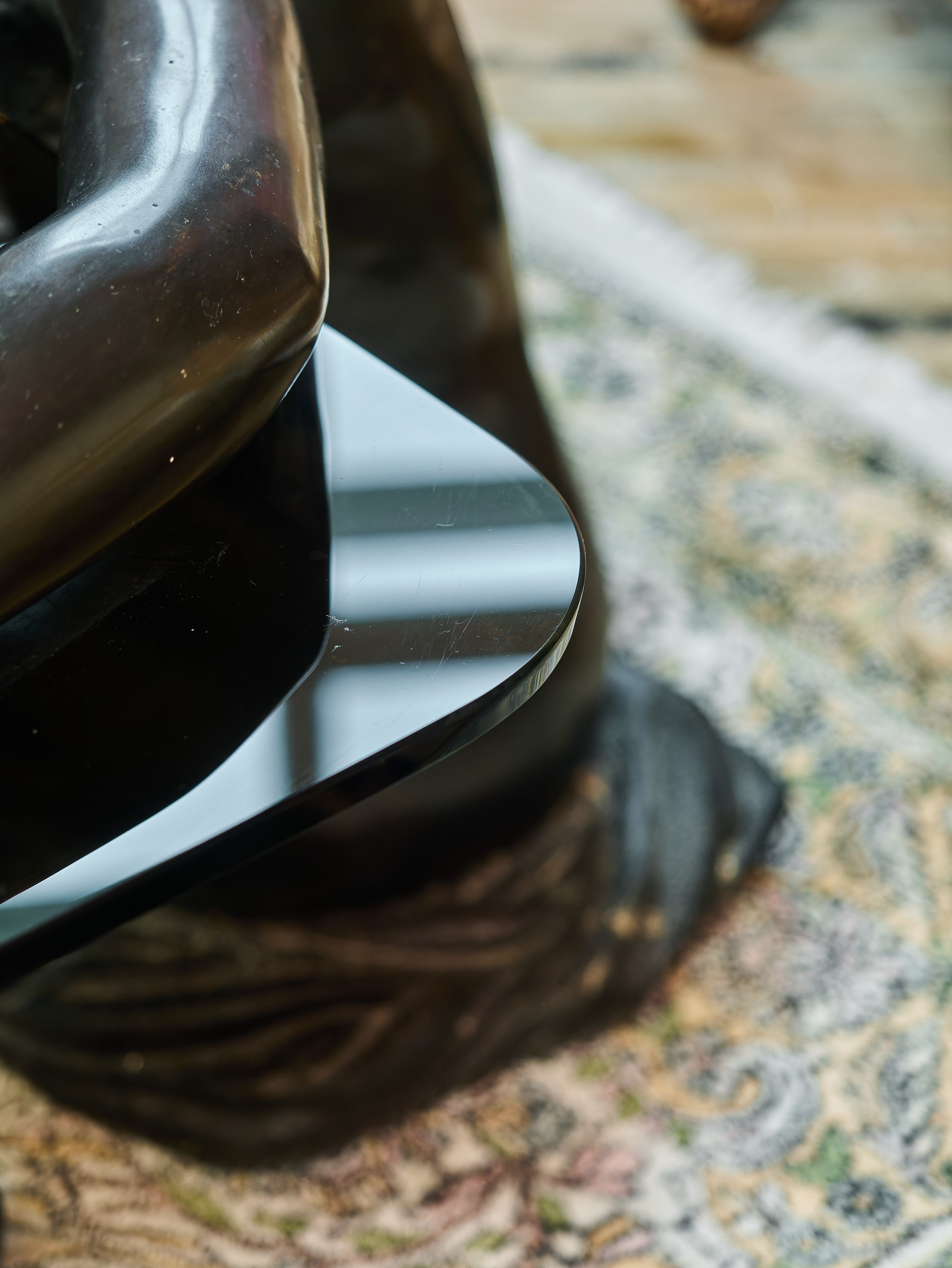Výjimečný konferenční stolek, který okamžitě upoutá pozornost a stane se dominantním prvkem každého interiéru. Základ stolu tvoří plastika nahé ženy z bronzu, která sedí v uvolněné, téměř meditativní pozici na malém polštáři. Postava natahuje ruce vpřed a podpírá elegantní skleněnou desku stolu, jejíž jemně eliptický tvar přirozeně navazuje na dynamiku celé kompozice.