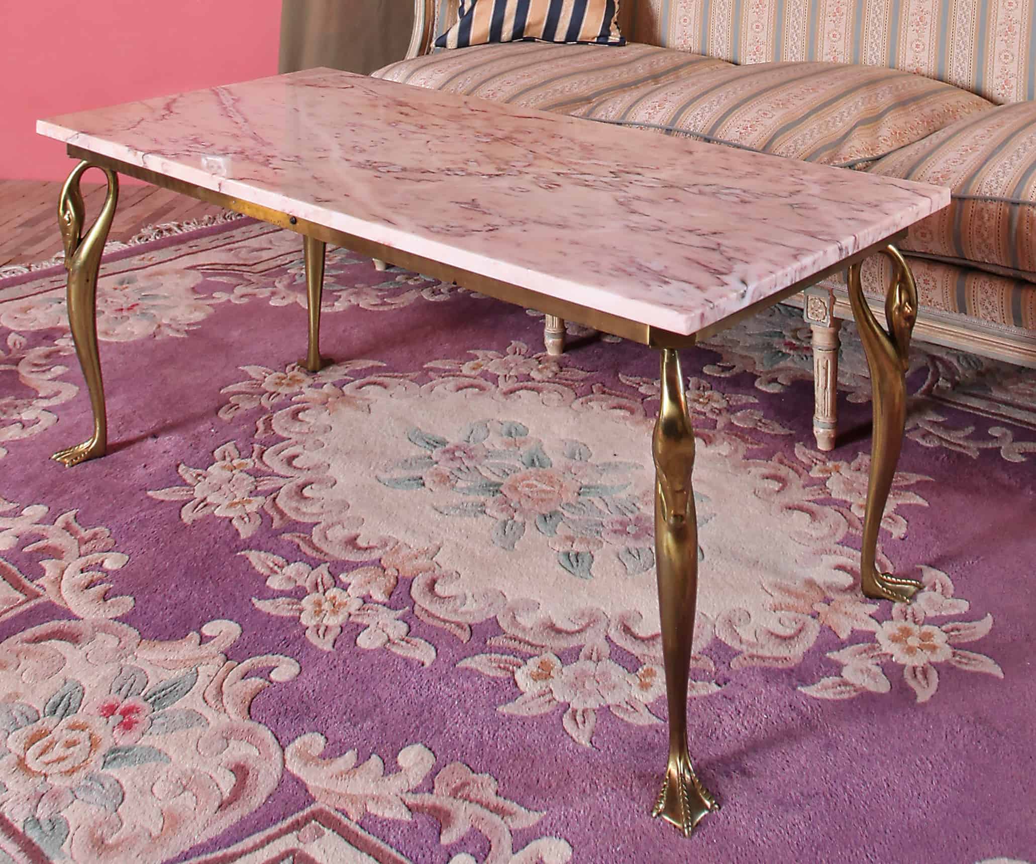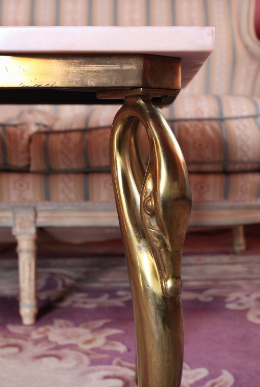 Starožitný konferenční stolek se silnou mramorovou deskou a podnožím s labutěmi. Vrchní mramorová deska je nově vyleštěná. Stav: výborný, po částečném restaurování, pevný. Datace: polovina minulého století. Provenience: Evropa.