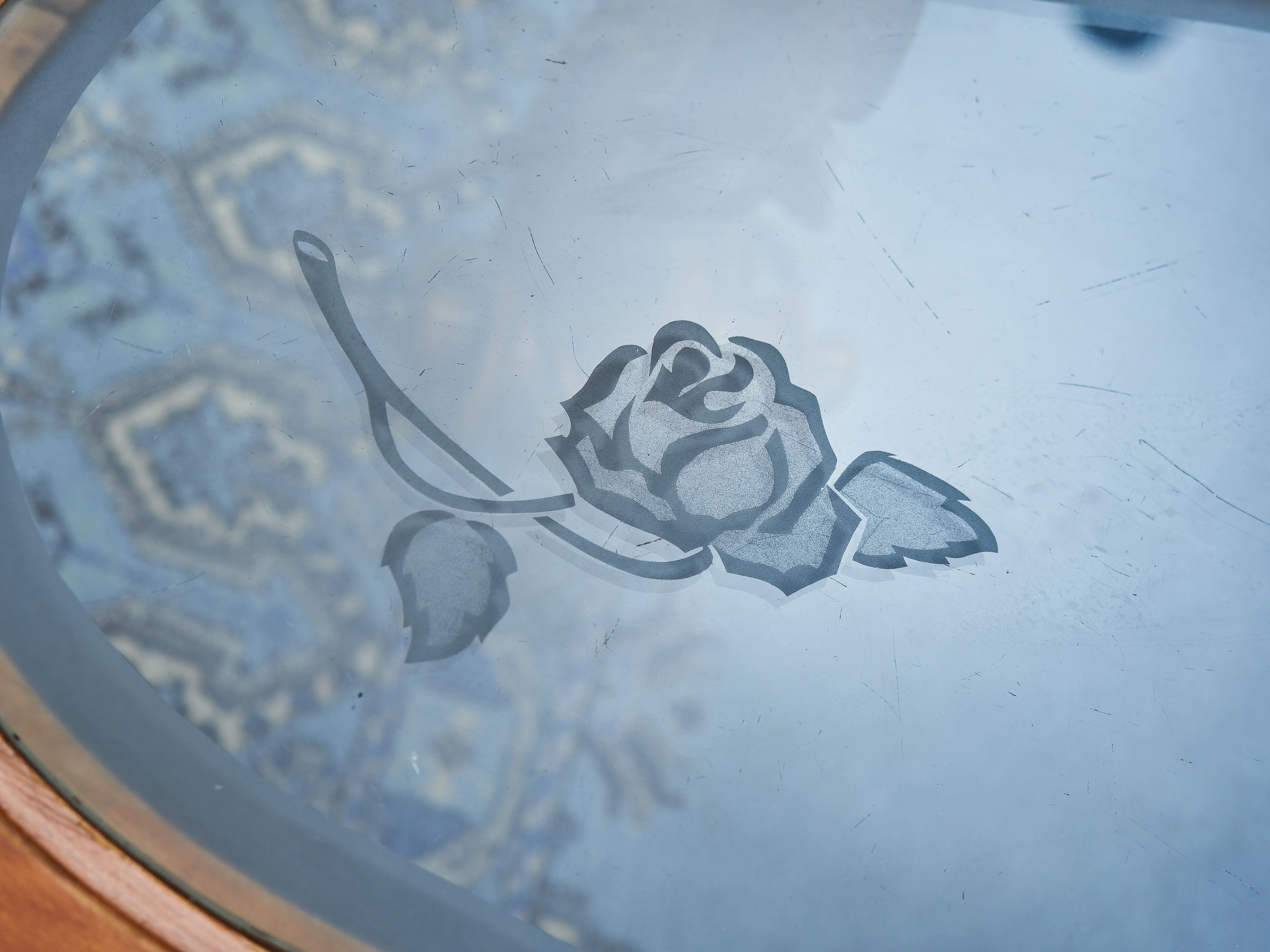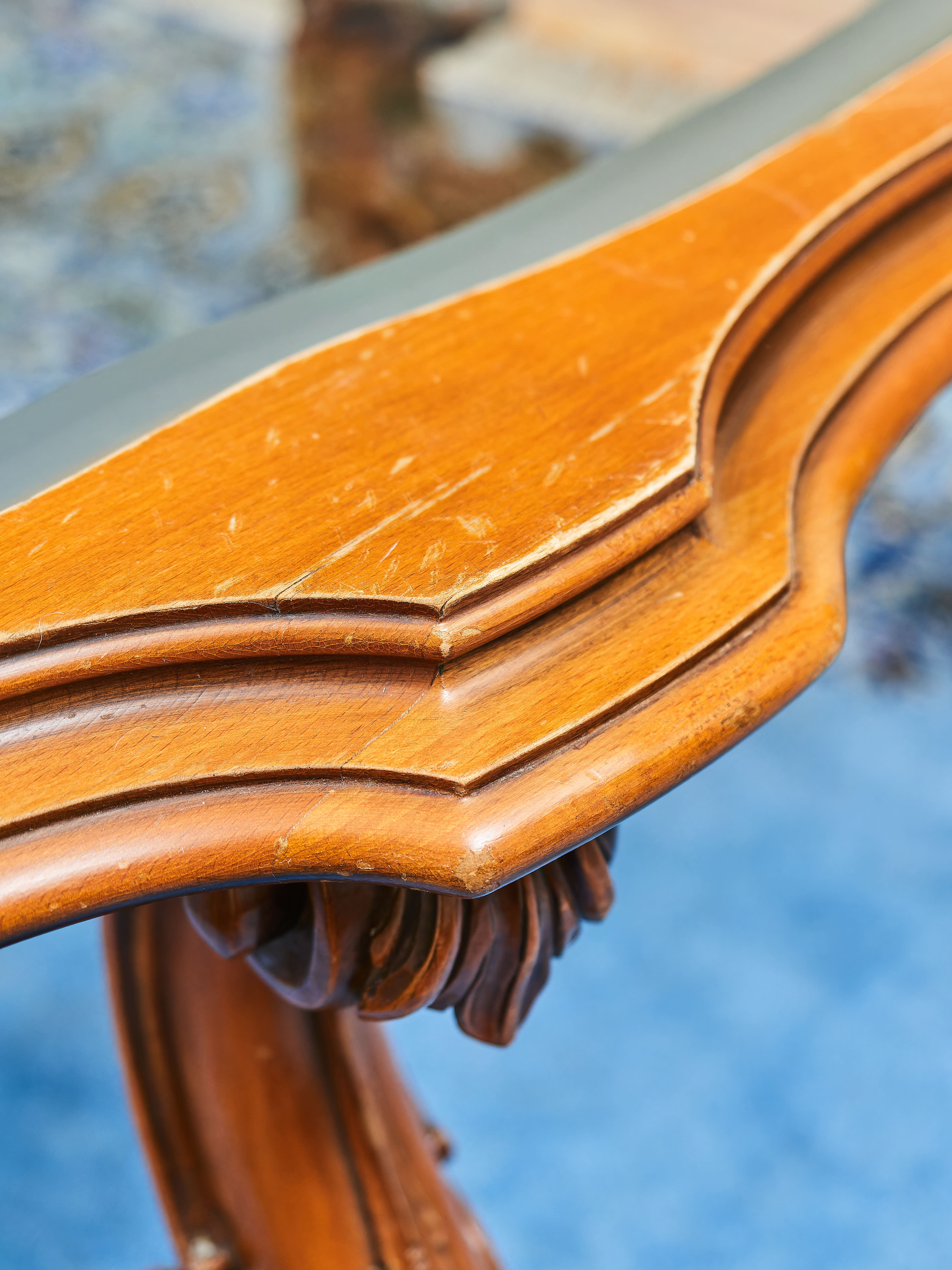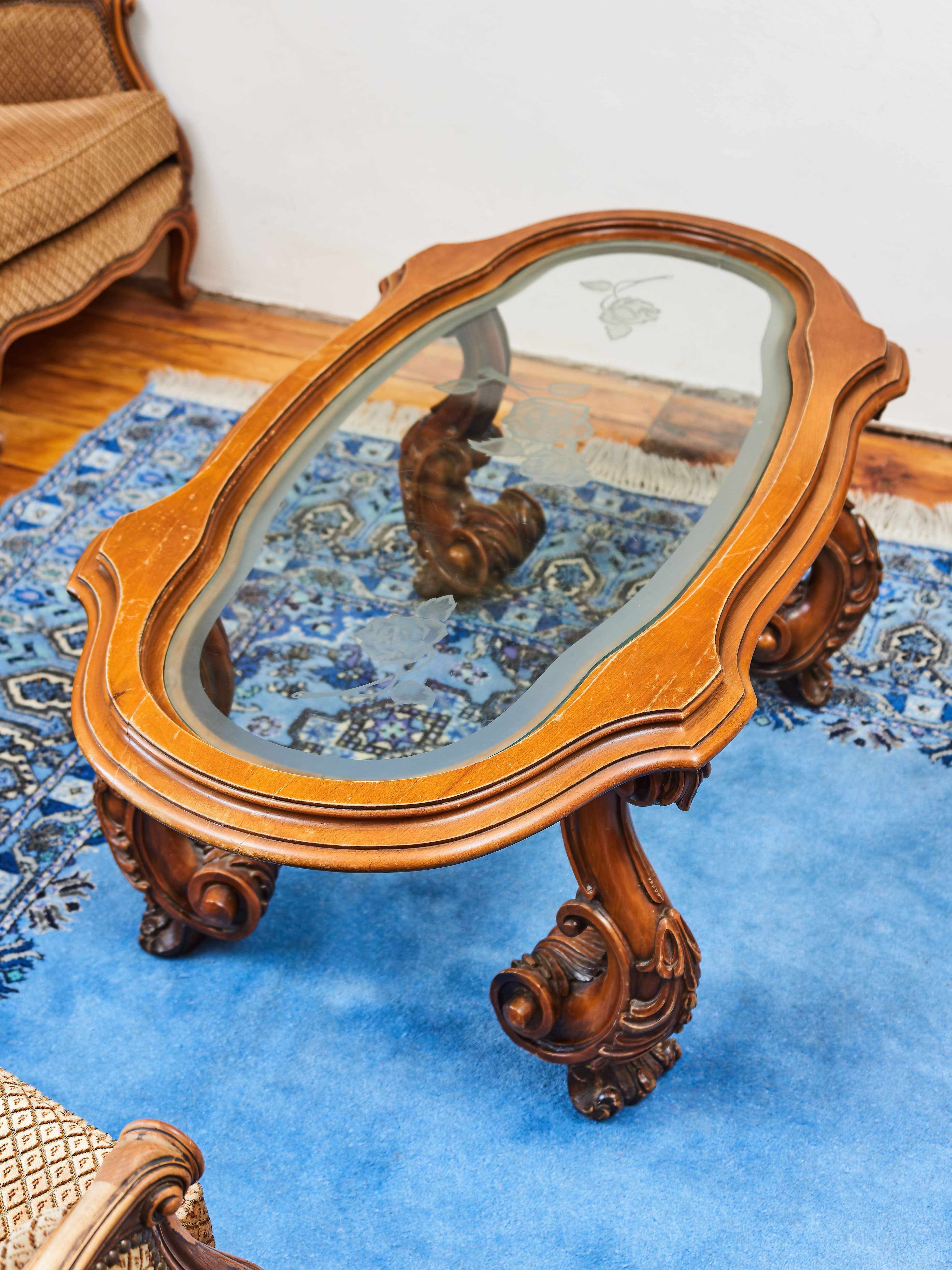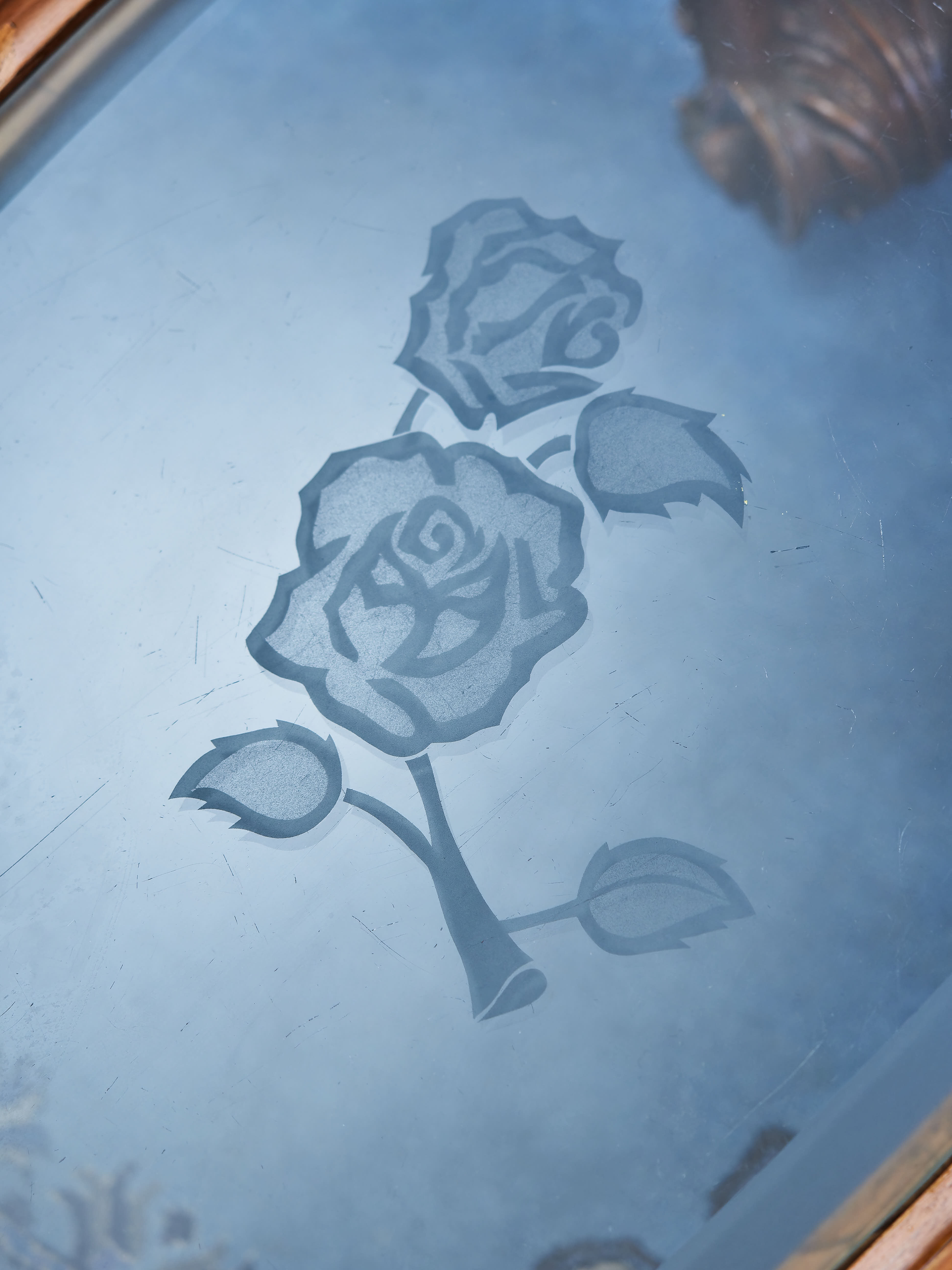 Vrchní deska je z čirého skla, které je vsazené do dřevěného rámu s profilovaným okrajem. Sklo je zdobeno pískovaným květinovým motivem růží, který podtrhuje romantický charakter stolku a přidává jemný dekorativní prvek. Skleněná deska umožňuje vyniknout bohatě vyřezávanému podnoží a dodává celému kusu vzdušnost.