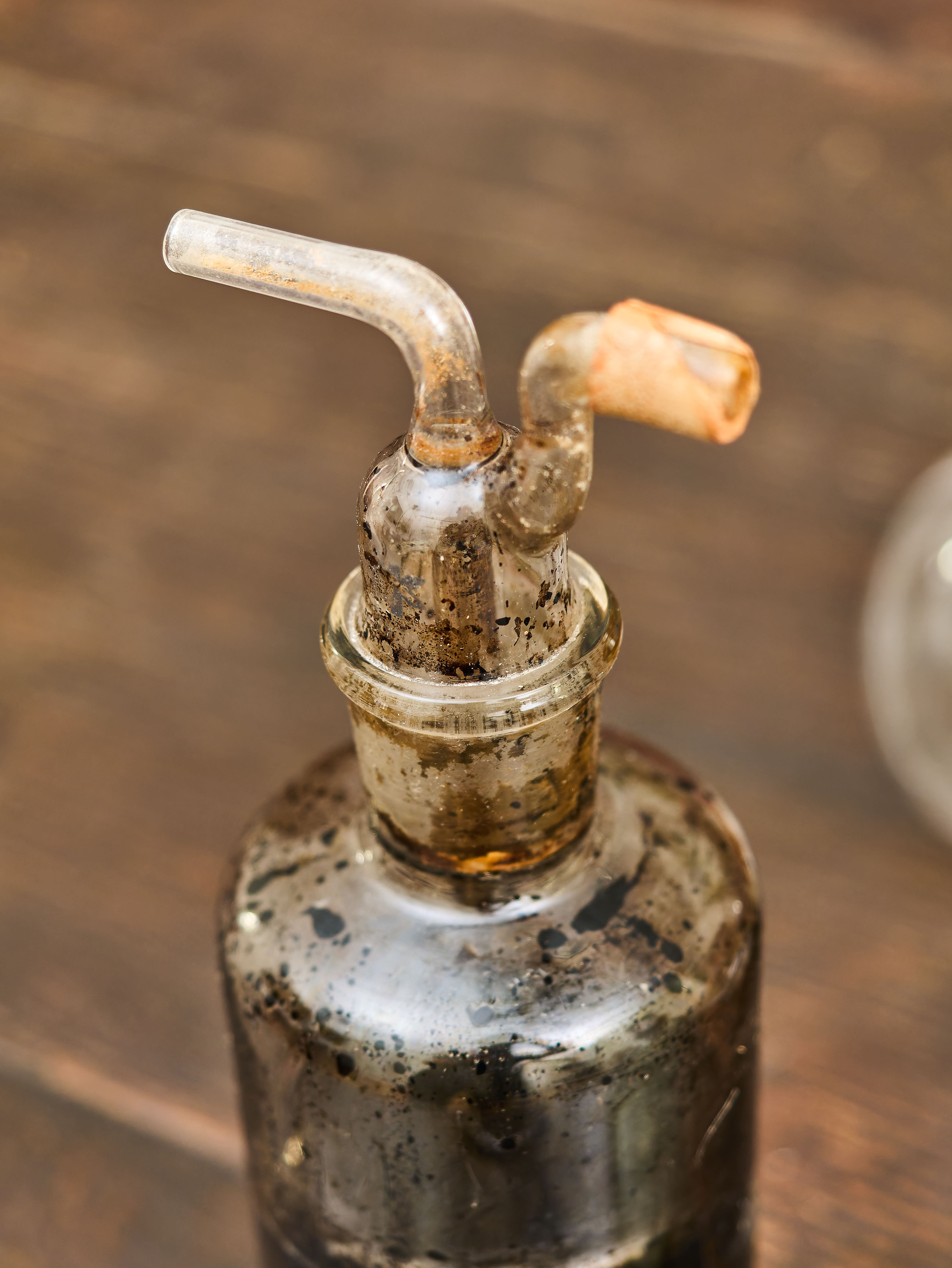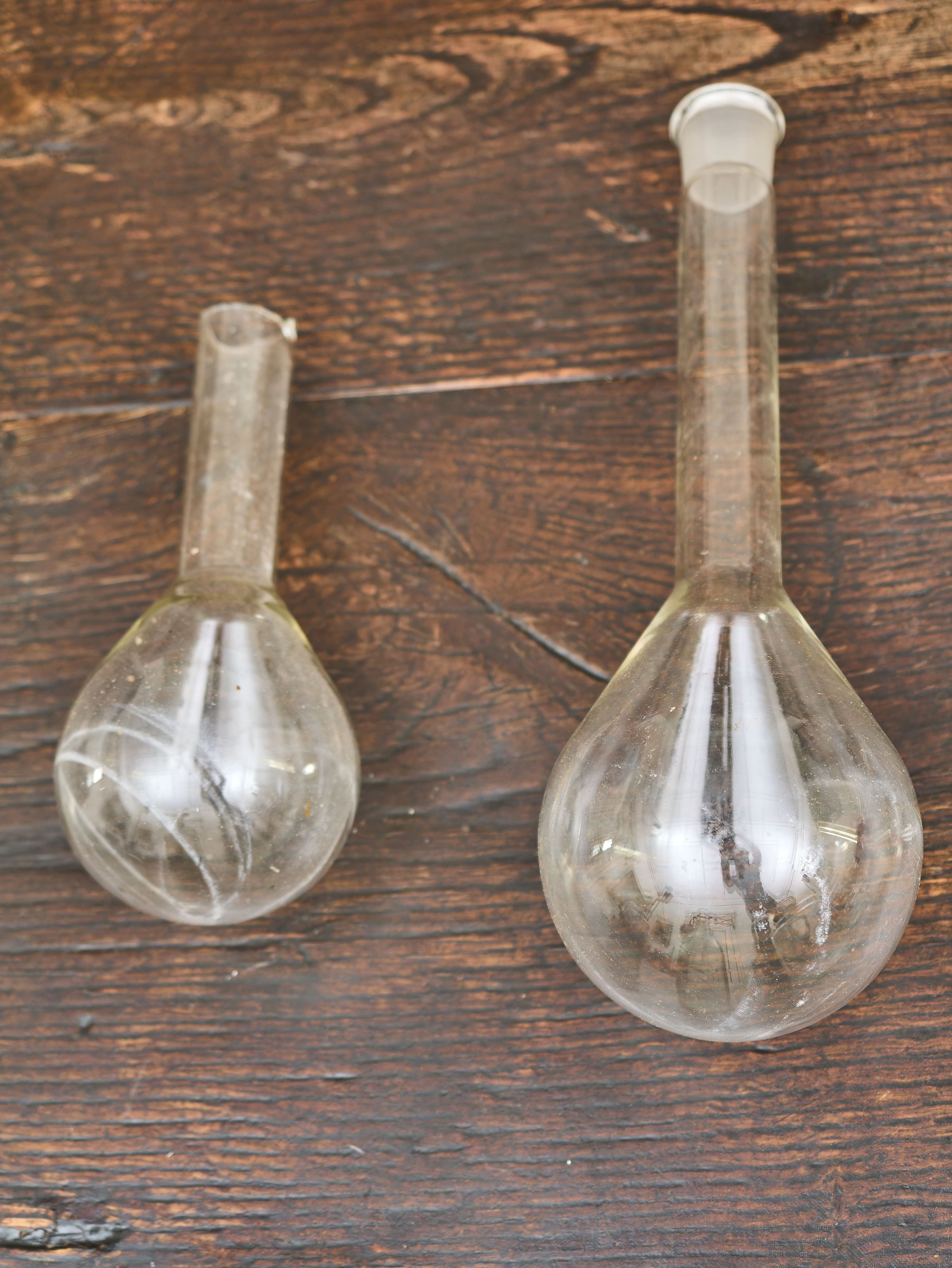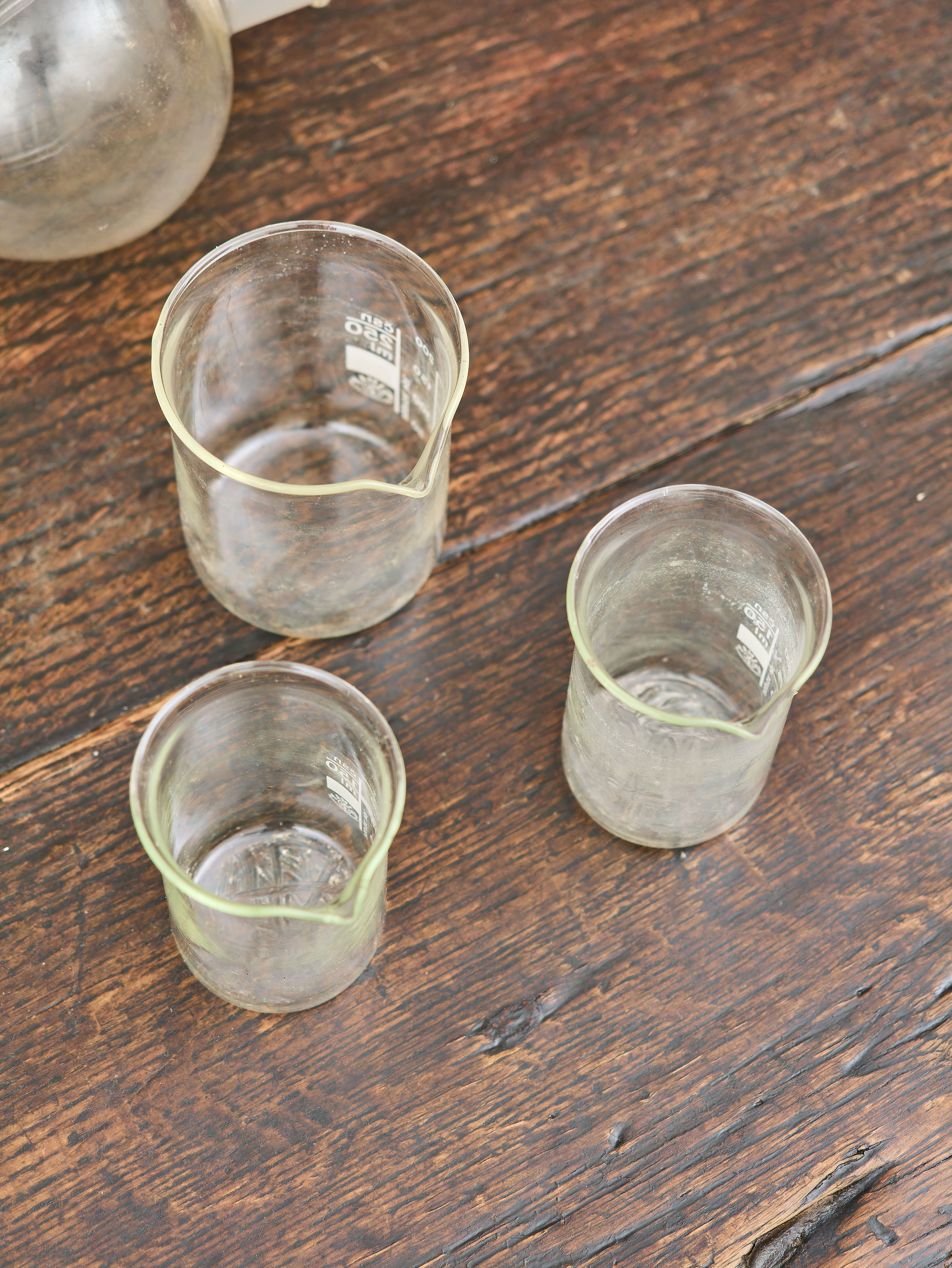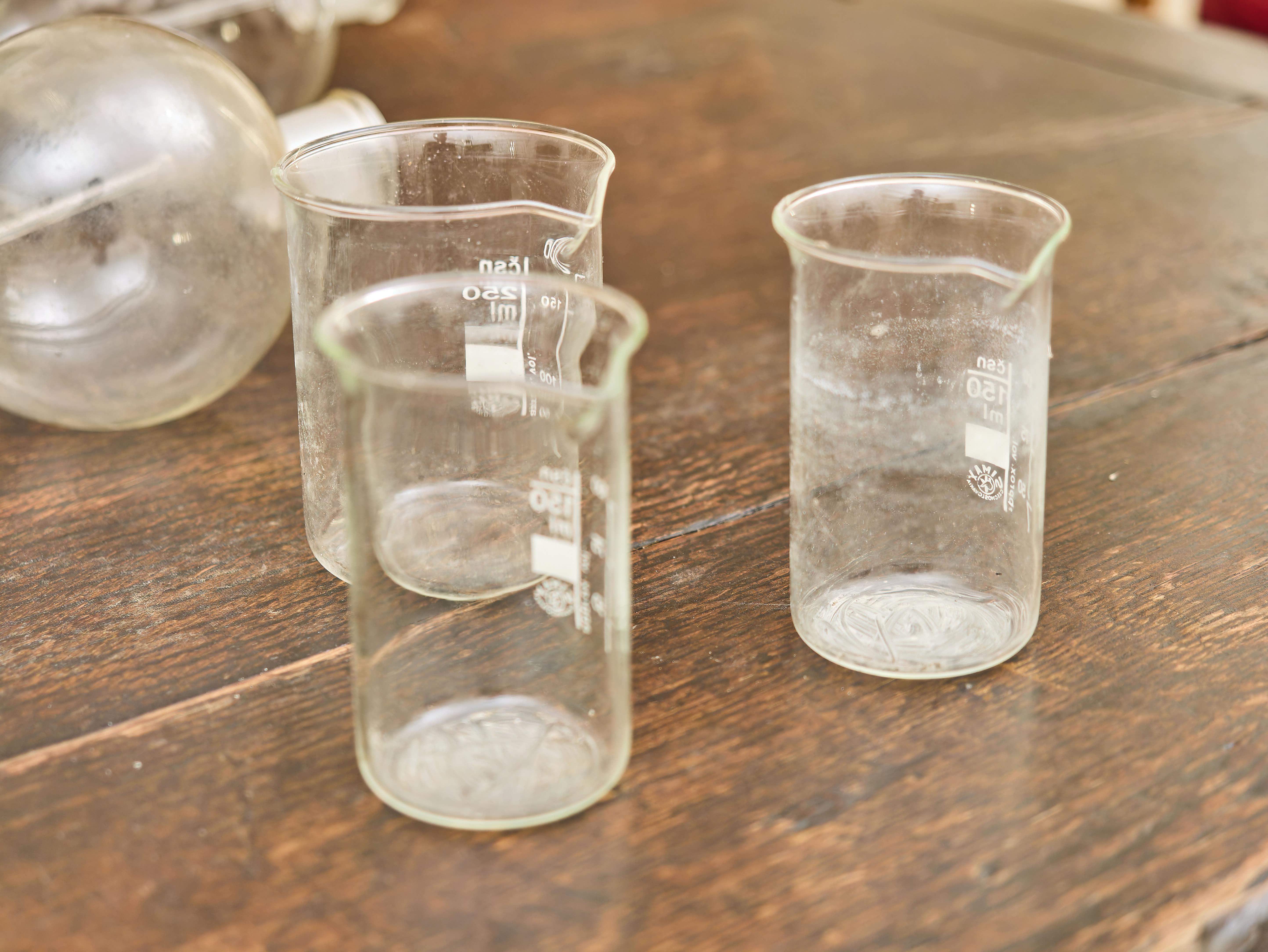 Rozsáhlý soubor starého laboratorního skla pocházející z chemické laboratoře, vhodný pro sběratele, dekoratéry nebo milovníky vědeckých předmětů. Součástí konvolutu jsou různé druhy skleněného vybavení – kulaté baňky, odměrné válce, destilační trubice s kohouty, laboratorní lahve, baňky s postranní trubicí, kádinky s výlevkou a další pomůcky používané při chemických experimentech a destilacích.