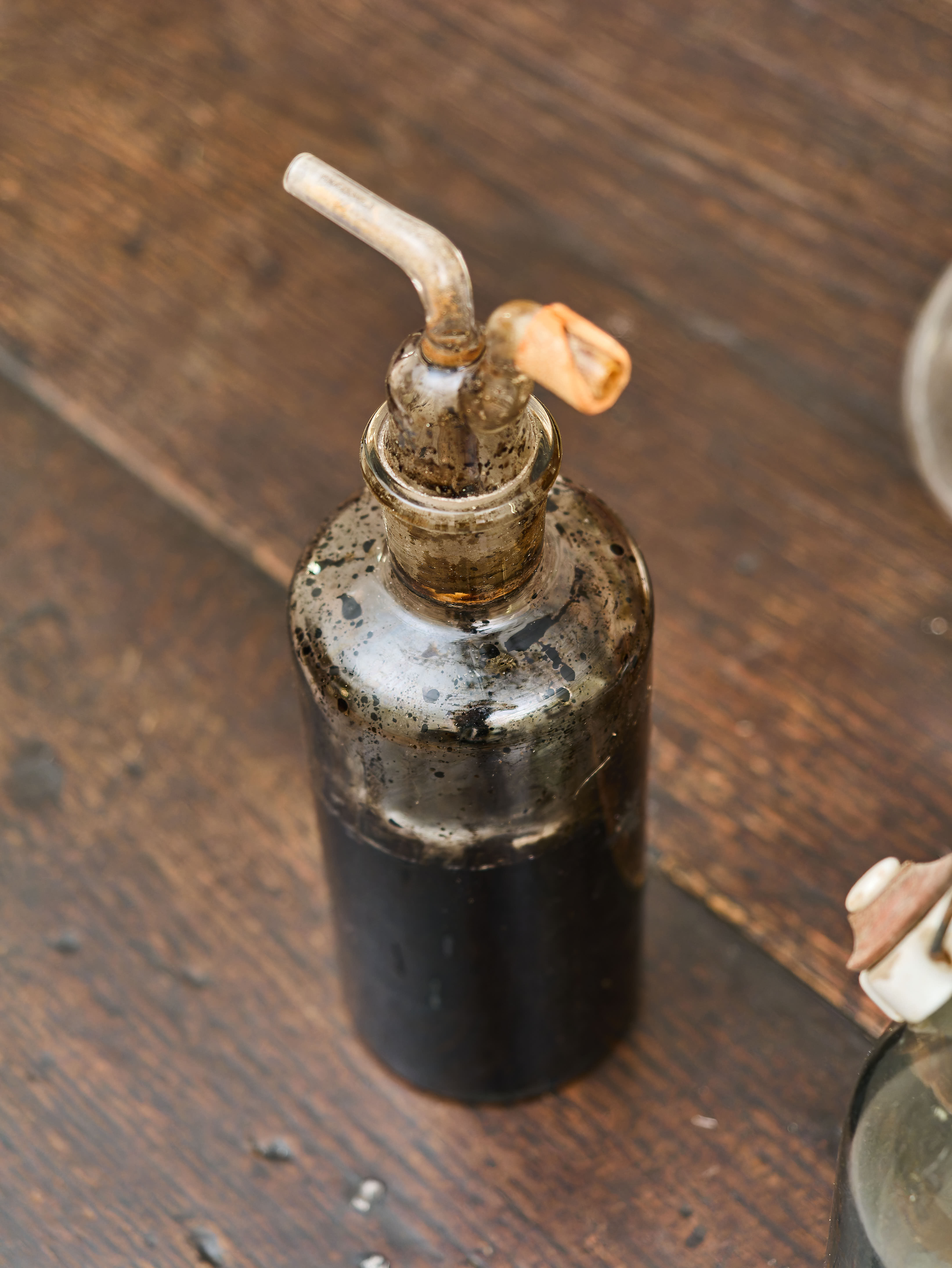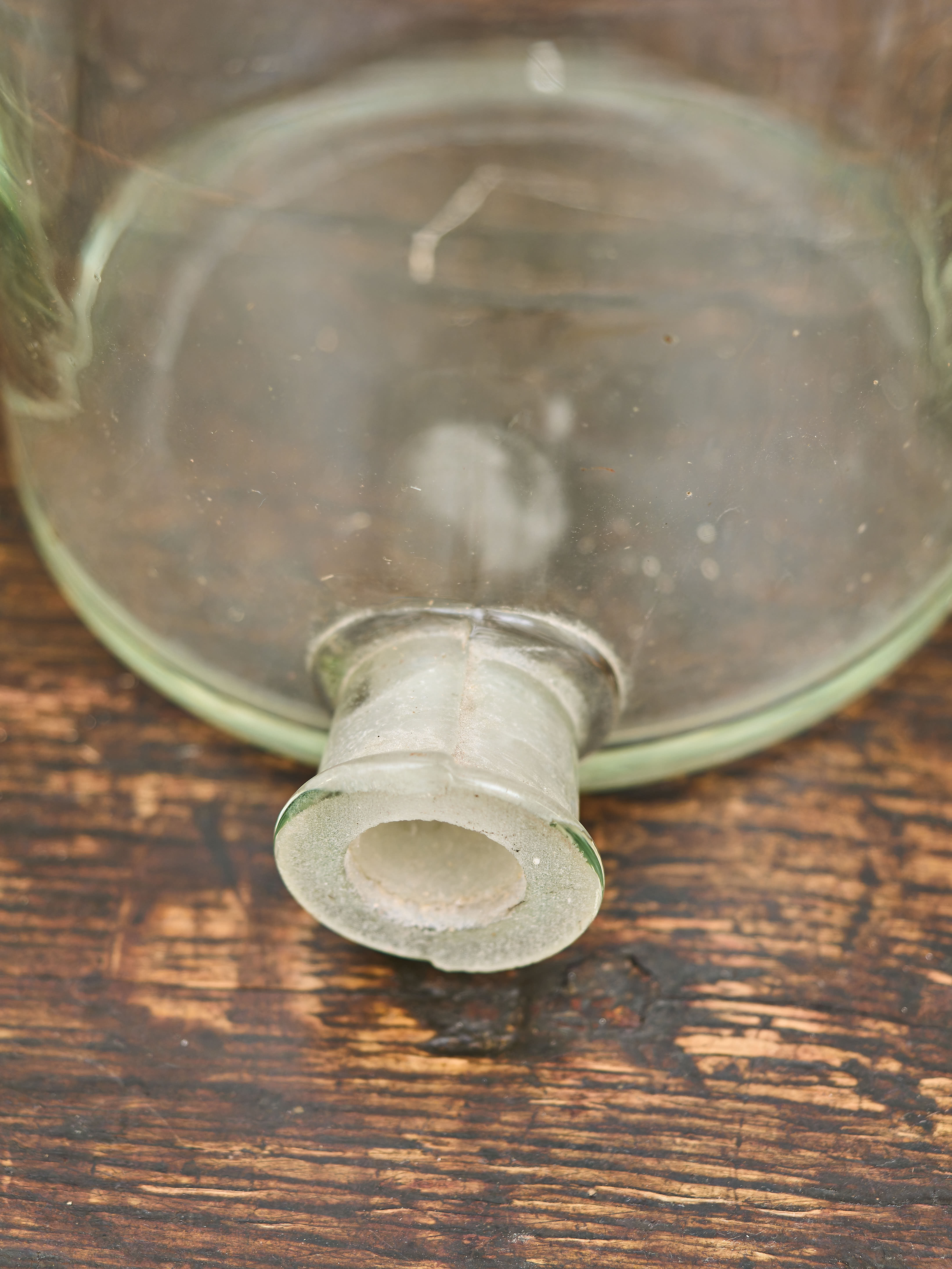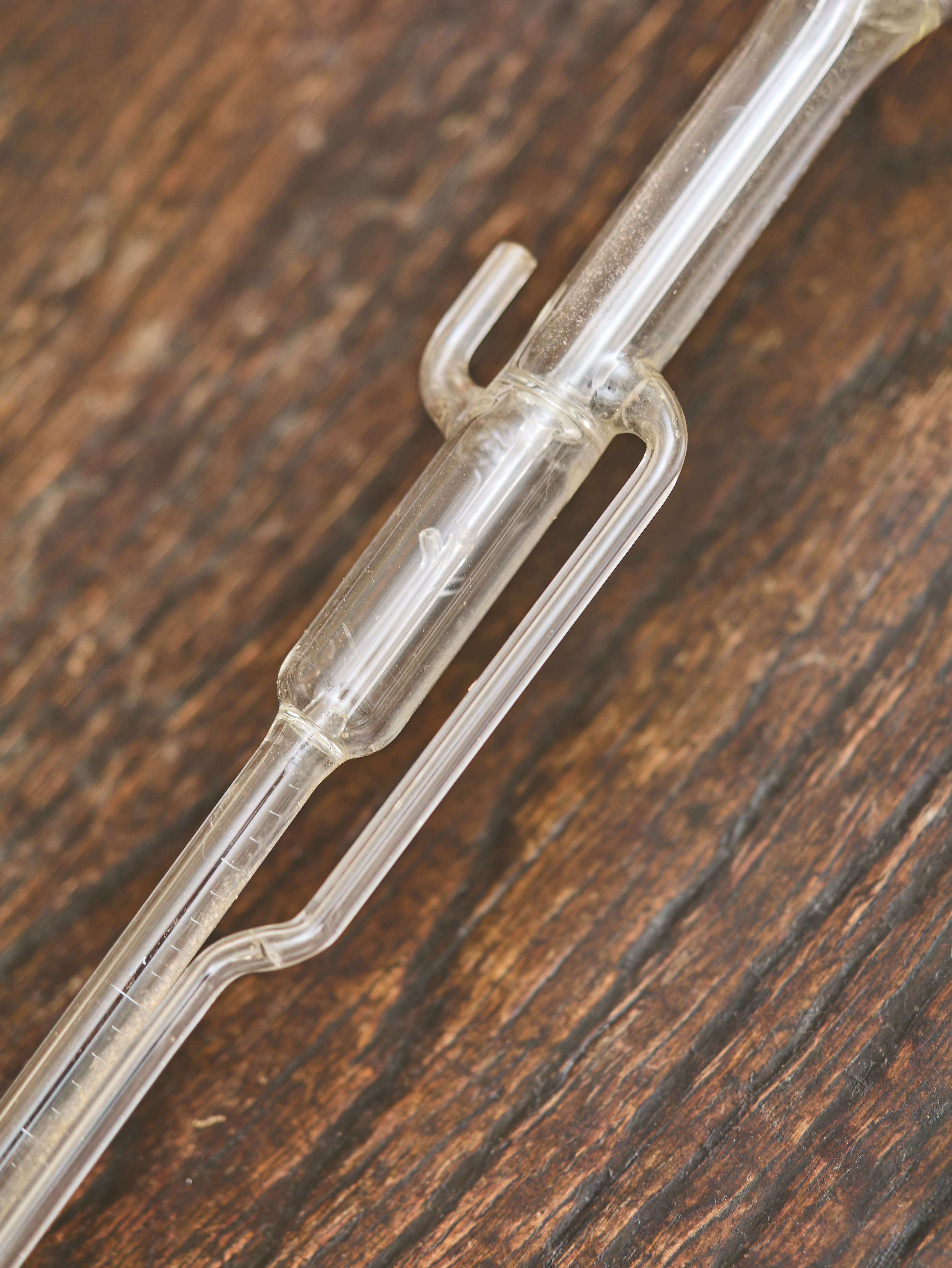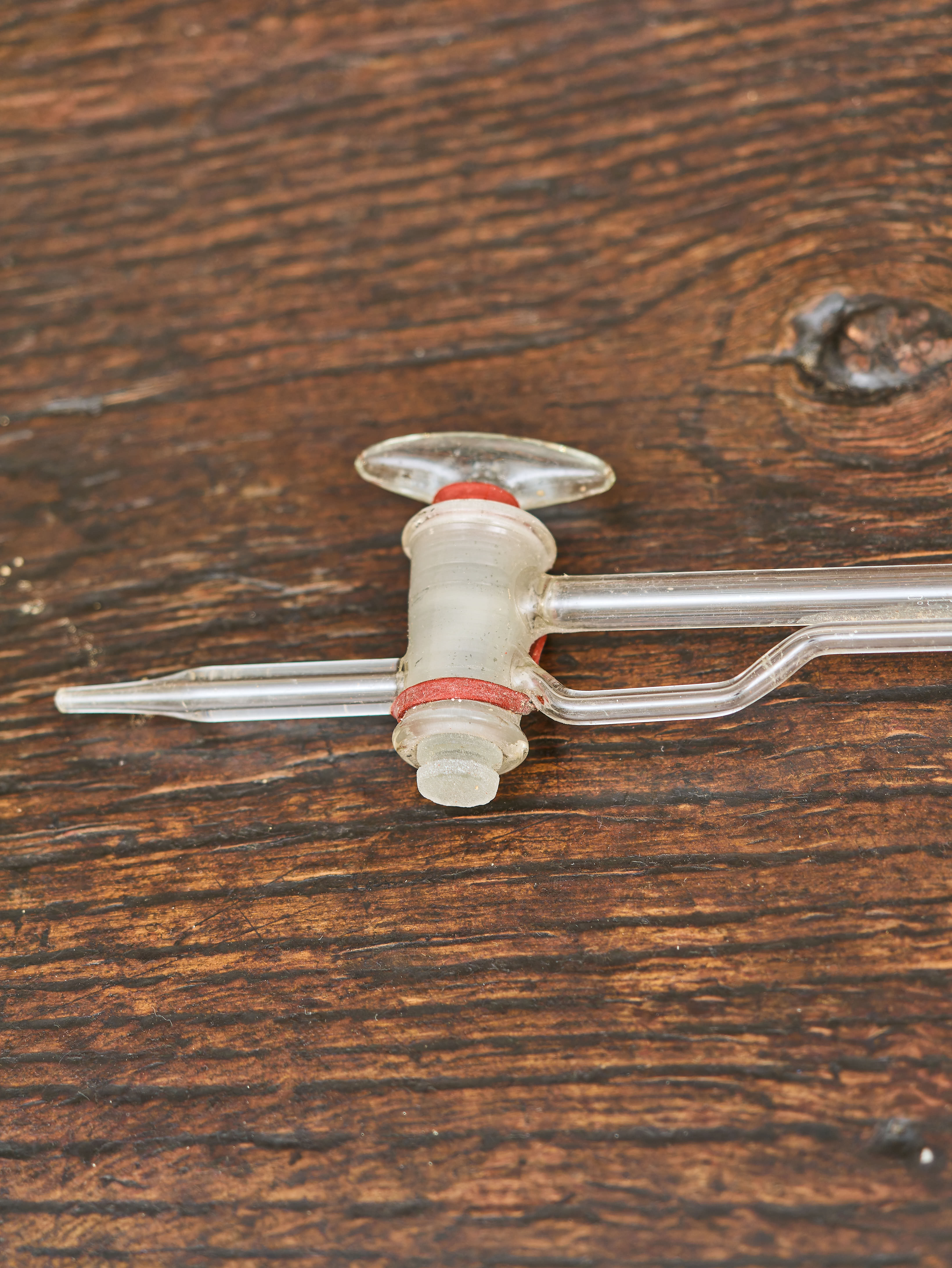 Rozsáhlý soubor starého laboratorního skla pocházející z chemické laboratoře, vhodný pro sběratele, dekoratéry nebo milovníky vědeckých předmětů. Součástí konvolutu jsou různé druhy skleněného vybavení – kulaté baňky, odměrné válce, destilační trubice s kohouty, laboratorní lahve, baňky s postranní trubicí, kádinky s výlevkou a další pomůcky používané při chemických experimentech a destilacích.