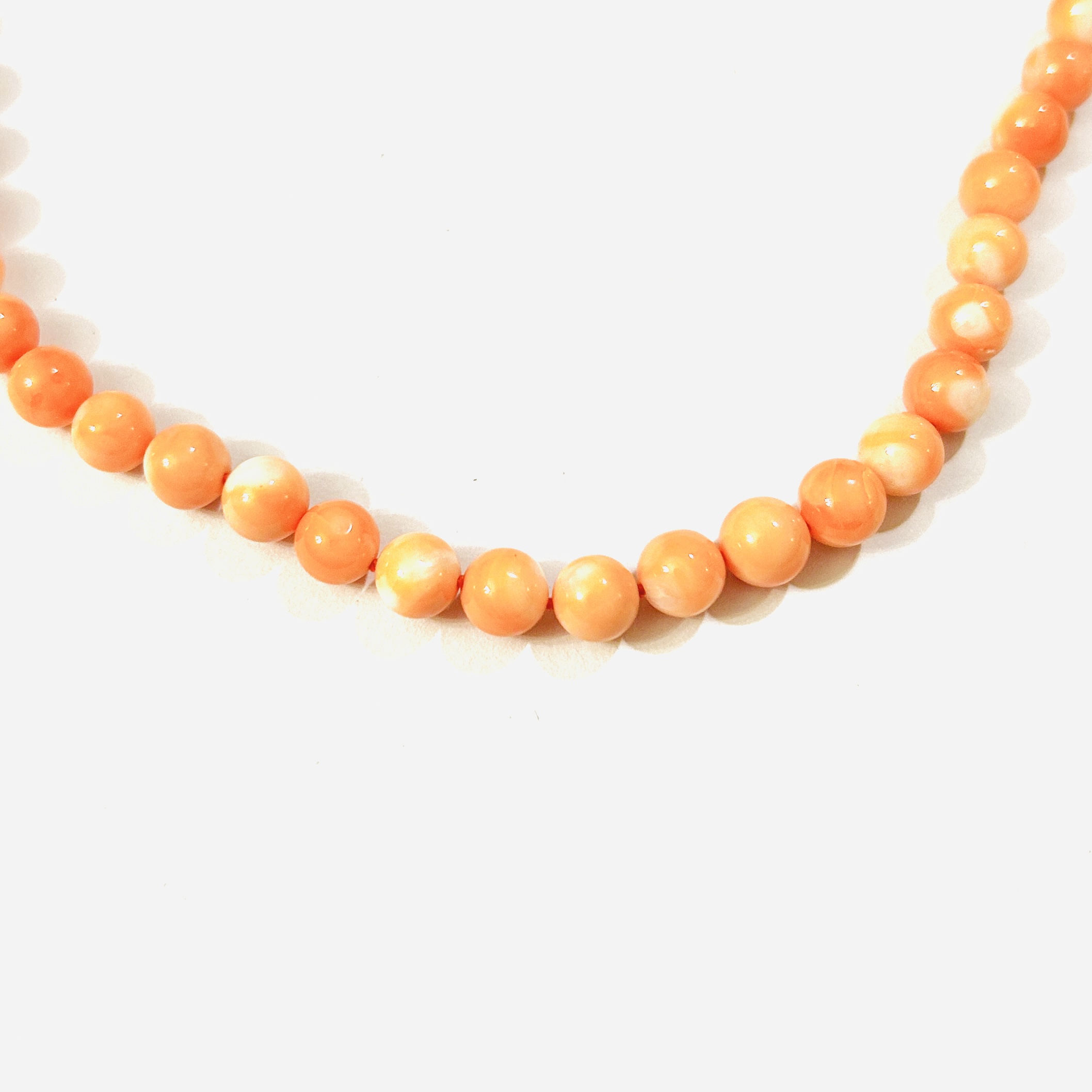 Dlouhý náhrdelník ze šňůry přírodních růžových strakatých mořských korálů. Patrně západoevropská práce z 2. třetiny 20. století, současně přidané zapínání.