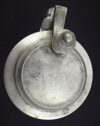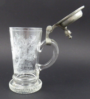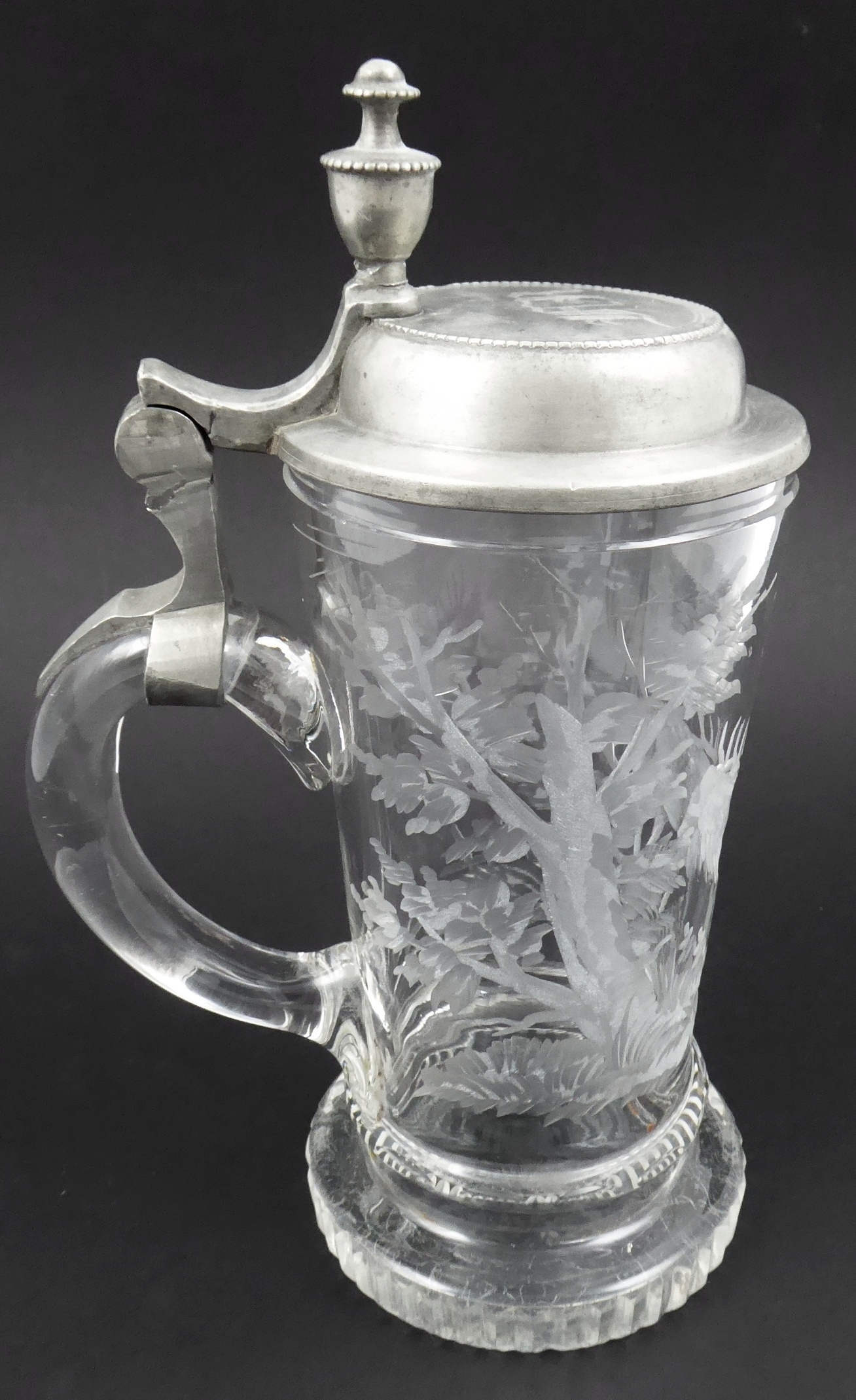 Křišťálové bezbarvé ručně broušené sklo, cín. Skleněný korbel s rytinou jelena v impozantním postoji v období říje ze druhé poloviny minulého století. Cínové víčko je staršího data, a to z období 1870 – 1910. Na horní straně je dekorováno stylizovaným monogramem. Střední Evropa, minulé století. Výška 23 cm.