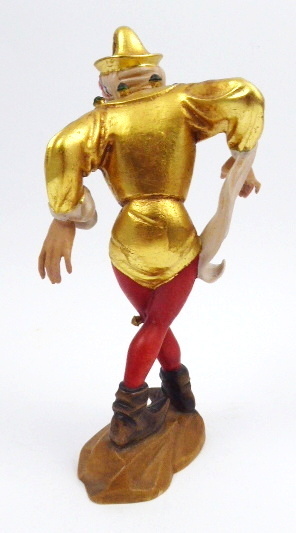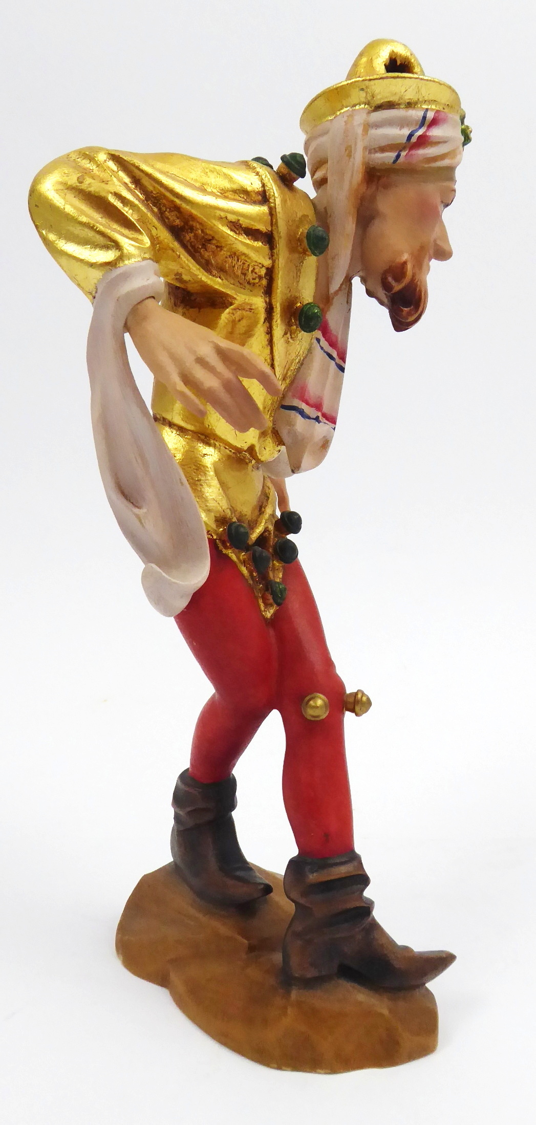 Dřevořezba, polychromie, zlacení. Kopie ze série slavných Moriskentänzer (tanečníků Morrisova tance). Autor originální předlohy: Erasmus Grasser (1450-1518) slavný německý pozdně gotický řezbář, sochař a architekt. Jeho nejznámějším, světově proslulým, dílem jsou právě tito tanečníci. Sérii v originálu vysokých soch z lipového dřeva vytvořil pro taneční sál Staré radnice v Mnichově. Název figury: Zauberer (Kouzelník). Výrobce: Řezbářství J. Heinrichmeyer, Rimbach, Německo. Dřevořezba tancujícího kouzelníka oblečeného do zlatavého oděvu a červených punčoch s rolničkami a obutého do vysokých dobových bot se špičkou. Na stylizovaném reliéfním podstavci. Německo, Rimbach, minulé století. Výška 25 cm, rozměr podstavce 10 cm x 5,5 cm.
