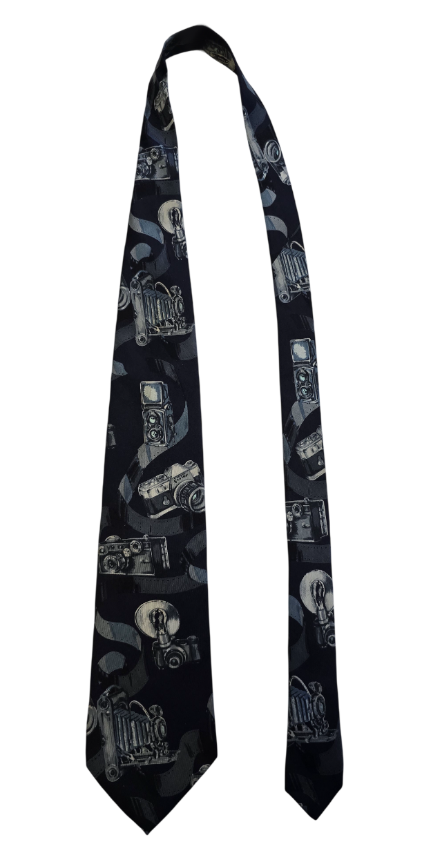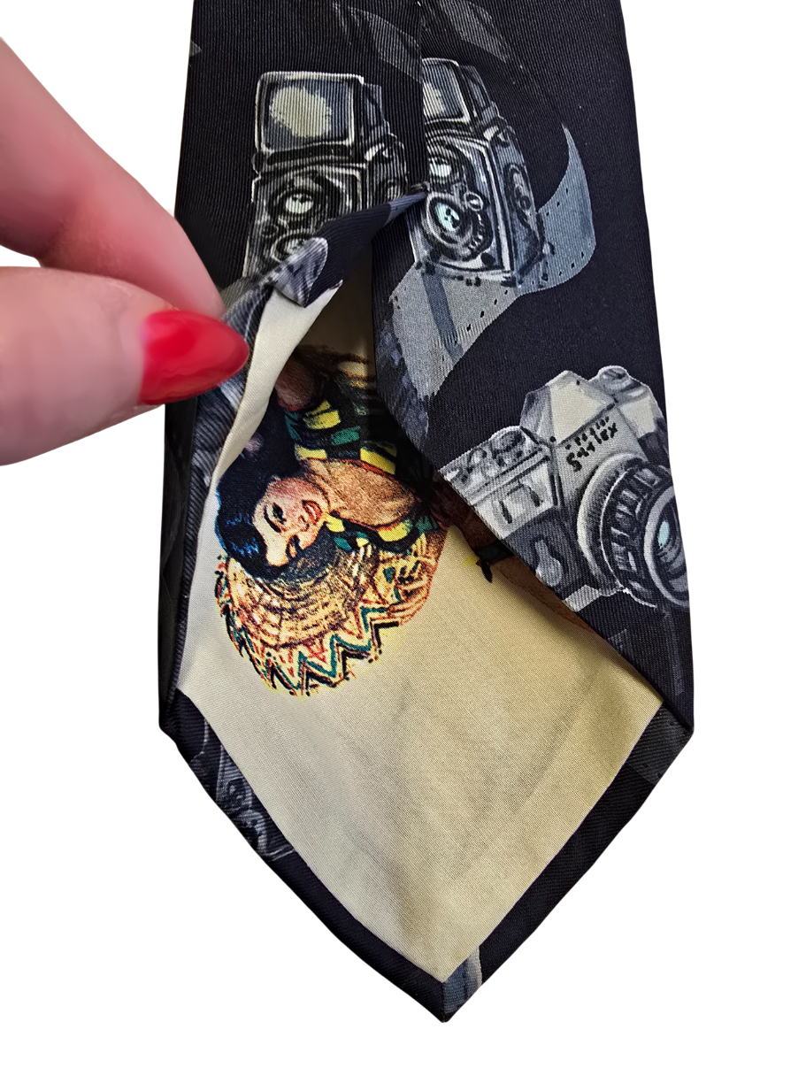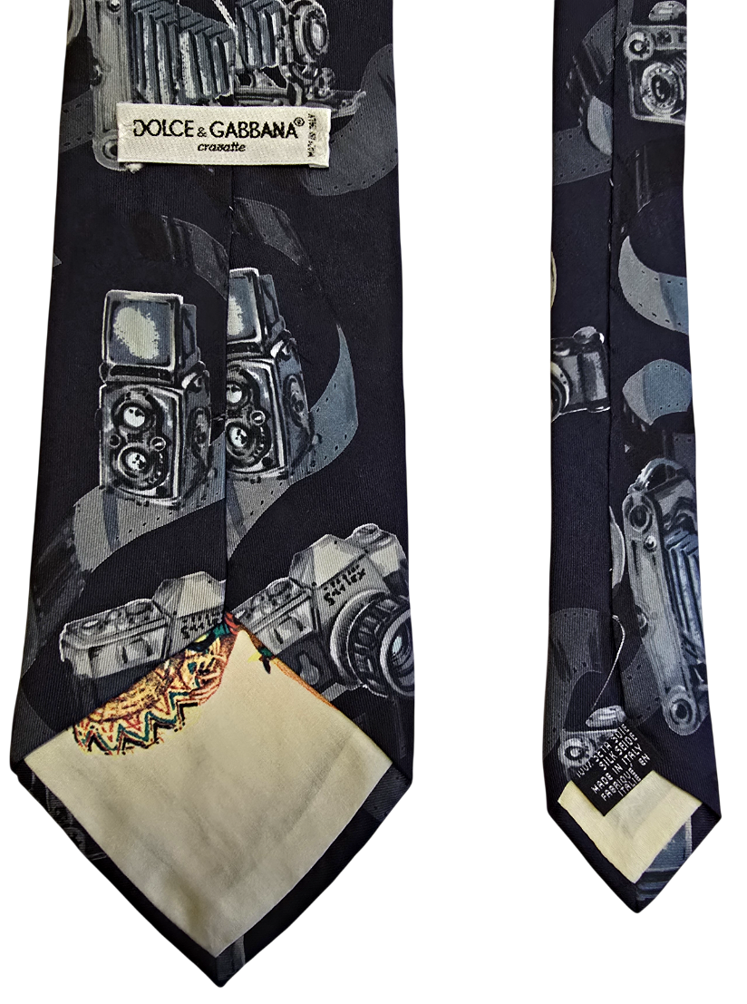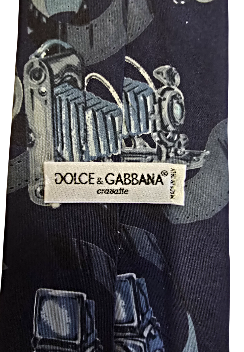 Popis: Hedvábná kravata značky Dolce Gabbana s vyobrazením starožitných fotoaparátů. Na rubu kravaty je vyobrazena pin-up dívka, lehce erotický motiv. Původní všitý štítek. Perfektní stav, jako nová. Rarita.