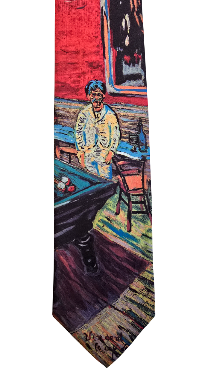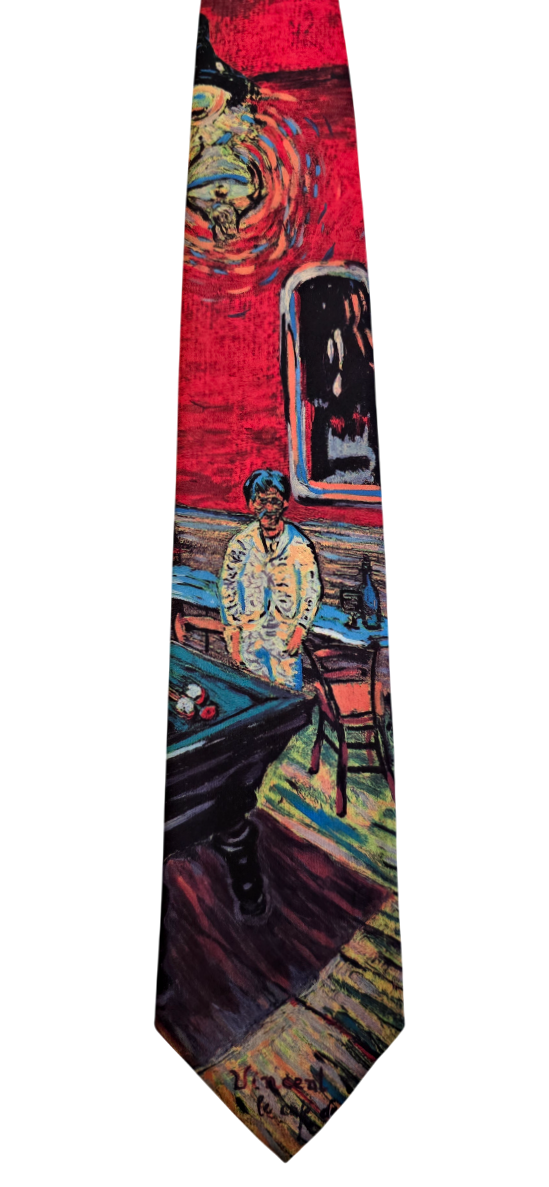 Popis: Výjimečná kravata značky Ralph Marlin s unikátním motivem ze slavného obrazu Noční kavárna na Place Lamartine od Vincenta van Gogha. Na zadní straně původní všitá visačka a vetkaný název obrazu. Perfektní stav, jako nová. Rarita.