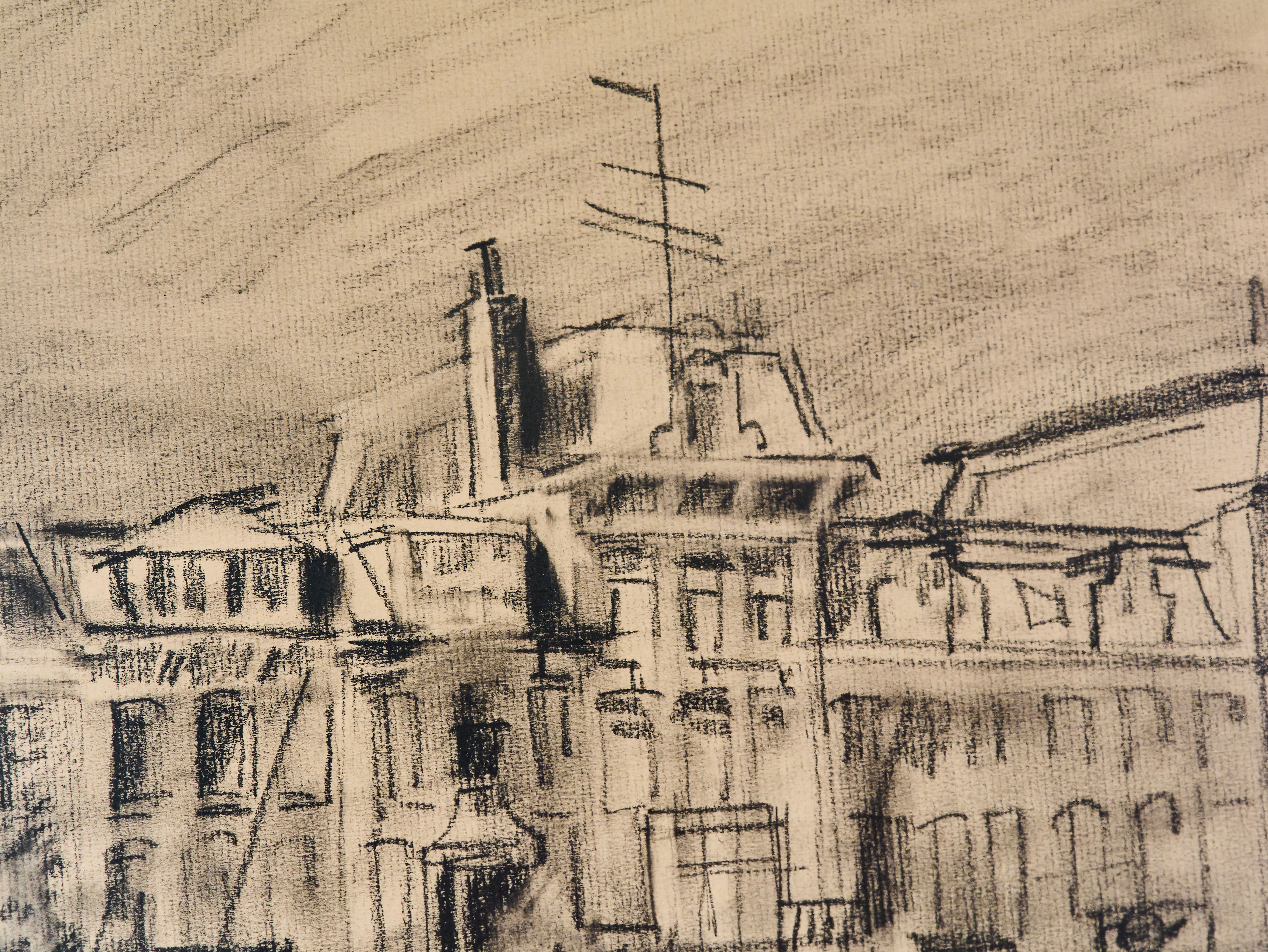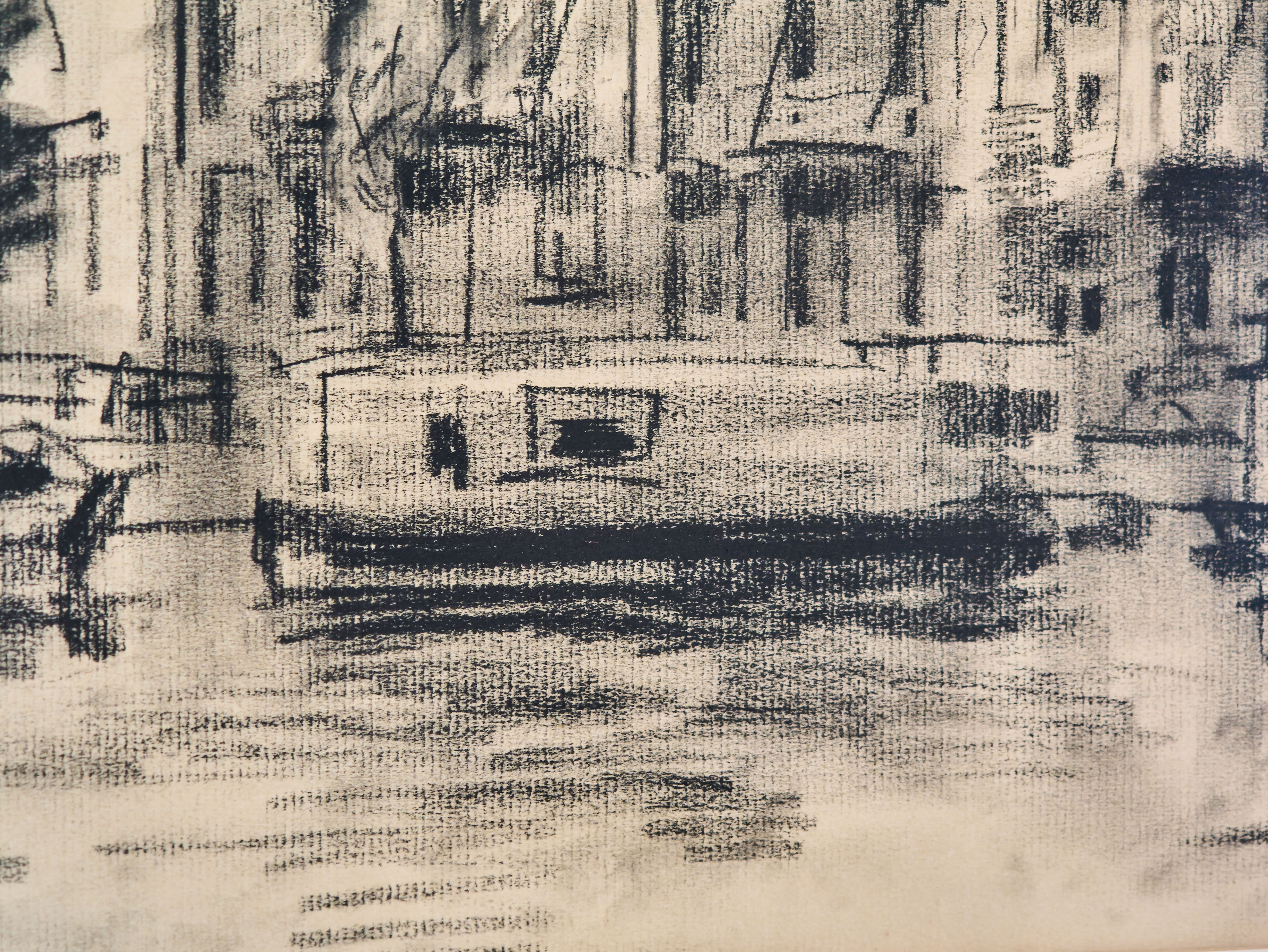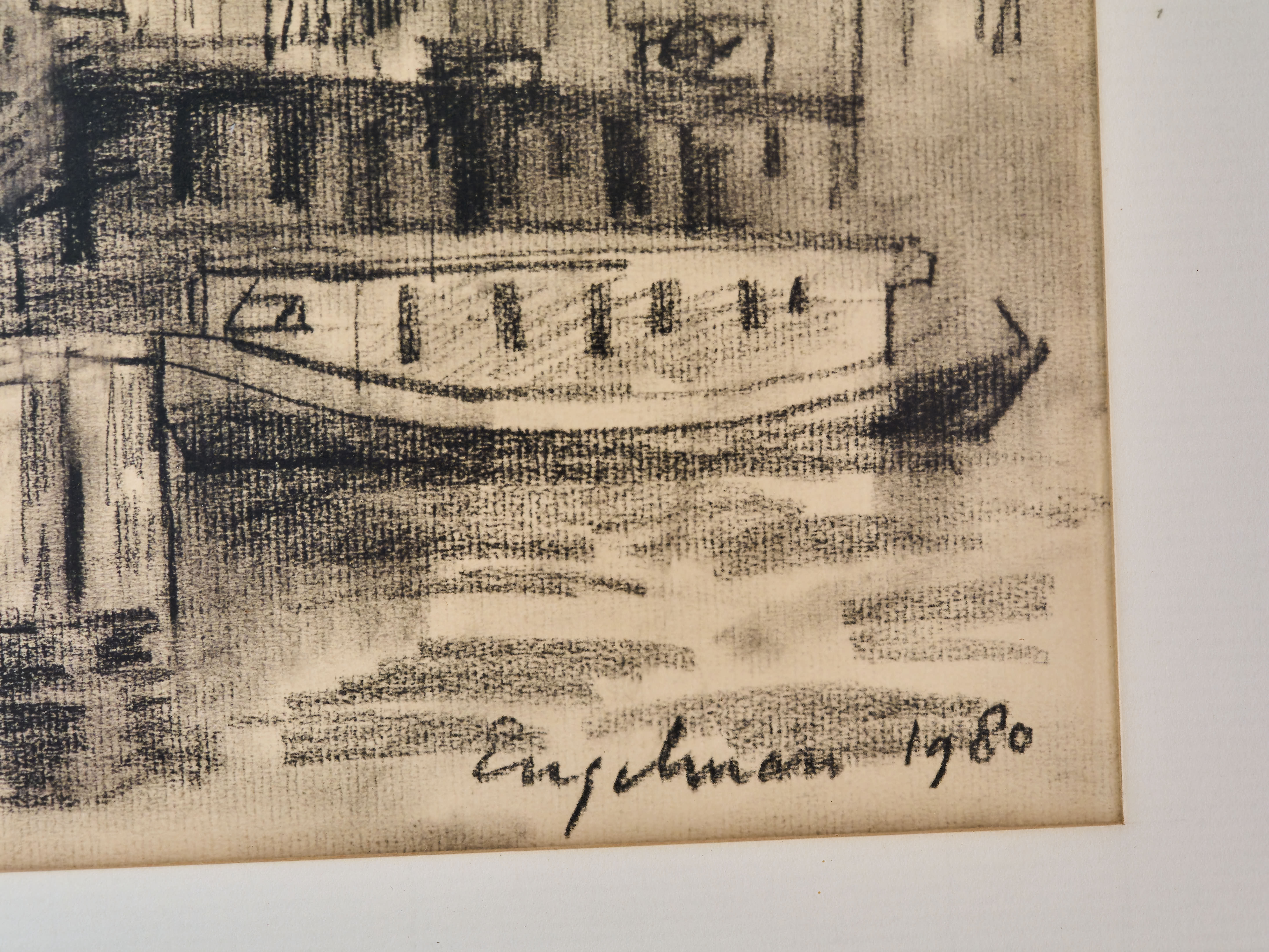 Kresba uhlem zachycující městské nábřeží s historickými domy a kotvícími loděmi, signováno Engelman 1980. Dílo je provedeno energickým moderním rukopisem s důrazem na atmosféru městského prostředí. Uhel vytváří jemné přechody i výrazné kontrasty, které dodávají kresbě hloubku a živost. Kresba je adjustována v kvalitním dřevěném rámu s paspartou. Na zadní straně se nachází originální štítek Kunsthandel Engelchor, Zeilstraat 19 Amsterdam, což potvrzuje původ z renomovaného nizozemského obchodu s uměním. Celkový stav je velmi dobrý, papír bez poškození, rám ve výborném stavu. Technika uhel na papíře. Datace 1980. Signatura Engelman 1980 v pravém dolním rohu. Původ Amsterdam. Rámováno a připraveno k vystavení. Vhodné pro sběratele evropské kresby i jako stylový doplněk interiéru.