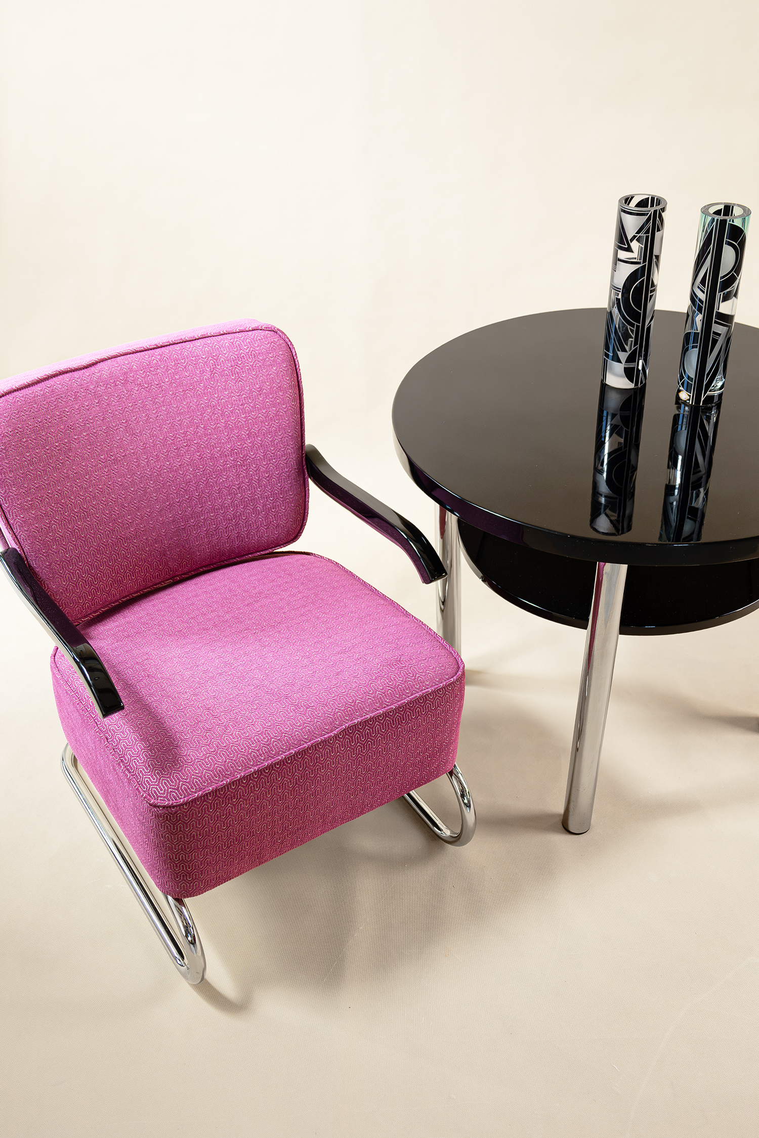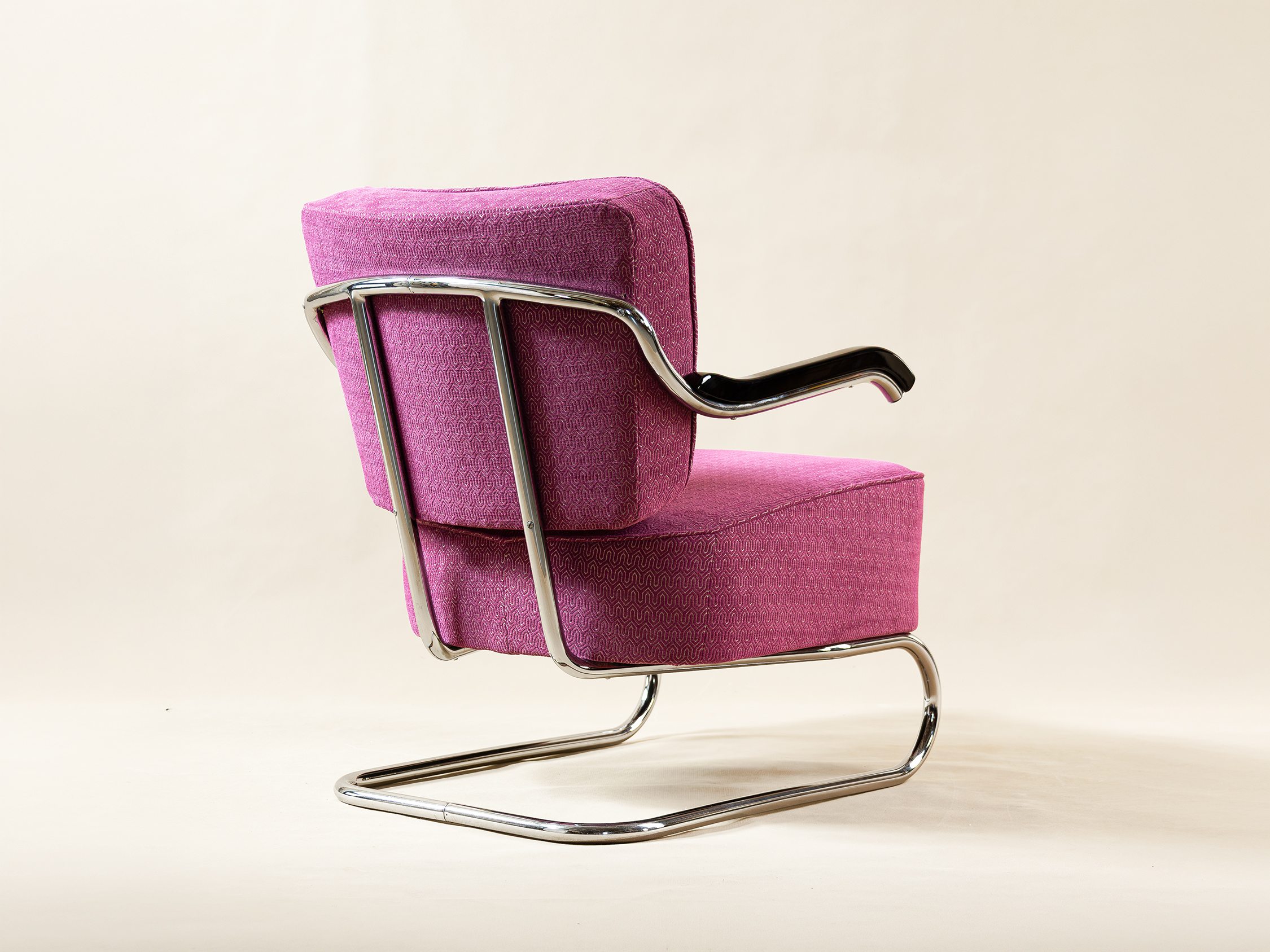 Materiál-trubková ocel, bukové područky, nové čalounění, nově chromováno.