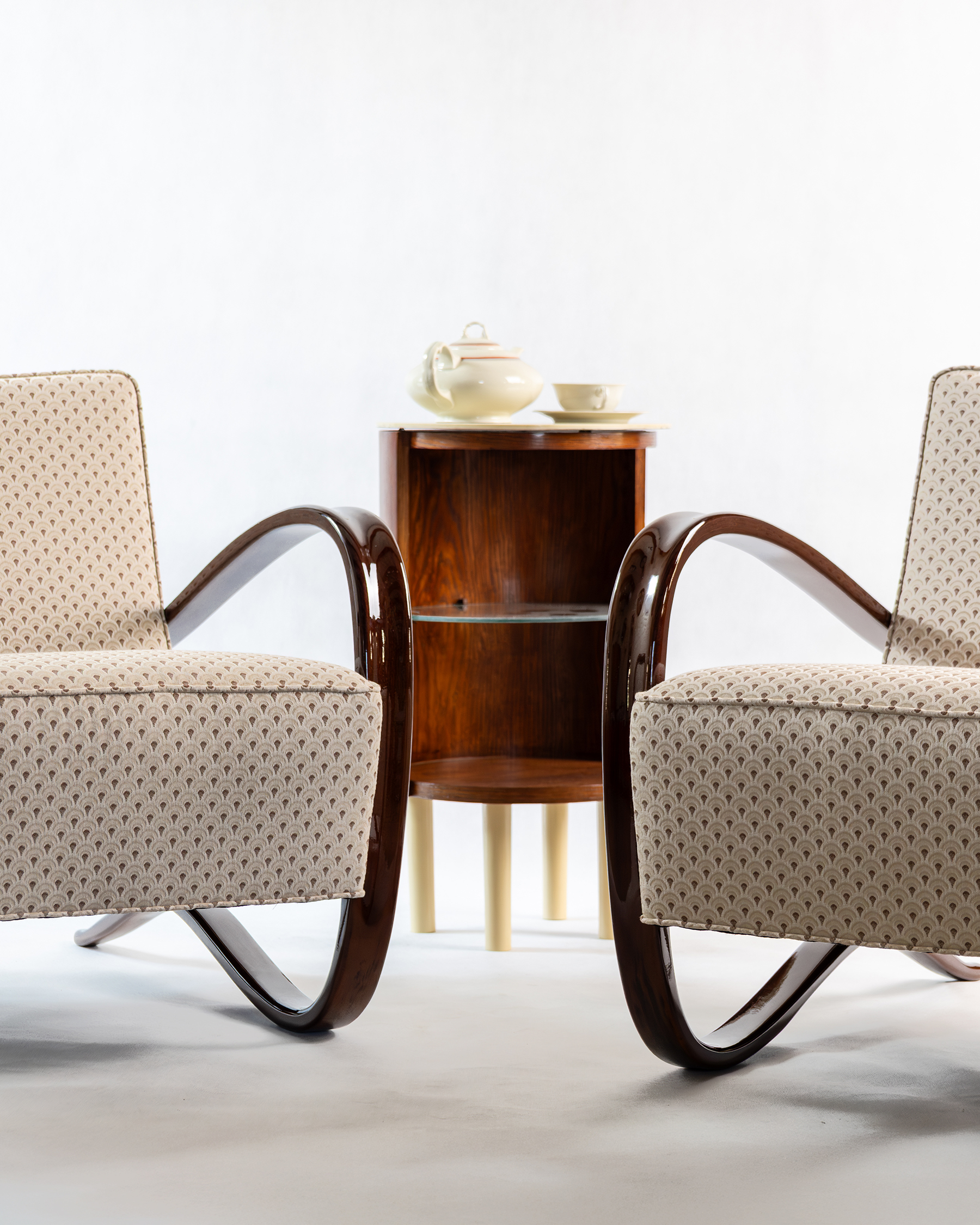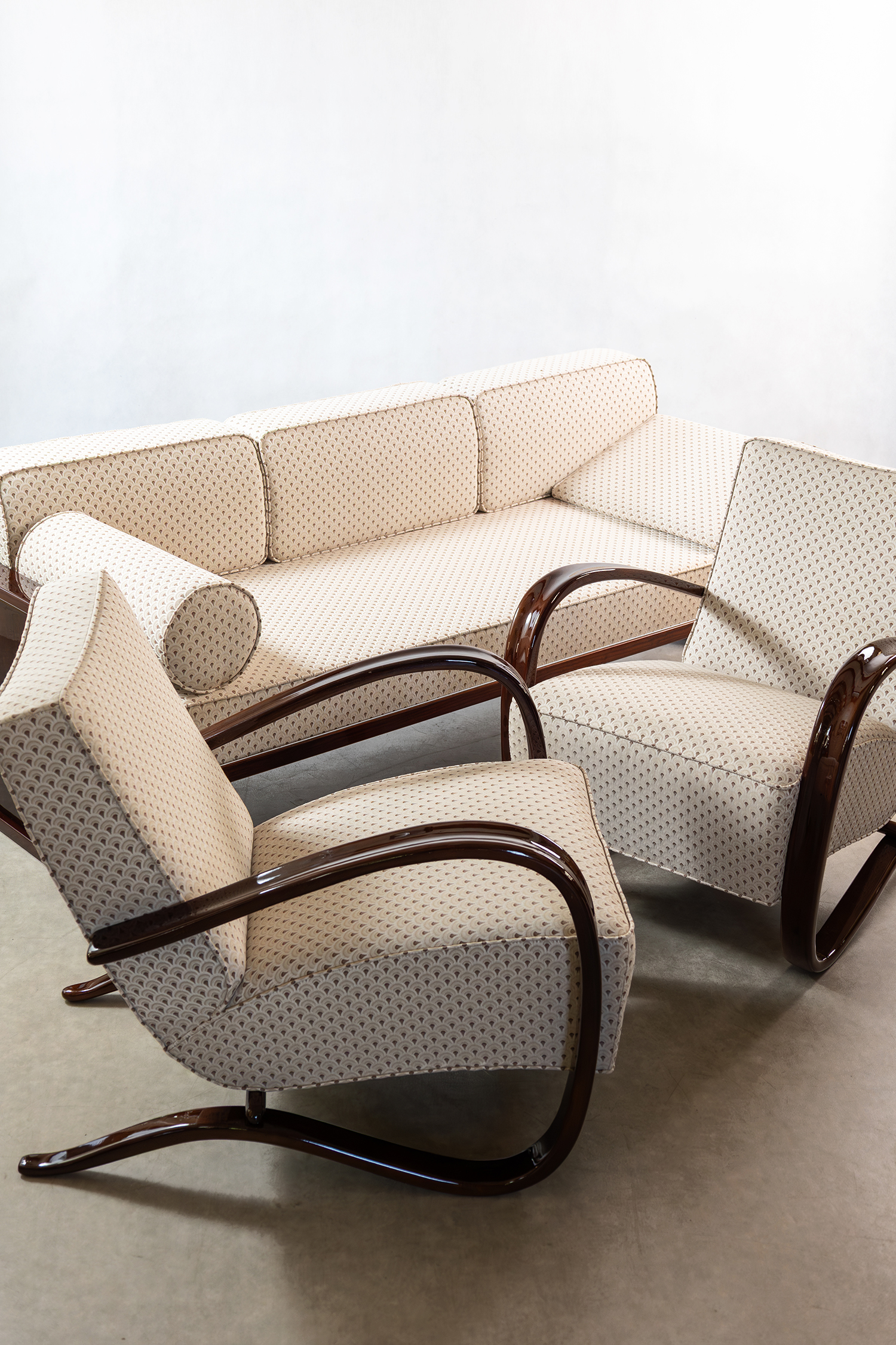 Materiál-dřevěný korpus, bukové područky, nové čalounění