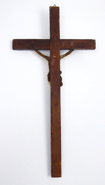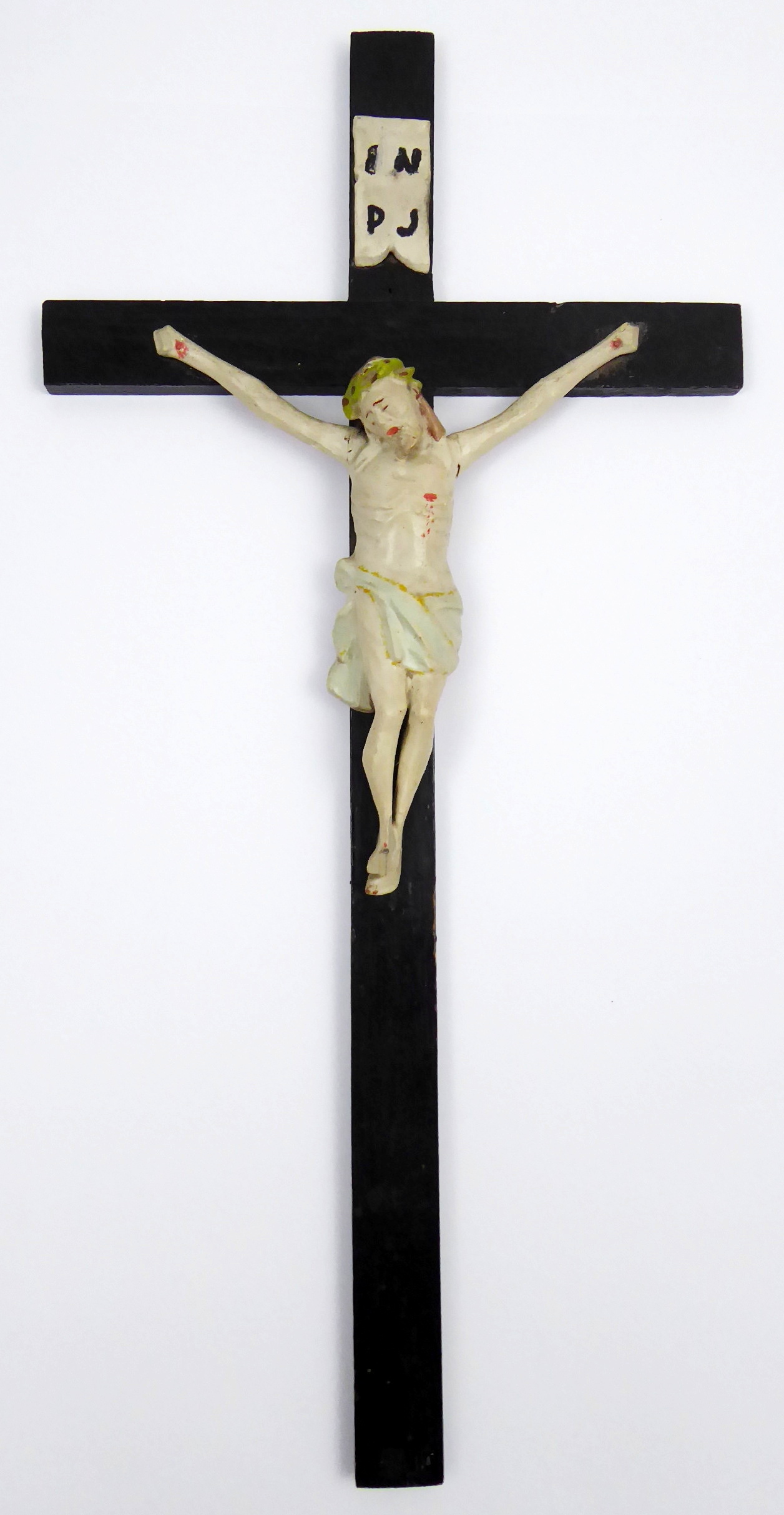 Dřevořezba, polychromie, patinováno. Přiloženo osvědčení Národního památkového ústavu České republiky. Vysoký krucifix se z běžného pojetí vymyká umístěním titulu s písmeny IN/PJ. Hlava Ježíše s velmi drobným tělem je skloněná k pravému rameni a rána umístěna vlevo na hrudi je vyznačena červeně. Bederní rouška (perizonium) krémové barevnosti je uvázána na pravém boku. Dřevěný kříž černé barvy je lakovaný. Nahoře na zadní straně kříže oko na závěs. Střední Evropa 1900 – 1940. Výška 65 cm.