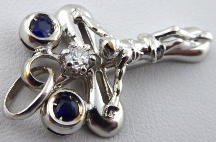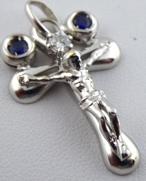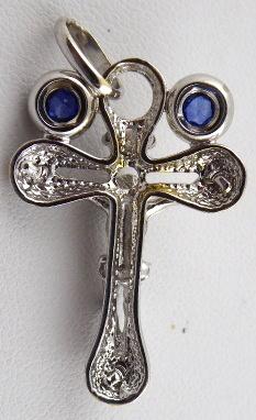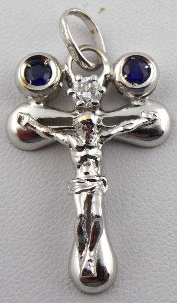 Kříž z bílého zlata s diamantem a párovými modrými safíryBílé 18 karátové zlato, přírodní diamant, dva přírodní modré safíry. Ryzost Au 750 / 1000, celková hmotnost 5,15 gramů. Přívěsek z bílého zlata ve tvaru kříže s prořezávaným ornamentem a reliéfním tělem Krista. Uprostřed vsazený kulatý přírodní diamant moderního briliantového brusu o hmotnosti 0,20 ct, barva G, čistota Si1. V horní části dva přírodní broušené modré safíry. Oválný závěsný úchyt. Značeno: ryzost 750, nový český punc hlava kohouta s číslem. Evropa druhá polovina minulého století. Výška 35 mm.