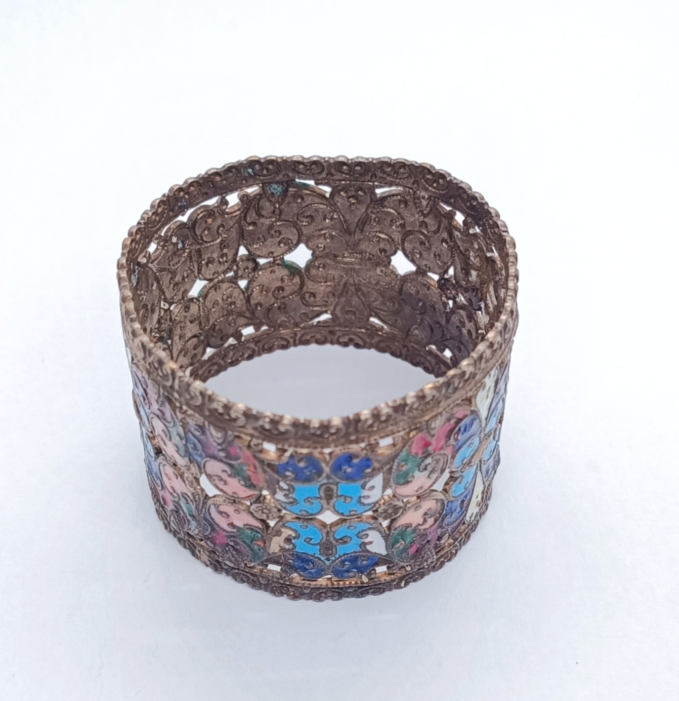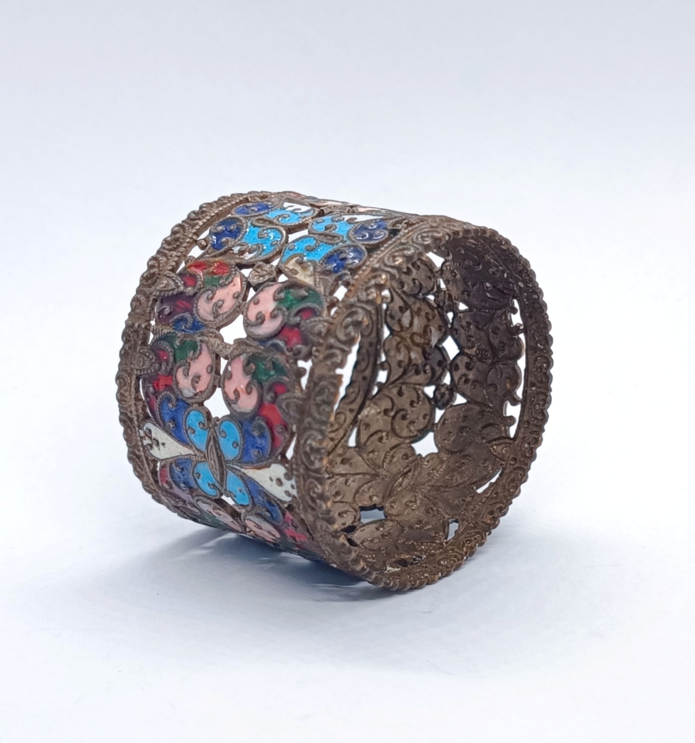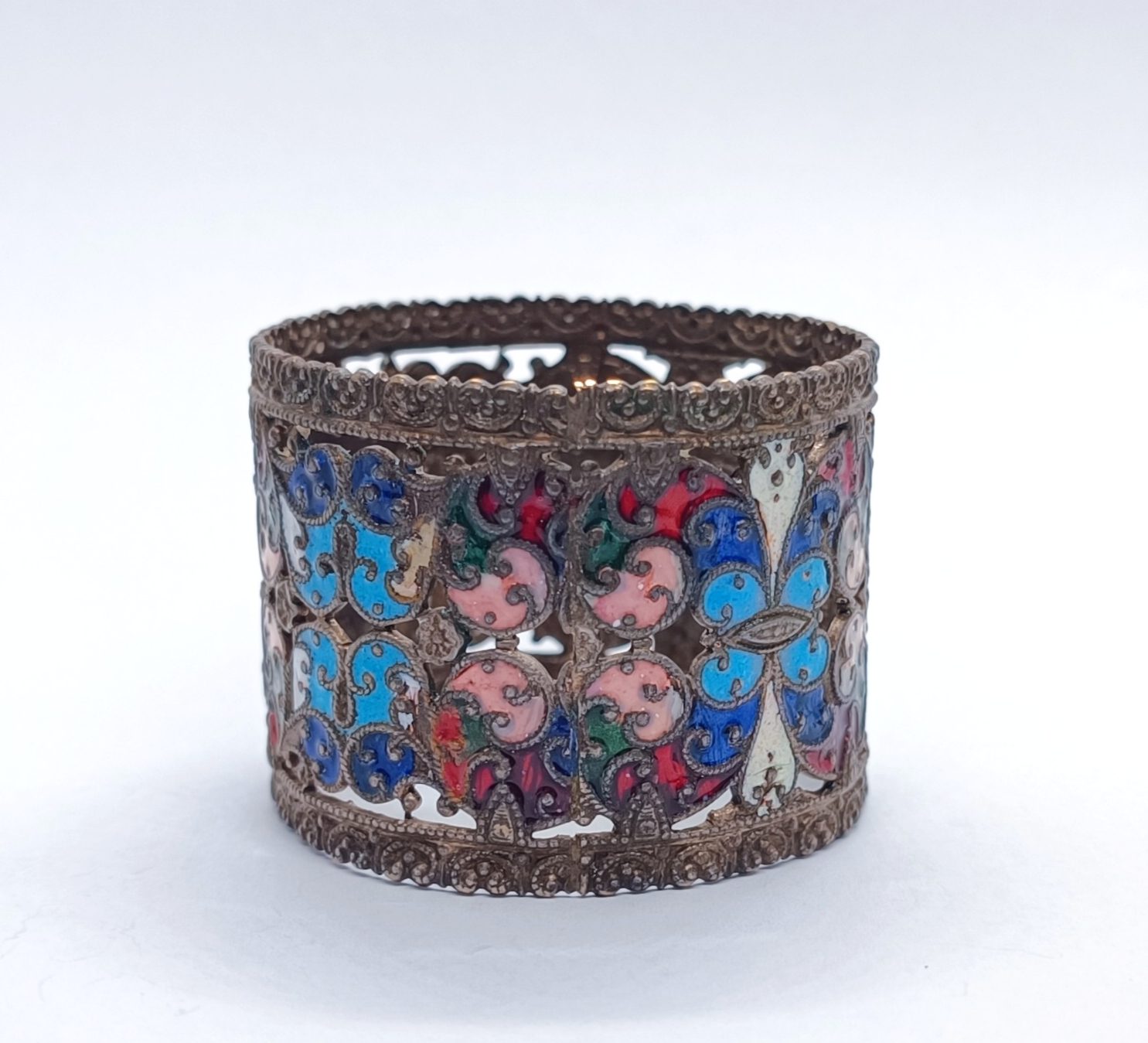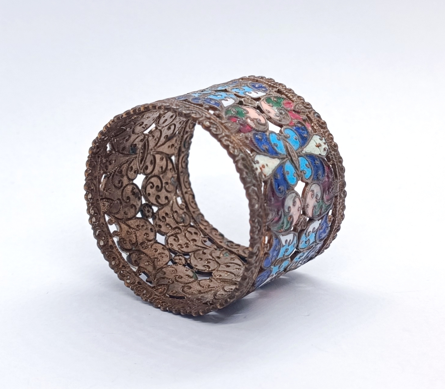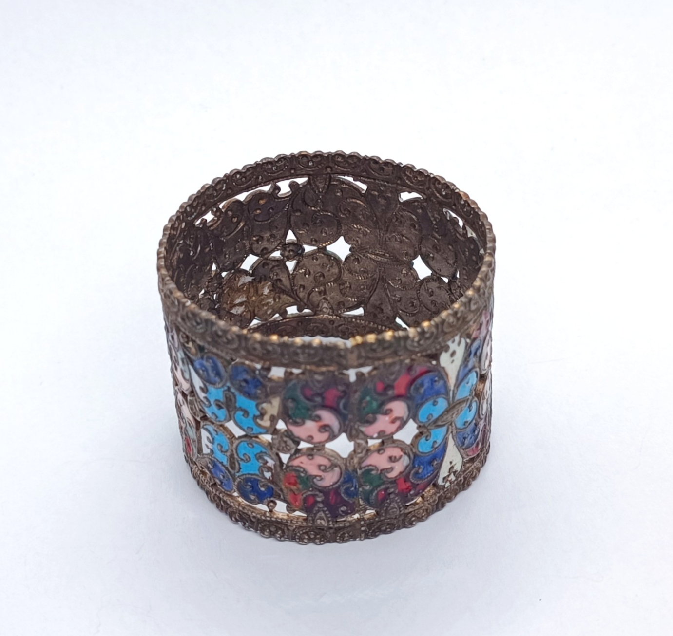 Kroužek na ubrousky z obecného kovu, zdobený smalty, místy lehce odřené, kroužek v jednom místě lehce promáčklý, celkový stav dle stáří, i tak velmi zajímavě zdobený, Východní Evropa, konec 19. století; šířka 3,7 cm, průměr cca 4,5 cm