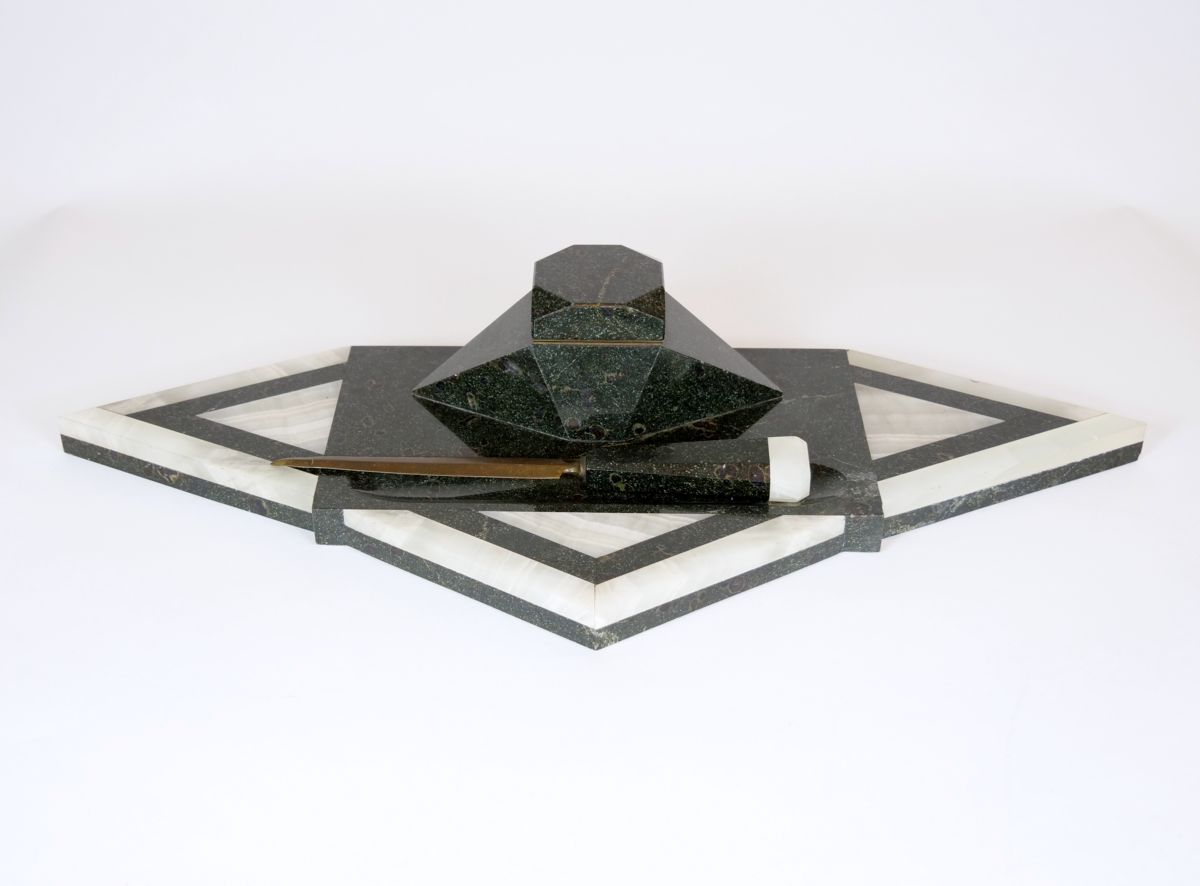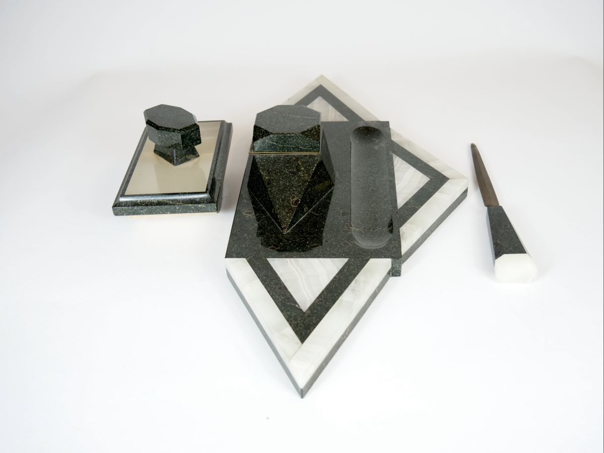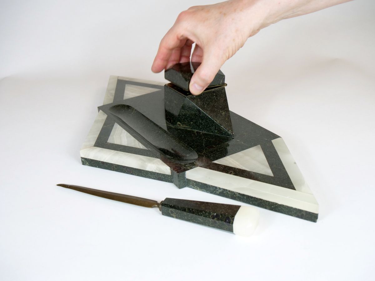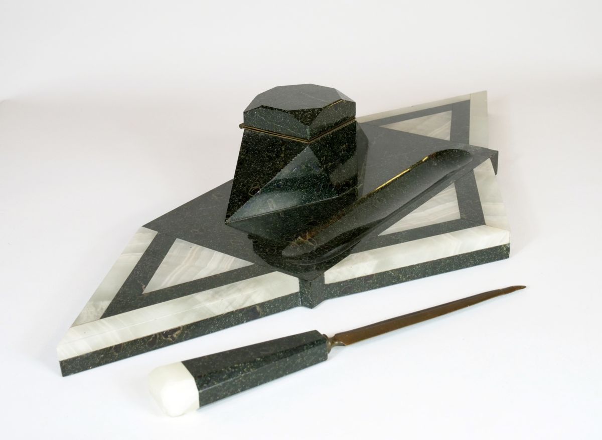 mimořádná kubistická psací souprava ze serpentinu a bílého onyxu, 3 ks, zřejmě Čechy, kolem r. 1920, na víčku secesním písmem provedený monogram nebo značka, drobné stopy času; rozměry 52,5 x 21,5 x 9 cm; sběratelsky zajímavé
