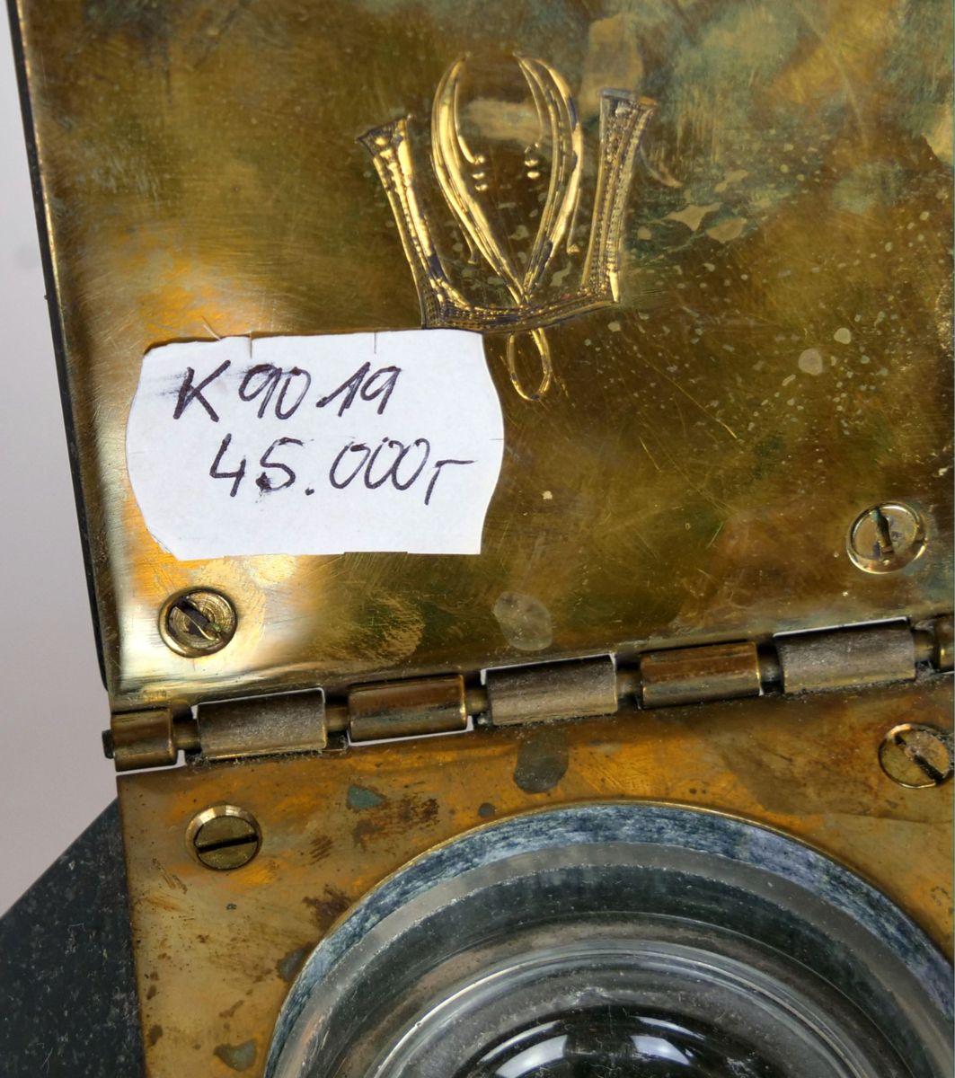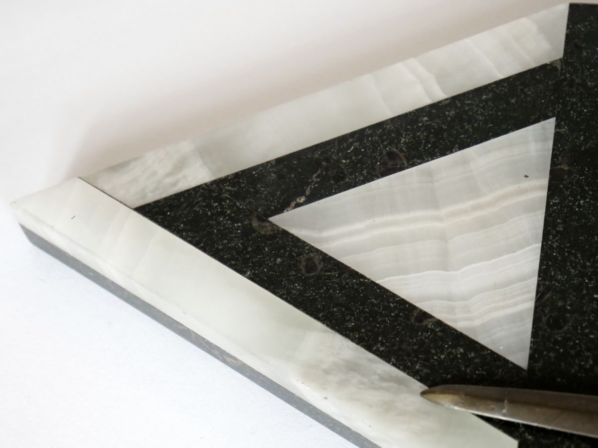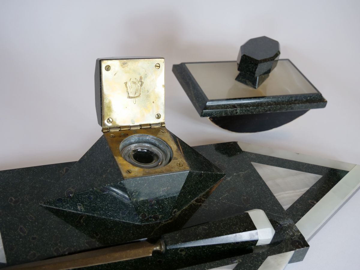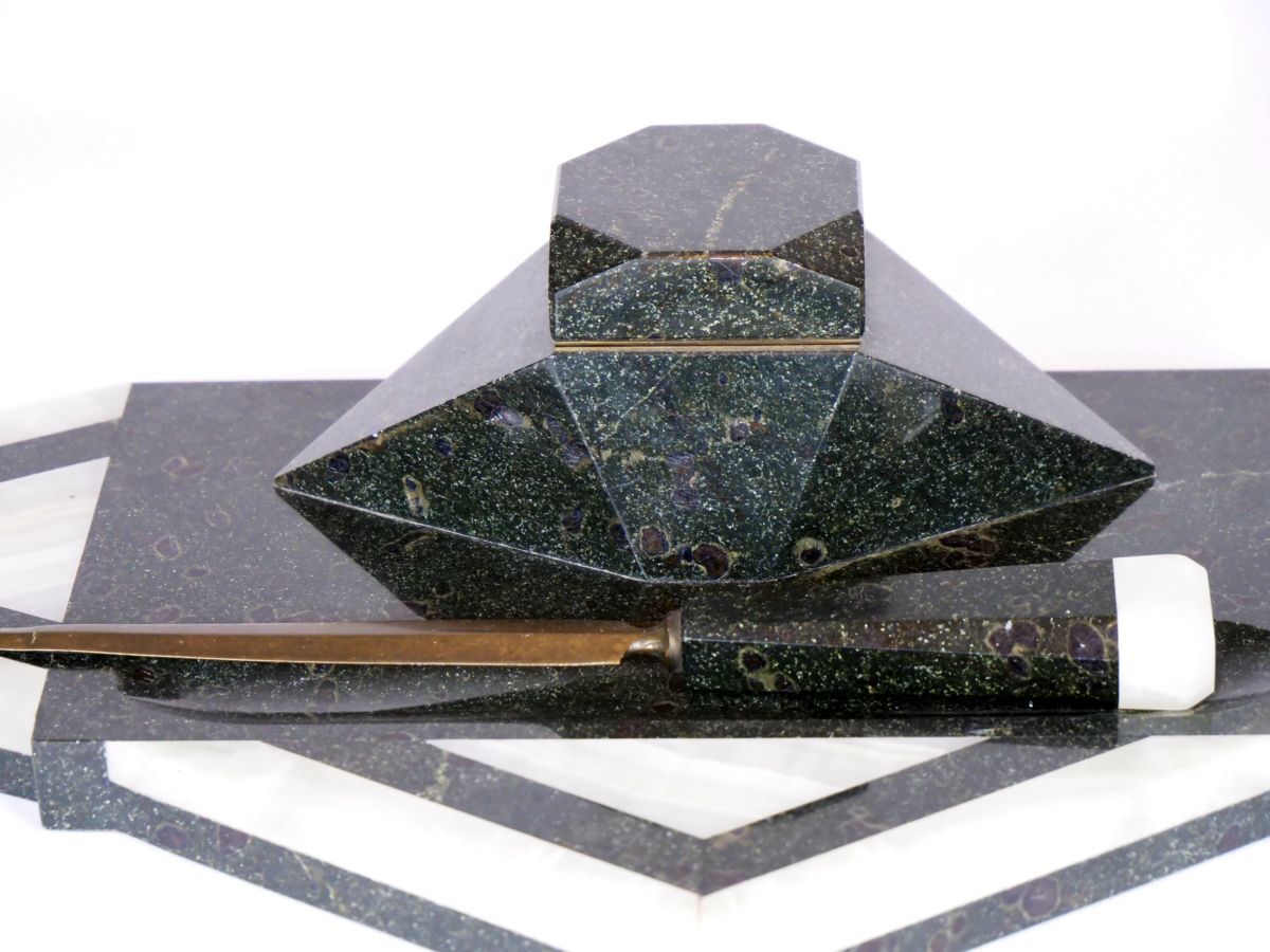 mimořádná kubistická psací souprava ze serpentinu a bílého onyxu, 3 ks, zřejmě Čechy, kolem r. 1920, na víčku secesním písmem provedený monogram nebo značka, drobné stopy času; rozměry 52,5 x 21,5 x 9 cm; sběratelsky zajímavé