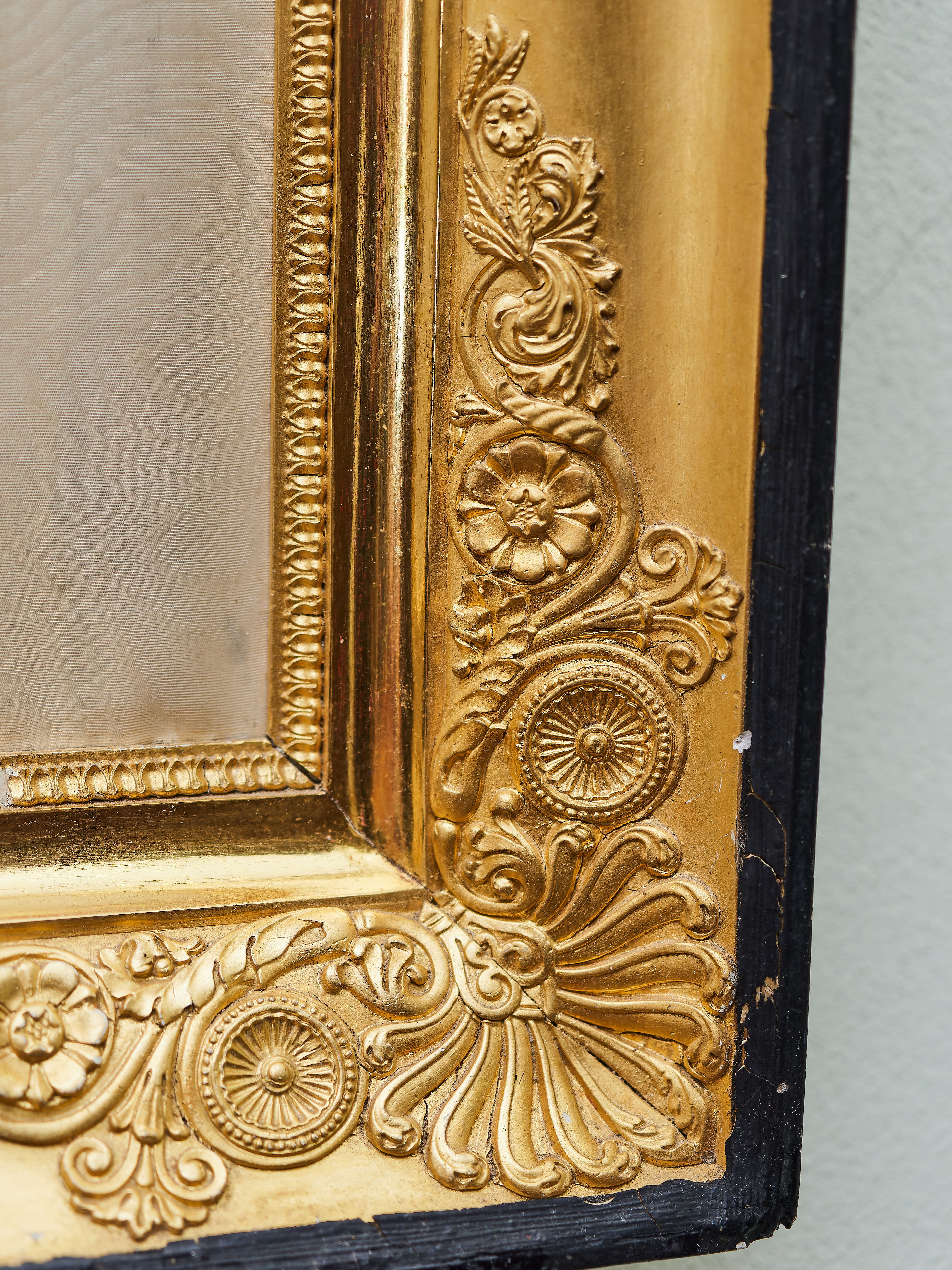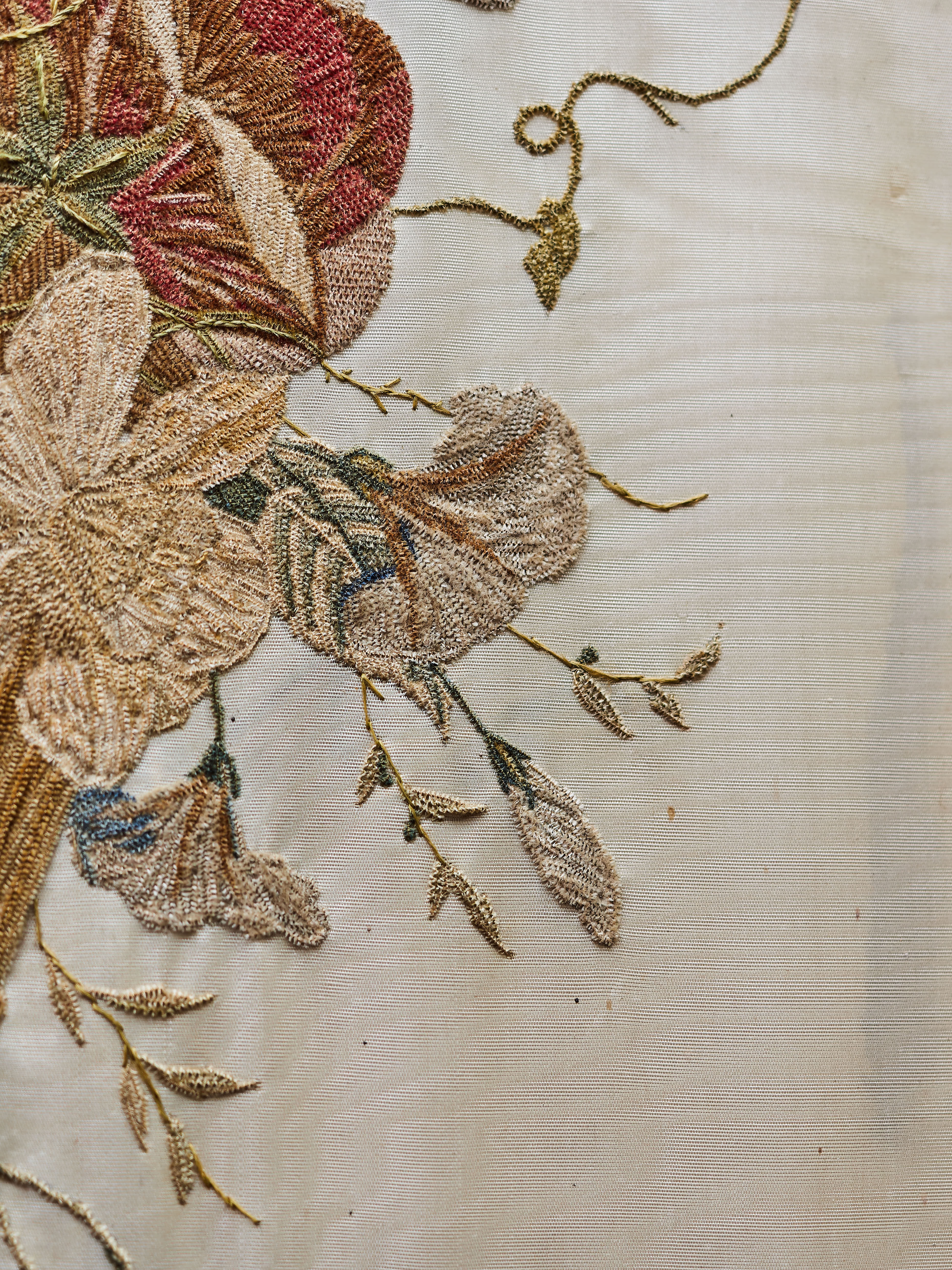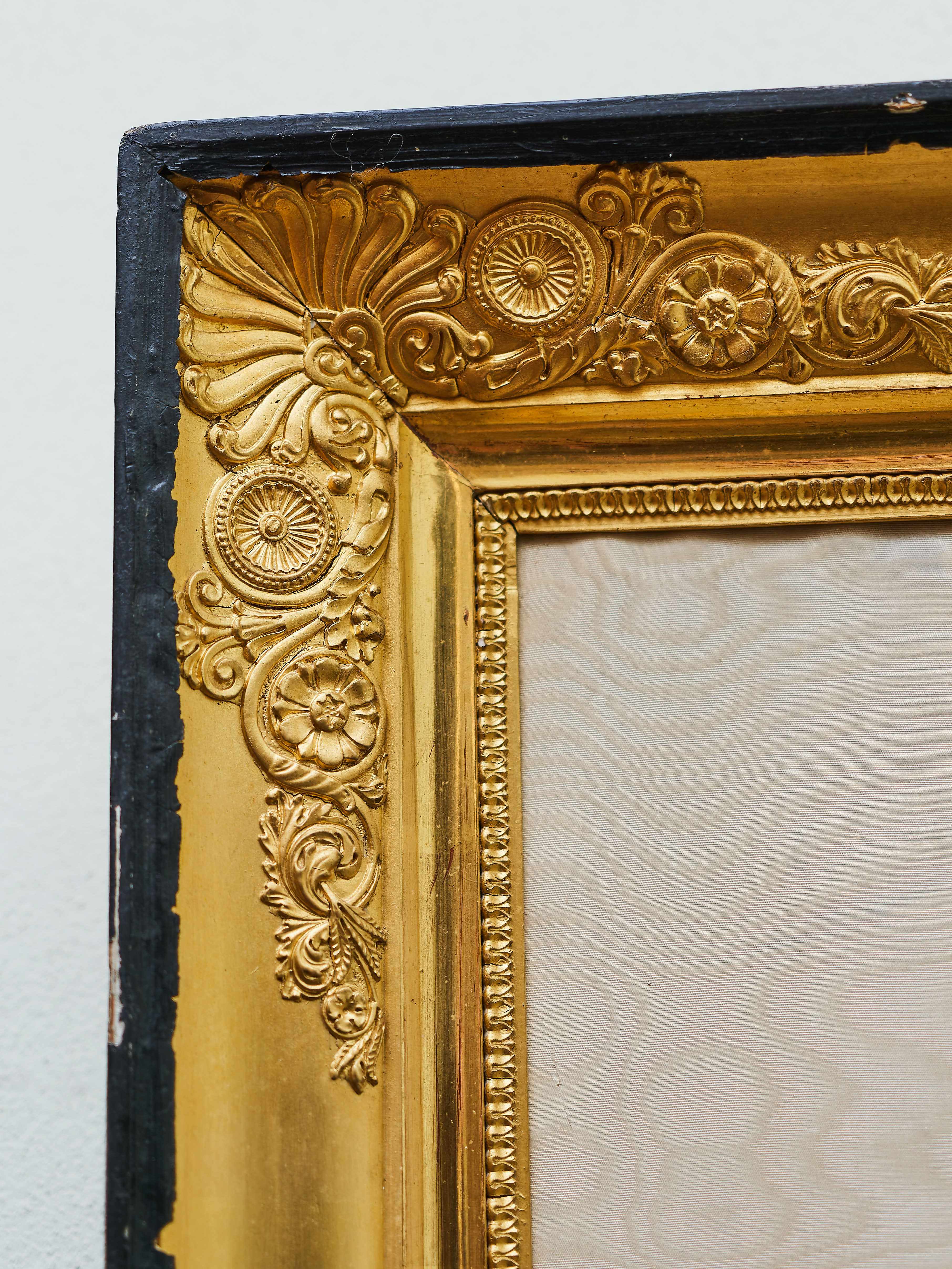 Ručně vyšívaný obraz na hedvábí. Jemná práce s krásnými detaily. Původní zlacený rám s černým lemováním.