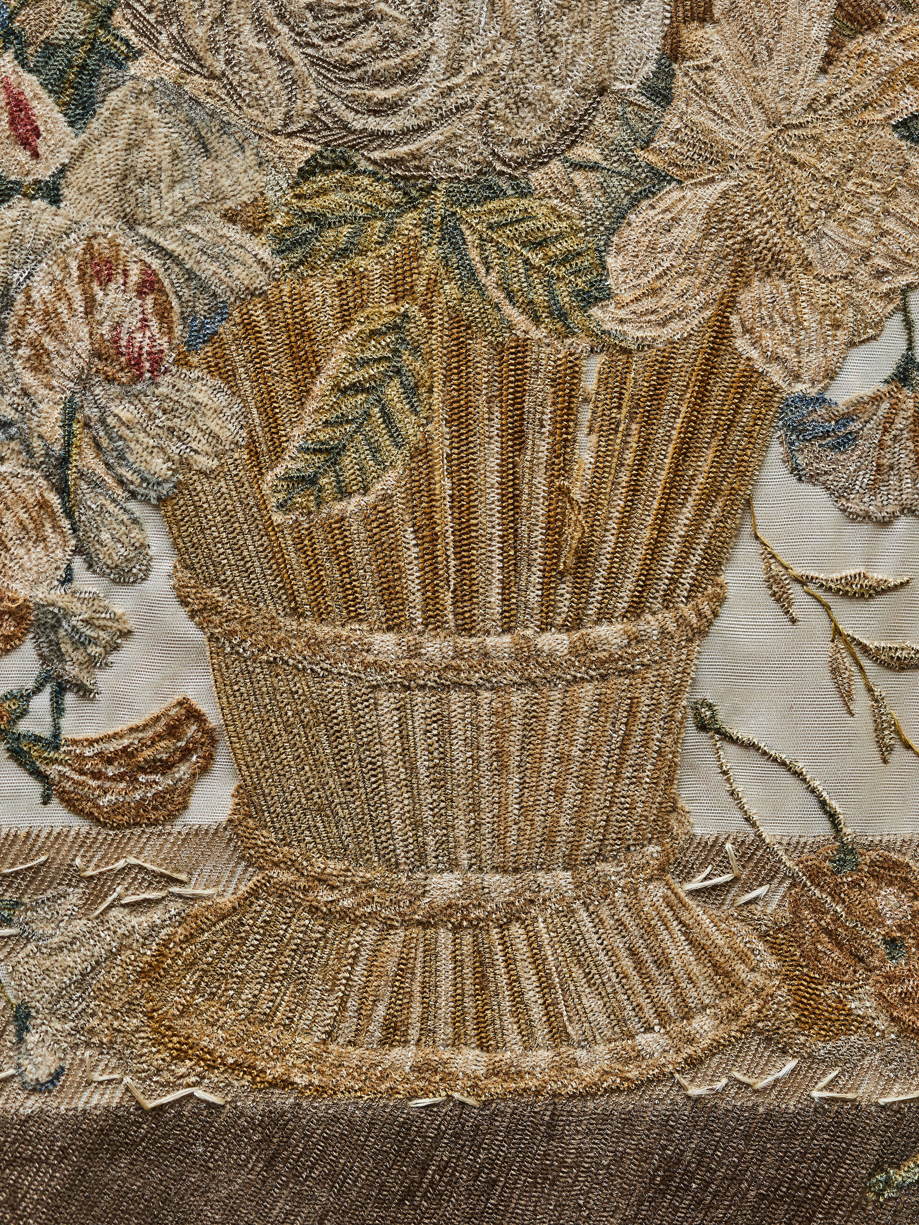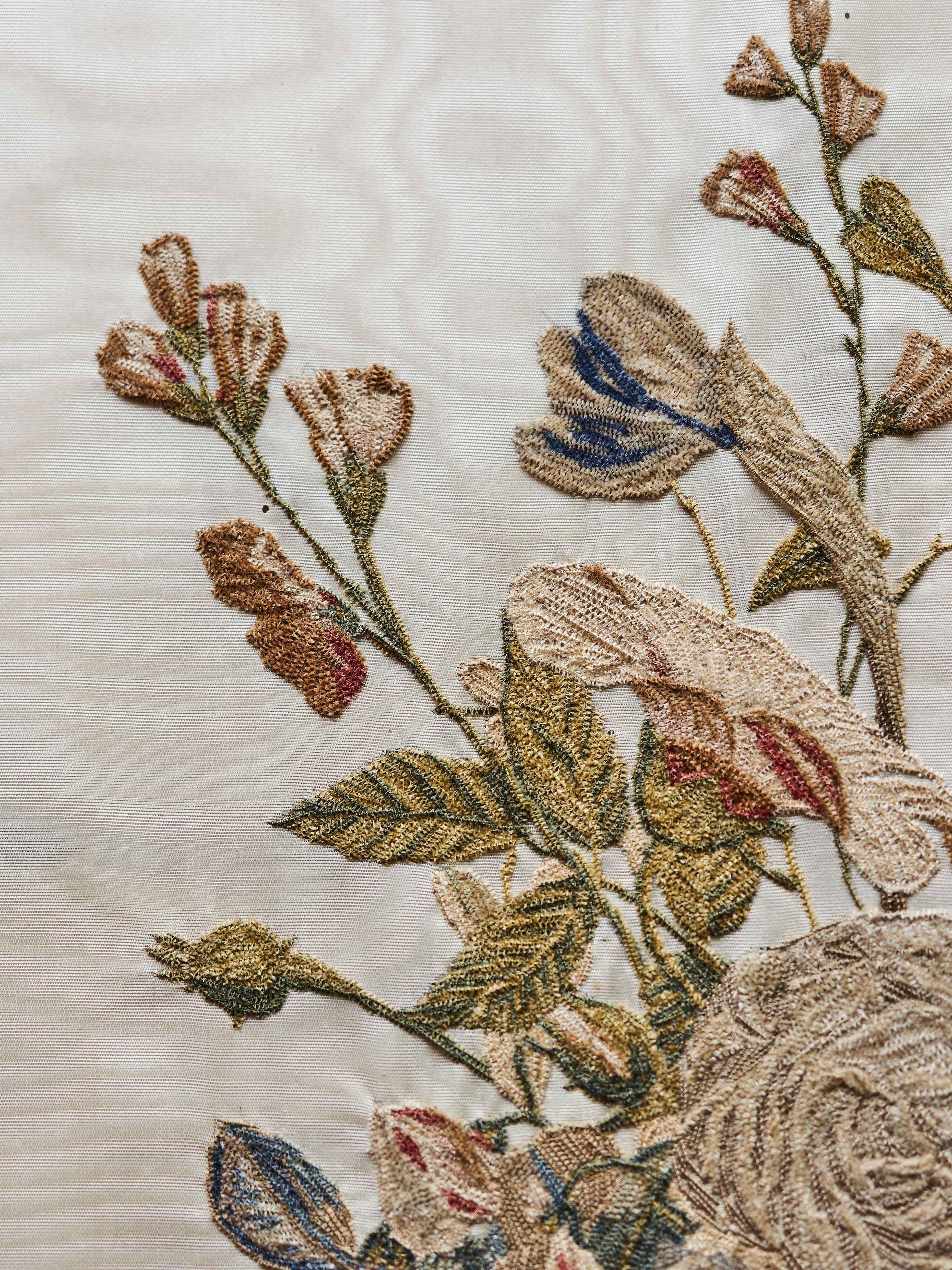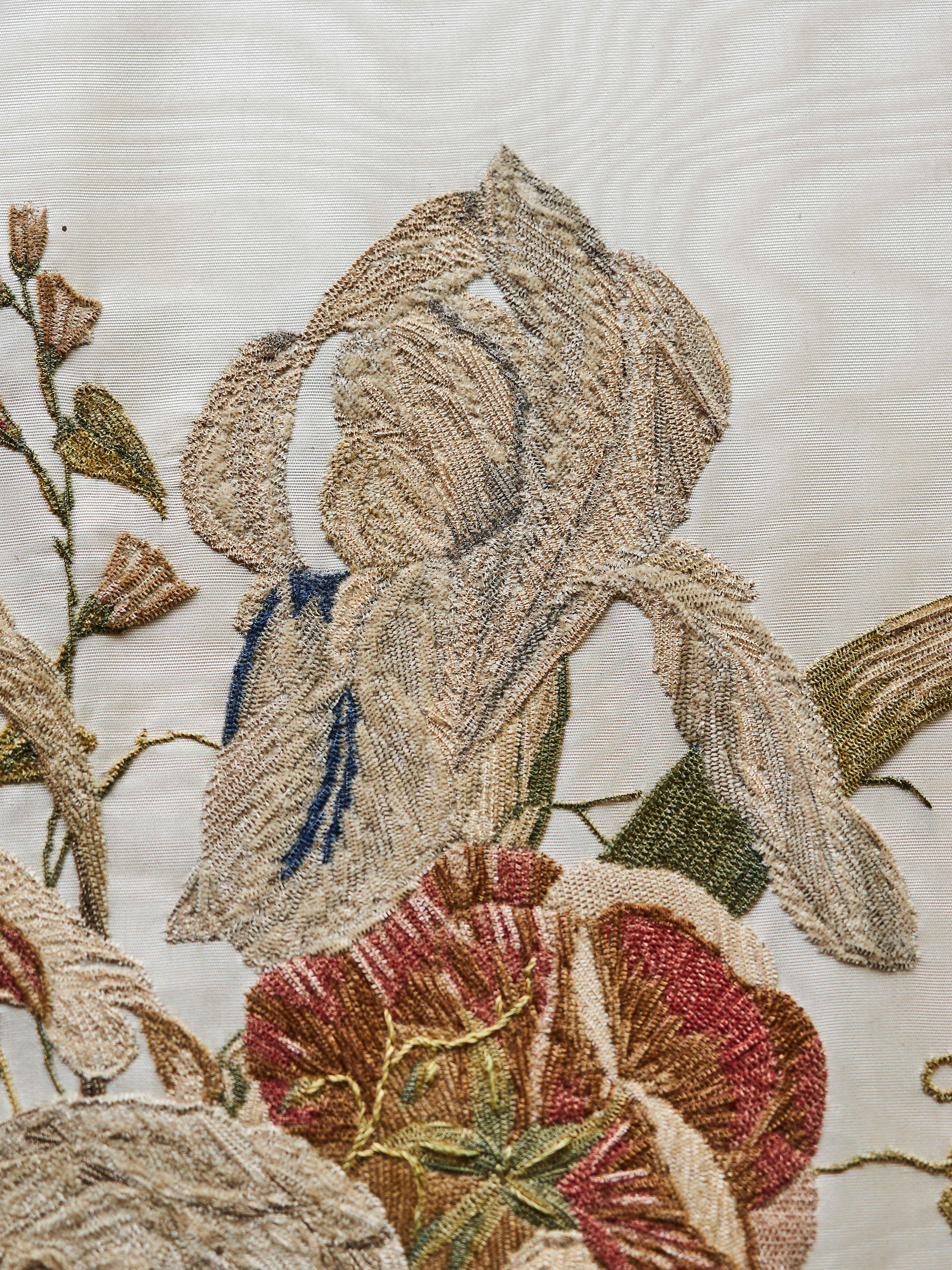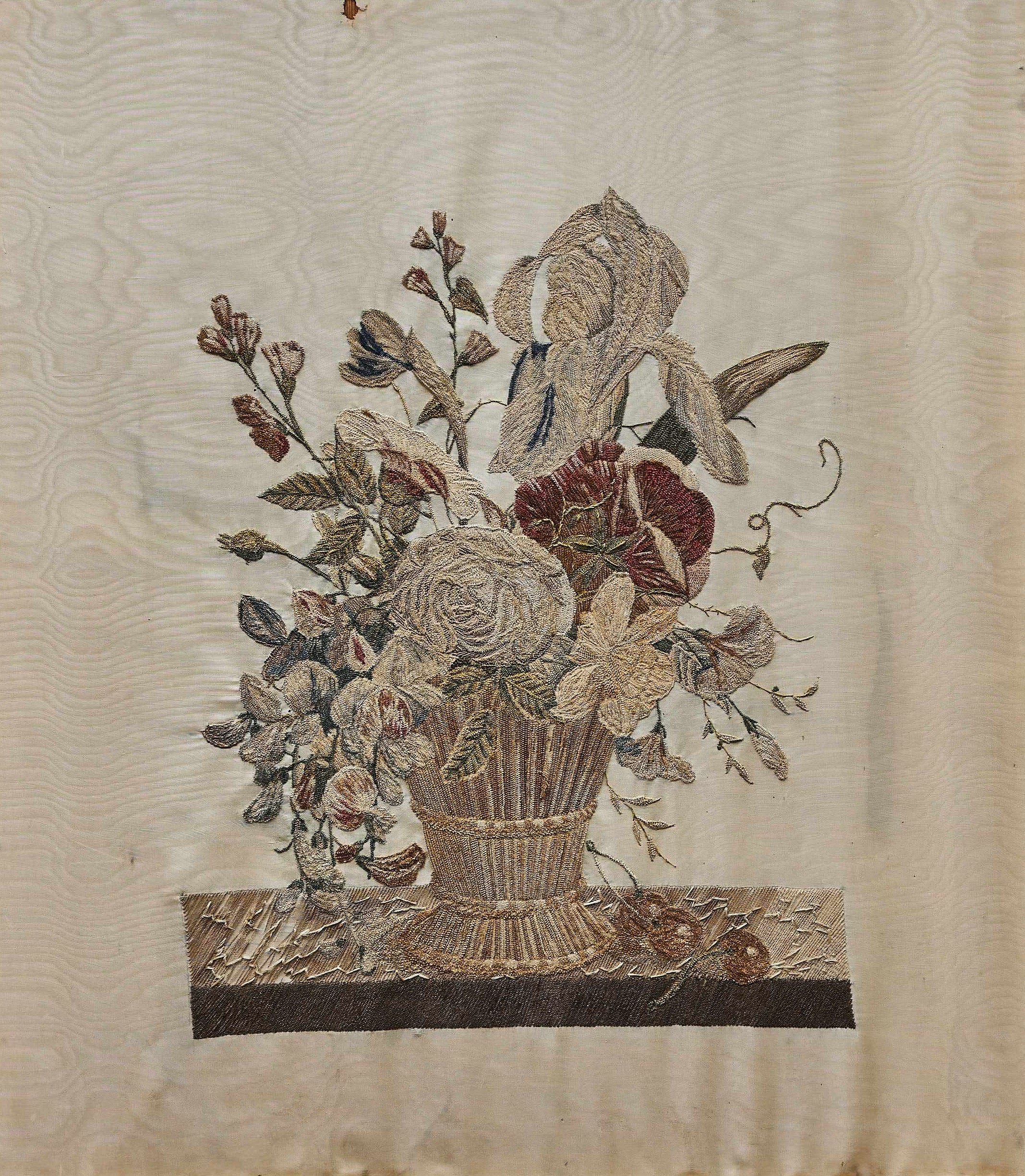 Ručně vyšívaný obraz na hedvábí. Jemná práce s krásnými detaily. Původní zlacený rám s černým lemováním.