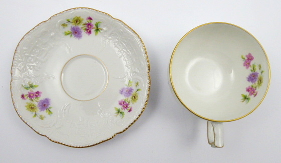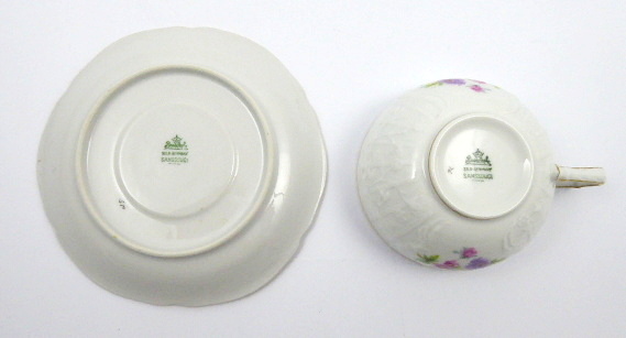 Bílý, barevný a zlacený porcelán. V rokokovém stylu. Porcelánka Rosenthal. Název vzoru: Sanssouci. Tento vzor vznikl v letech 1890 až 1900. Zejména byl používán ve 20. a 30. letech minulého století, ale různé jeho varianty se objevily i ve druhé polovině minulého století. Šálek s podšálkem z bílého porcelánu zdobený pestrobarevnými květinovými vazbami a pro vzor Sanssouci typickým rokokovým reliéfem jemných propletených linek, mřížkování a florálních motivů. Zlacené linky i řetízkový okraj podšálku. Značeno zespodu: firemní značka, název vzoru SANSSOUCI a značka malíře. Německo, Selb, po roce 1946. Výška šálku 5 cm, průměr podšálku 14,5 cm.