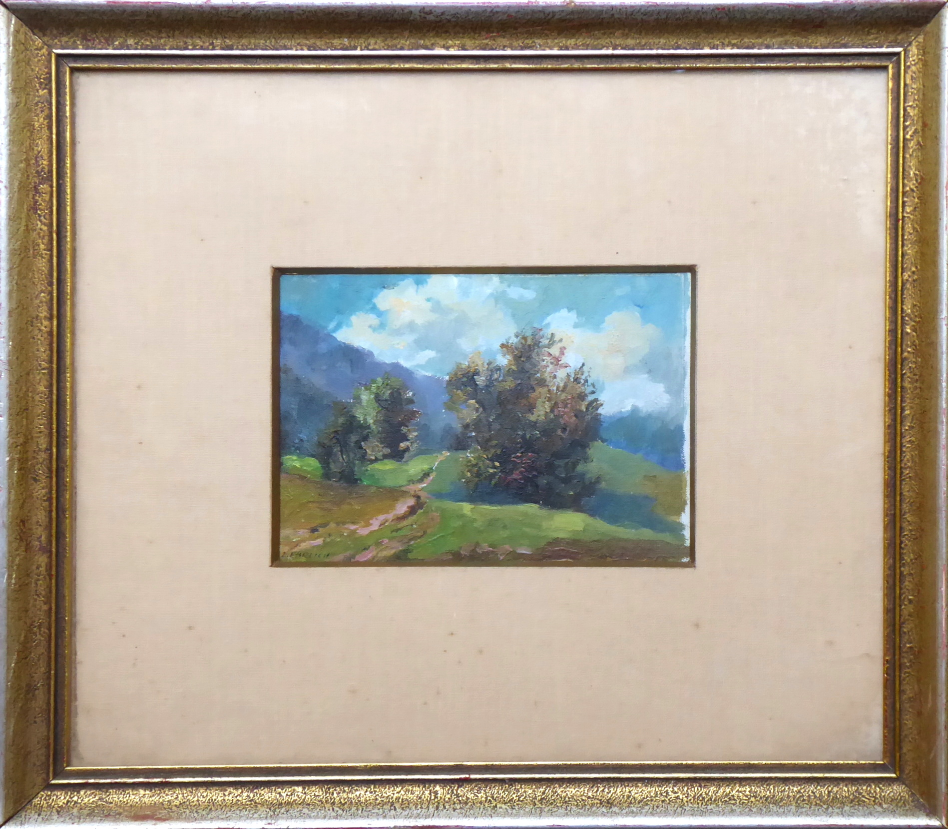 Olej na plátně fixovaném na kartonu 10,5 cm x 15 cm. Autor: Ladislav Ehrlich (1886-1965). Signováno vlevo dole: L. EHRLICH. Vzadu razítko autora: LÁĎA EHRLICH, AKAD. MALÍŘ, PRAHA XII, ŘIPSKÁ 9. Za polojasného letního dne cestičkou mezi remízky a poli. Ve stříbřito zlatém patinovaném rámu se sklem. Československo 1925 – 1945. Celkový rozměr s rámem 29 cm x 33,5 cm.