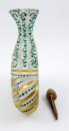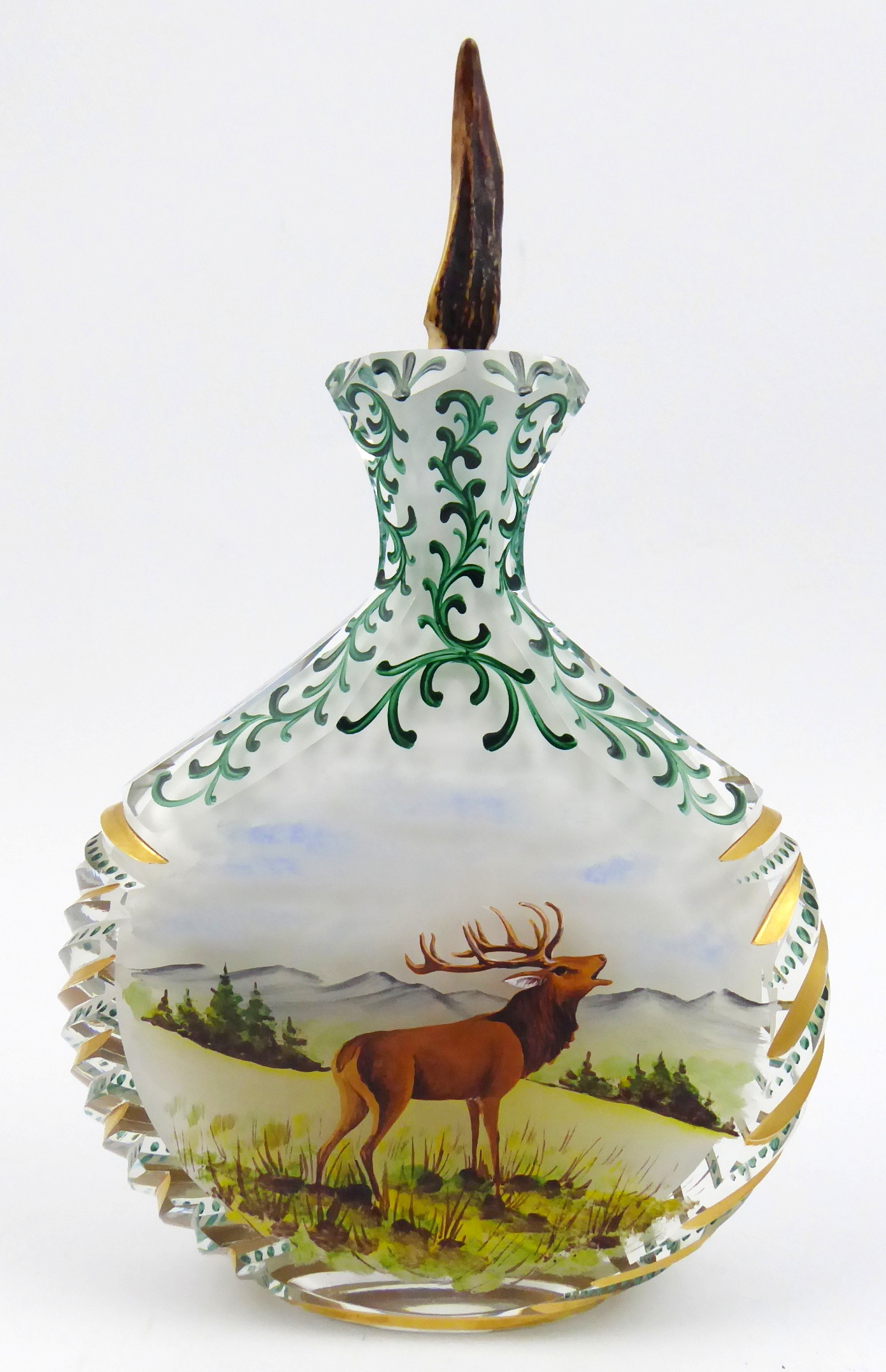 Bezbarvé ručně broušené sklo s jádrem ze skla mléčného, ruční malba emailovými barvami, zlacení, parůžek, korek. Skleněná láhev ve tvaru čutory na myslivecký šnaps. Láhev je z bezbarvého ručně broušeného skla s jádrem ze skla mléčného. Centrálním motivem je ručně emailovými barvami malovaná postava jelena v říji na palouku uprostřed horské krajiny se stromy. Horní část lahve zdobí ornamenty stylizovaného jehličí a boční strany spolu se dnem pak zlacené linky. Jako zátka je použit korek, v němž je připevněn parůžek. Střední Evropa, minulé století. Výška 24,5 cm.