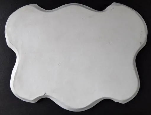 Porcelán bílý, malovaný, glazovaný. Bílý podnos ve tvaru kartuše, okraje reliéfně tvarované. Kalamář ve tvaru empírové sedačky, zelené barvy. Odnímatelné víčko, ve tvaru polštáře, s ležícím malým psíkem. Spodní část, kalamář, s dvěma nádobkami. Zbytky zlacení. Značený zespodu – Klášterec nad Ohří ( Klösterle ). Značka z období 1830 – 1895. Čechy 1860 – 1880. Výška 11 cm, šířka 26 cm.