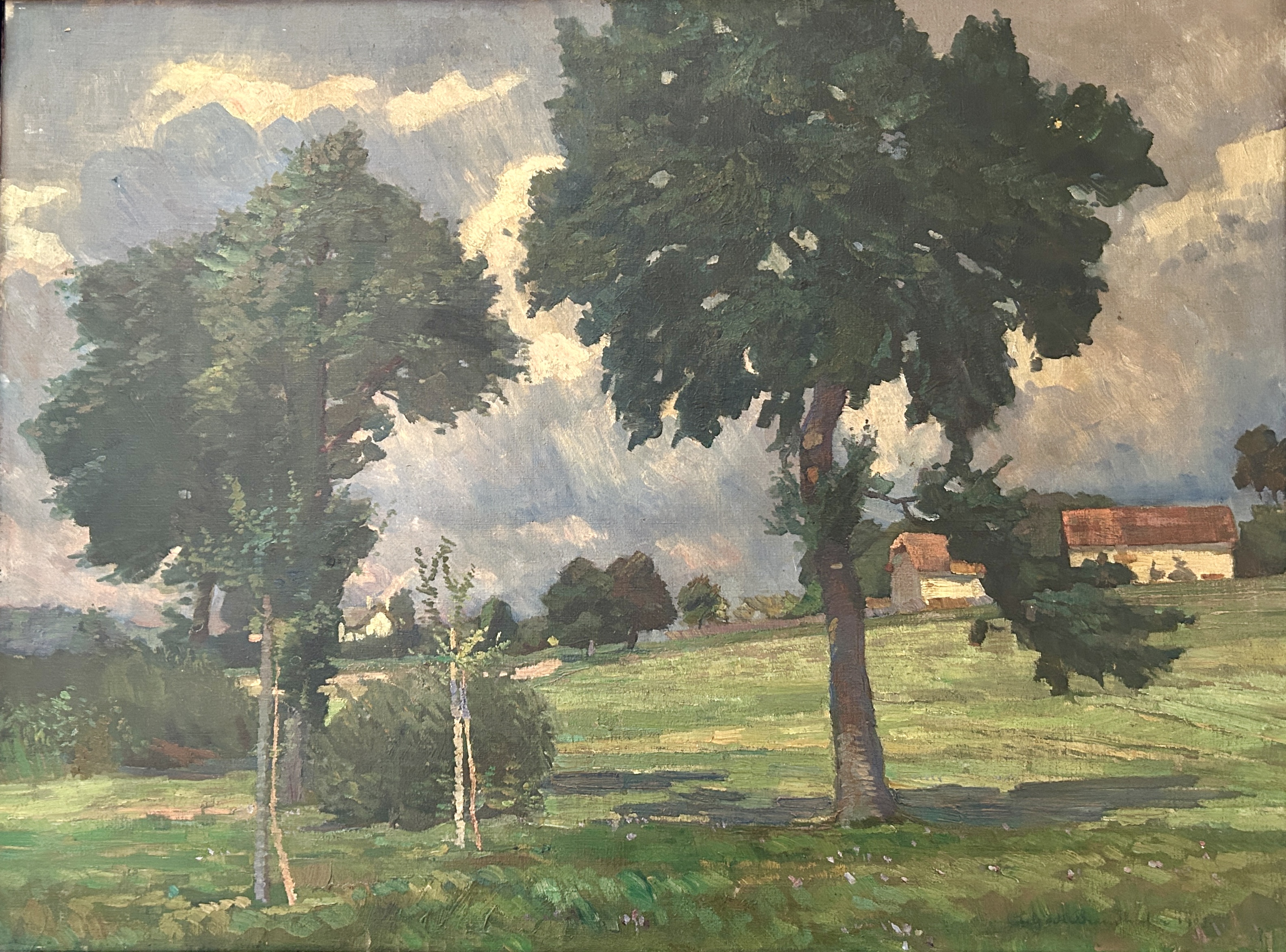Obraz s motivem krajiny se stavením od německo-české malířky Lili Gödlové-Brandhuberové. Přednímu plánu dominují dva vzrostlé listnaté stromy přesahující samotný výjev, při pravé straně v dálnějším zvýšeném terénu se nachází za osvětlenou louku hospodářské stavení, levá strana zachycuje hlubší pohled do krajiny v popředí s křovinatým porostem a malou břízkou. Expresivnější technika s lehkým impresionistickým laděním klade umírněně pozornost na světelnou hru patrnou zejména v pastvině, korunách stromů a dramatické obloze, díky věrohodnému zachycení denního světla se autorce podařil vytvořit klidný dojem s jistou mírou dějovosti. Barevná paleta využívá převážně zemitějších zelených a modrých tónů zpestřených bílou a hnědou.