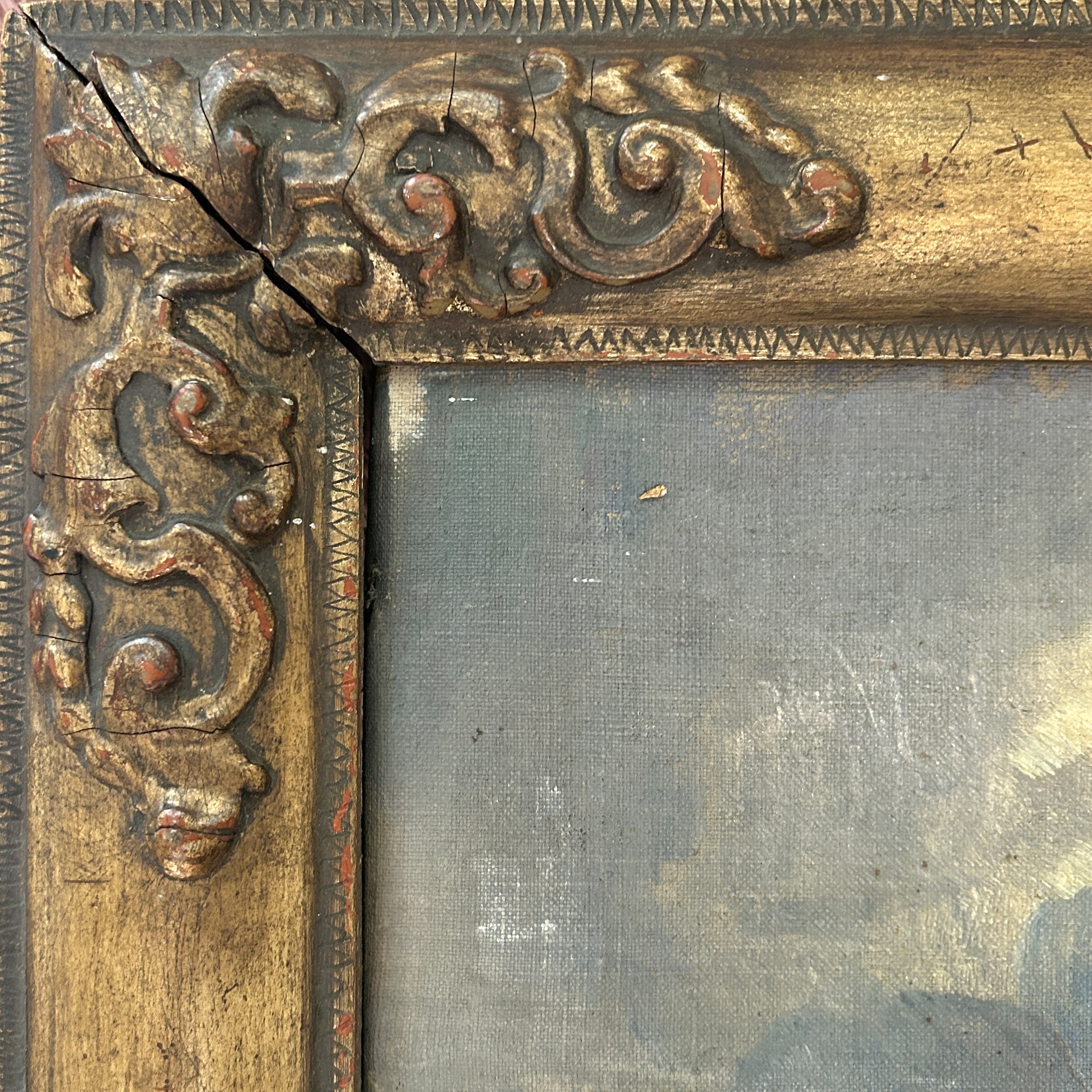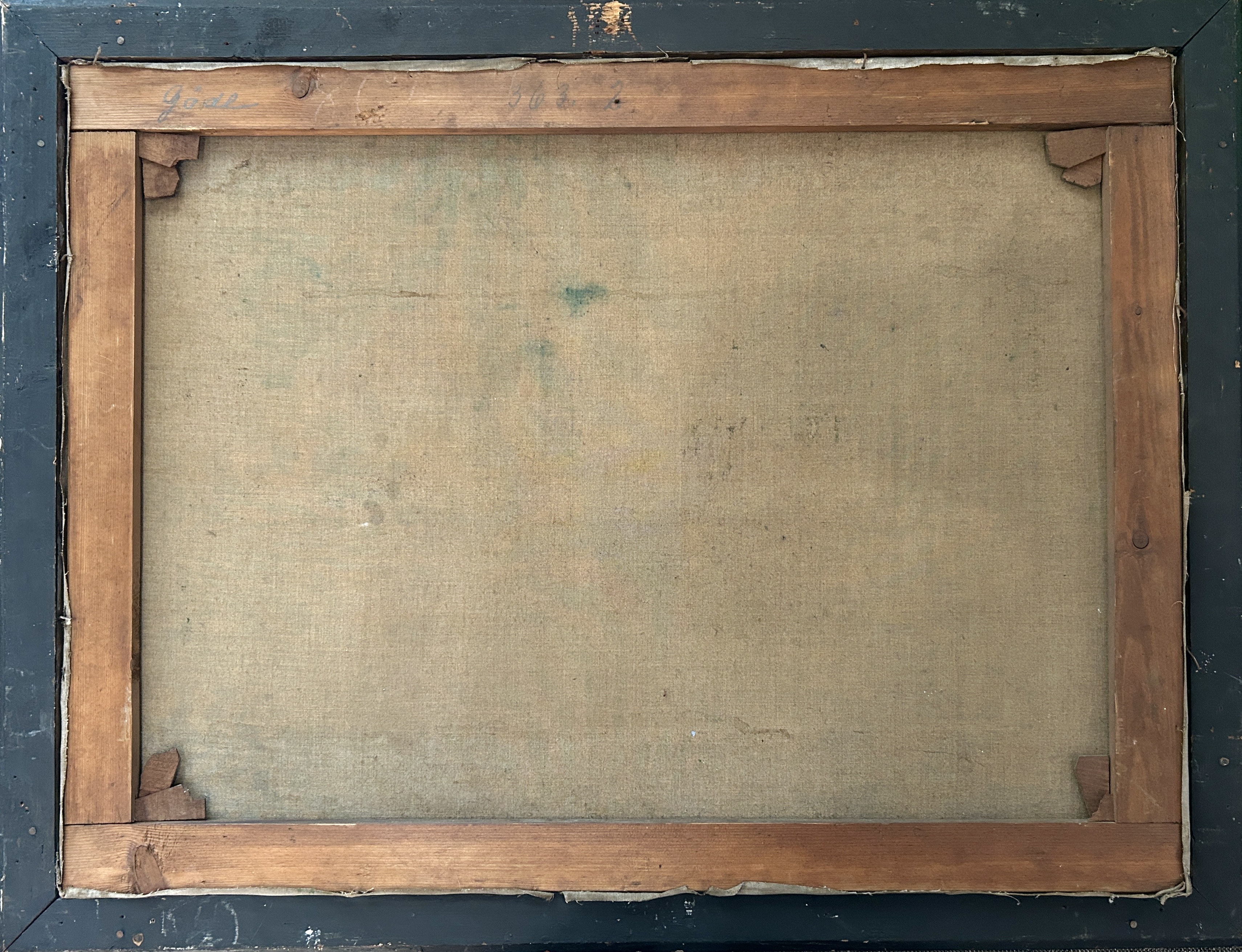 Olej na plátně, rámováno ve zlaceném rámu s dekorativními ornamentálními aplikacemi. Signováno vpravo dole „Lili G. Brandhuber 1901“. Výška s rámem 69,5 cm, délka 90 cm, plátno o výšce 60 cm, délka 80 cm. Malba nečištěna, jinak v zachovalém stavu; blindrám v ozdobném rámu volnější, rám s menšími defekty, chybí skoba pro zavěšení.