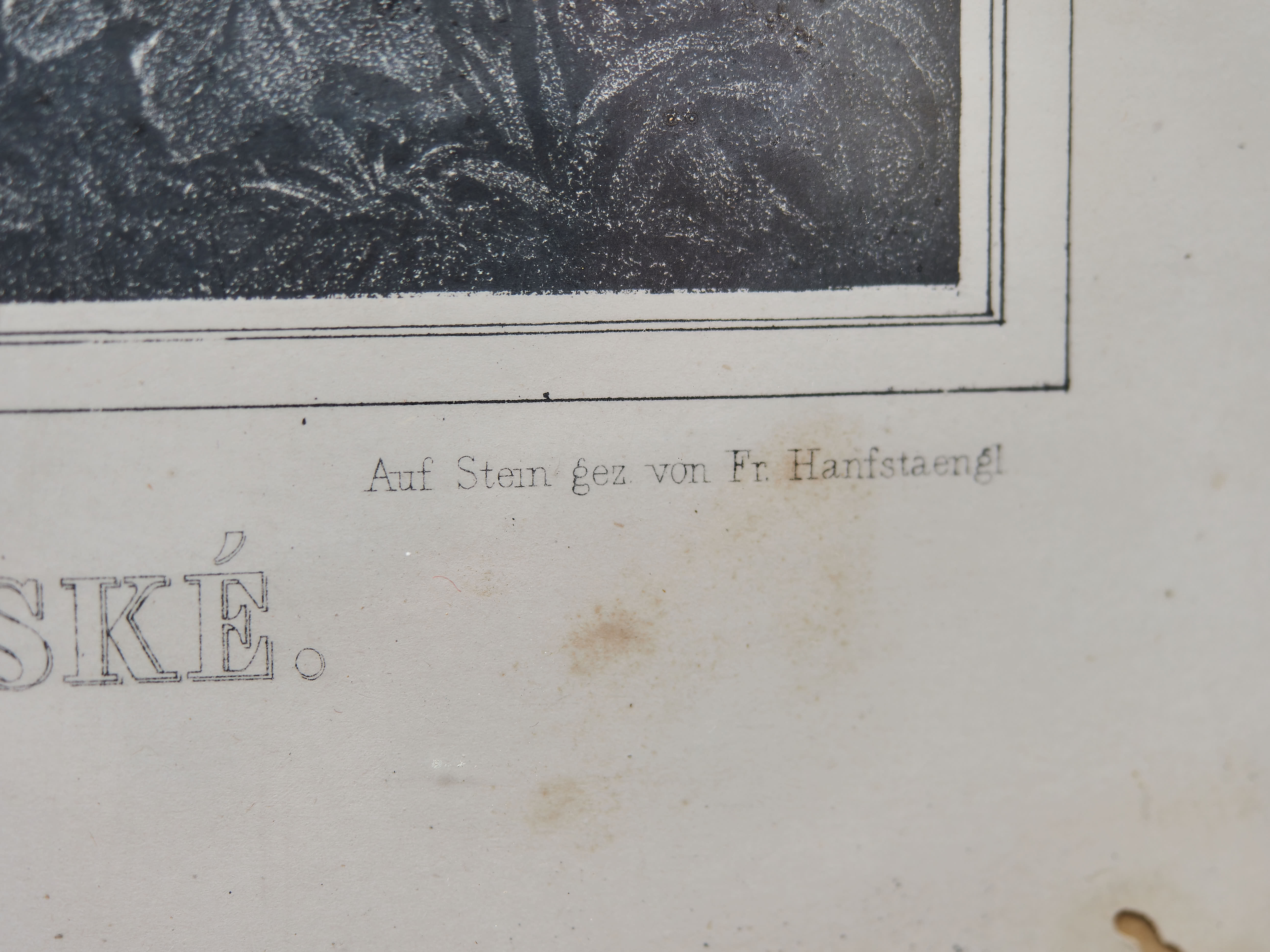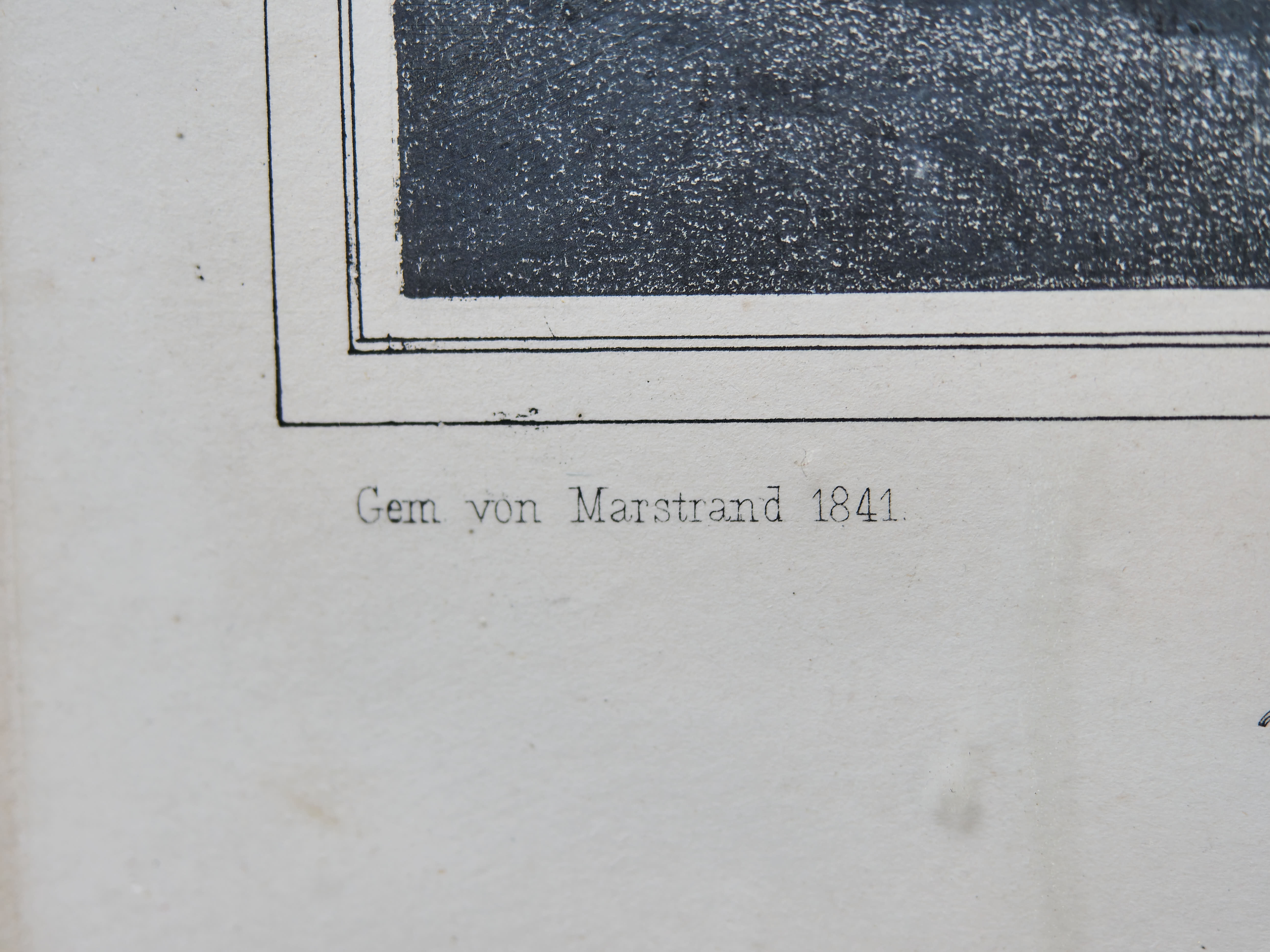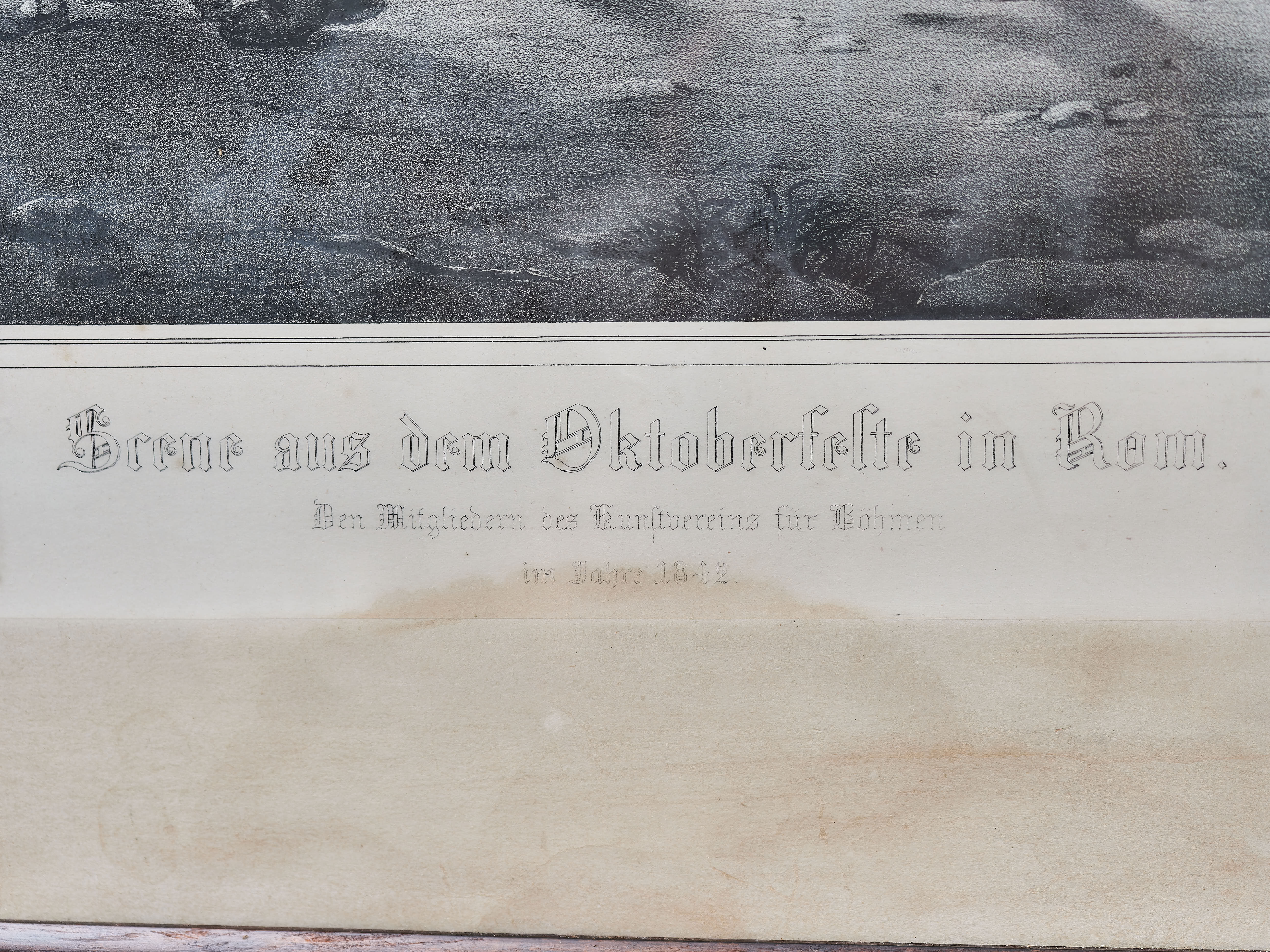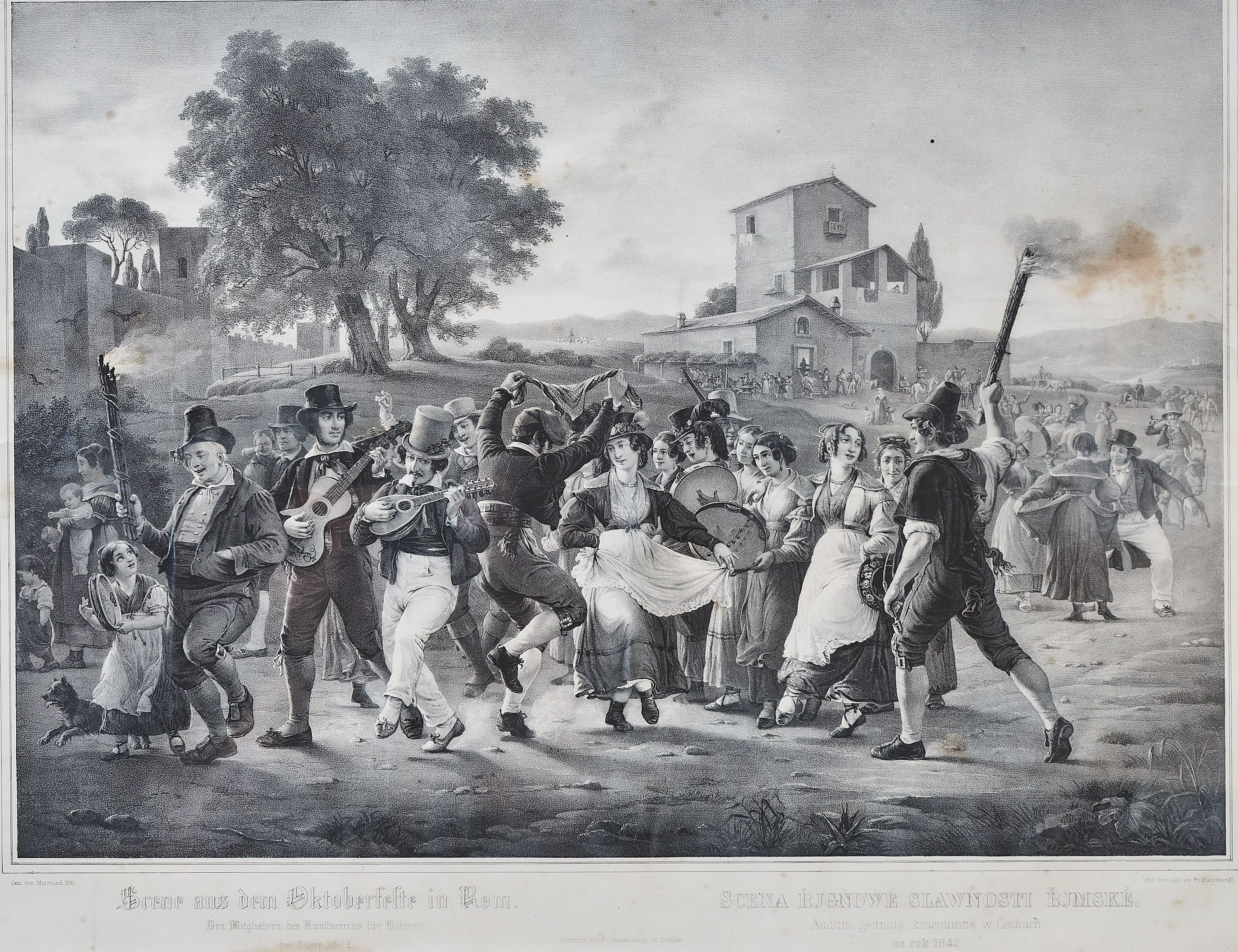Originální litografie s názvem „Scena říjnové slavnosti římské“ podle obrazu dánského malíře Wilhelma Marstranda z roku 1841. Tisk vznikl roku 1842 v dílně významného německého litografa Franze Hanfstaengla v Drážďanech. Kompozice zachycuje živou pouliční scénu s tancem, hudbou a veselím, která je typickým příkladem romantického zájmu o lidové slavnosti a žánrové výjevy. Litografie je opatřena nápisy v němčině i češtině a je zasazena do dobového rámu se zadní deskou. Na listu jsou patrné stopy stáří a mírné skvrny, které však neubírají na historické hodnotě.