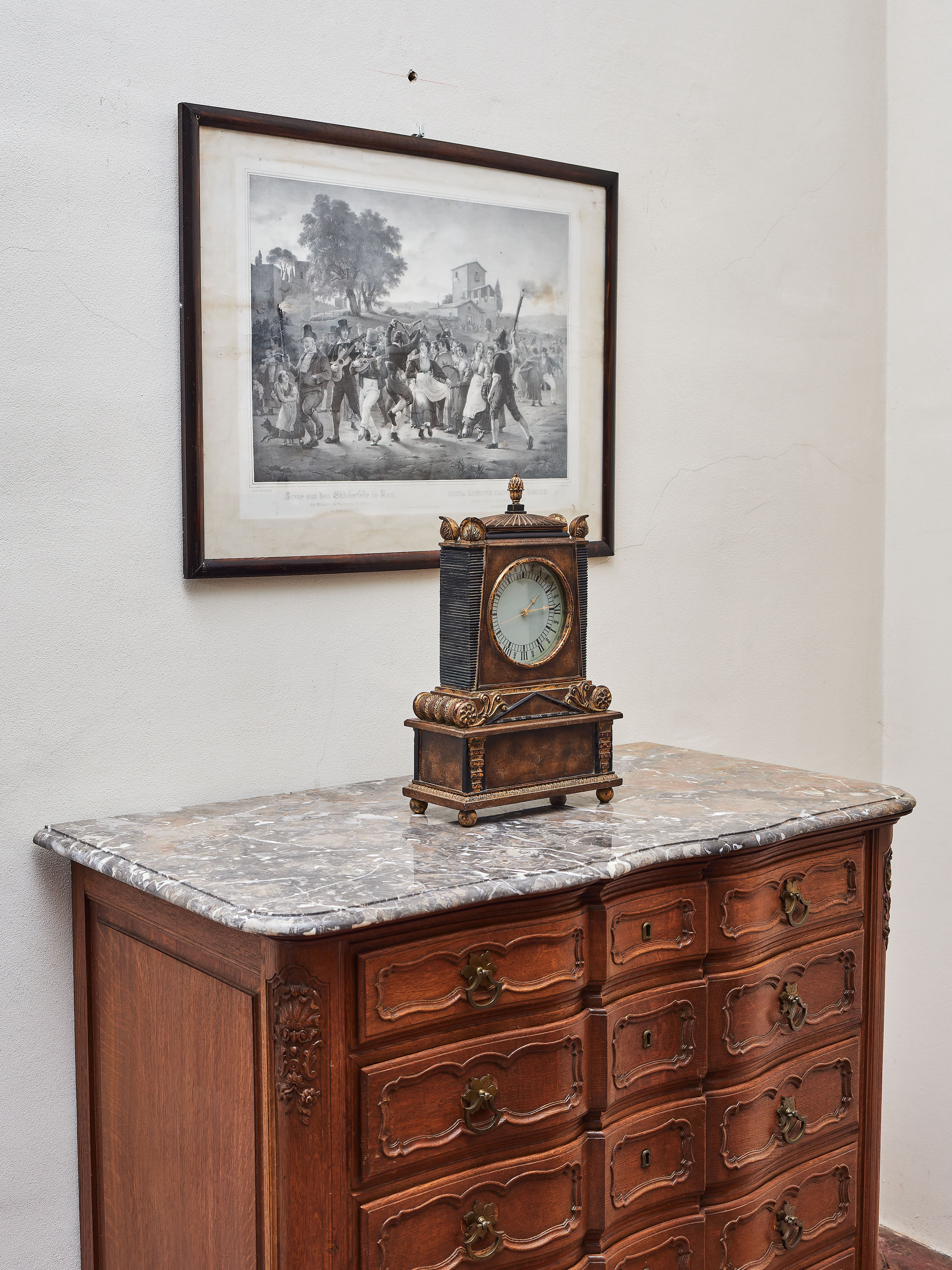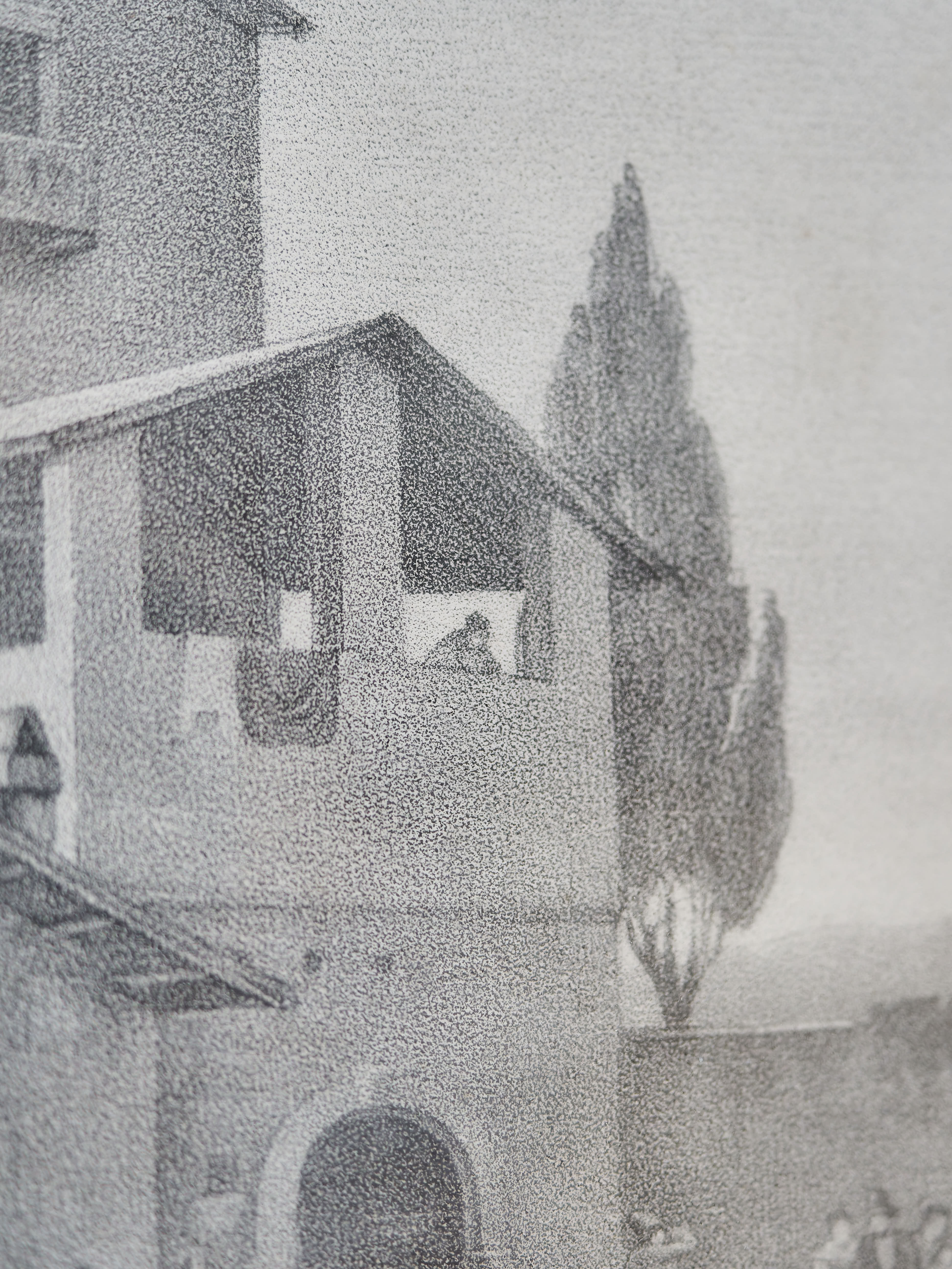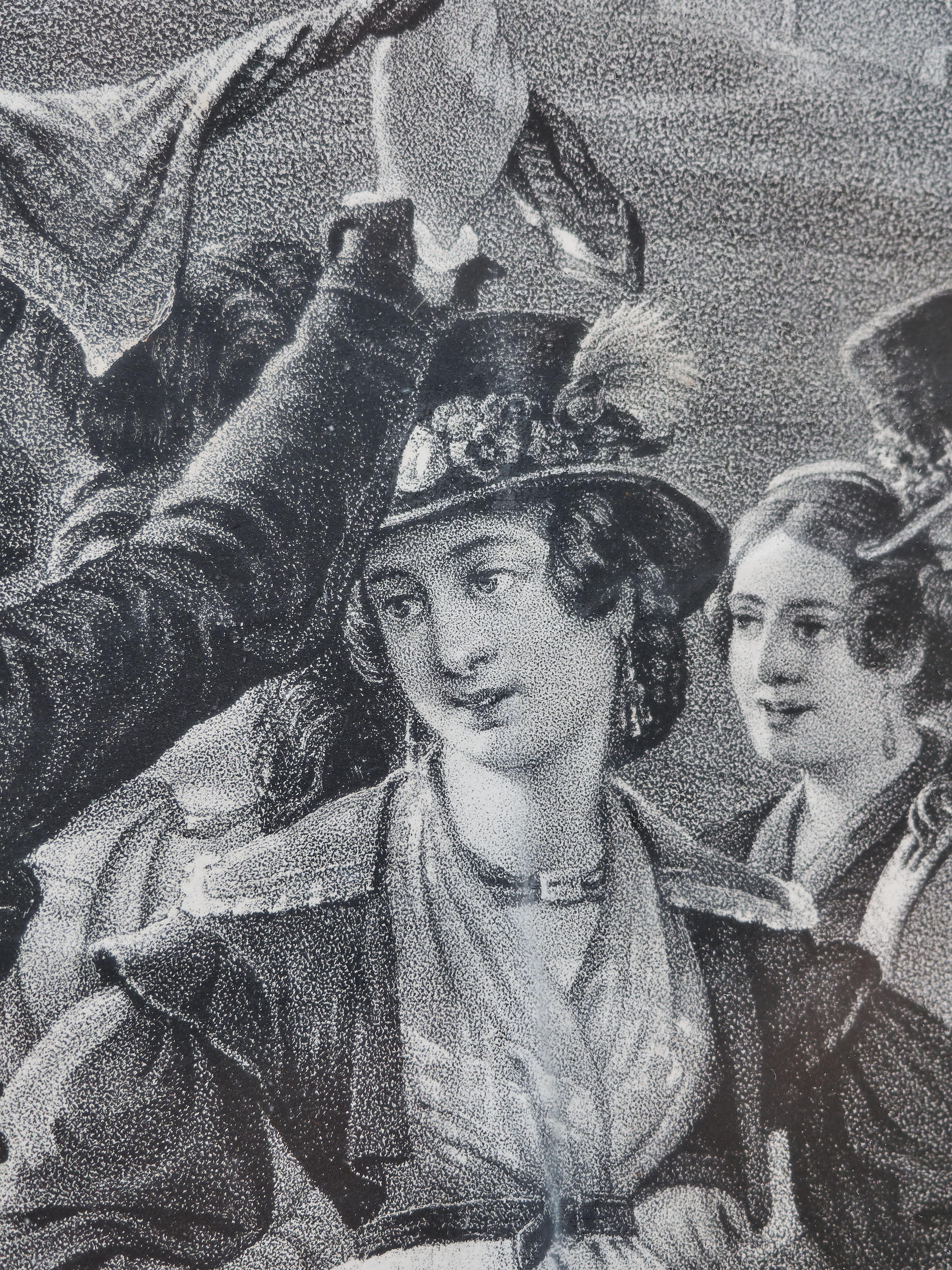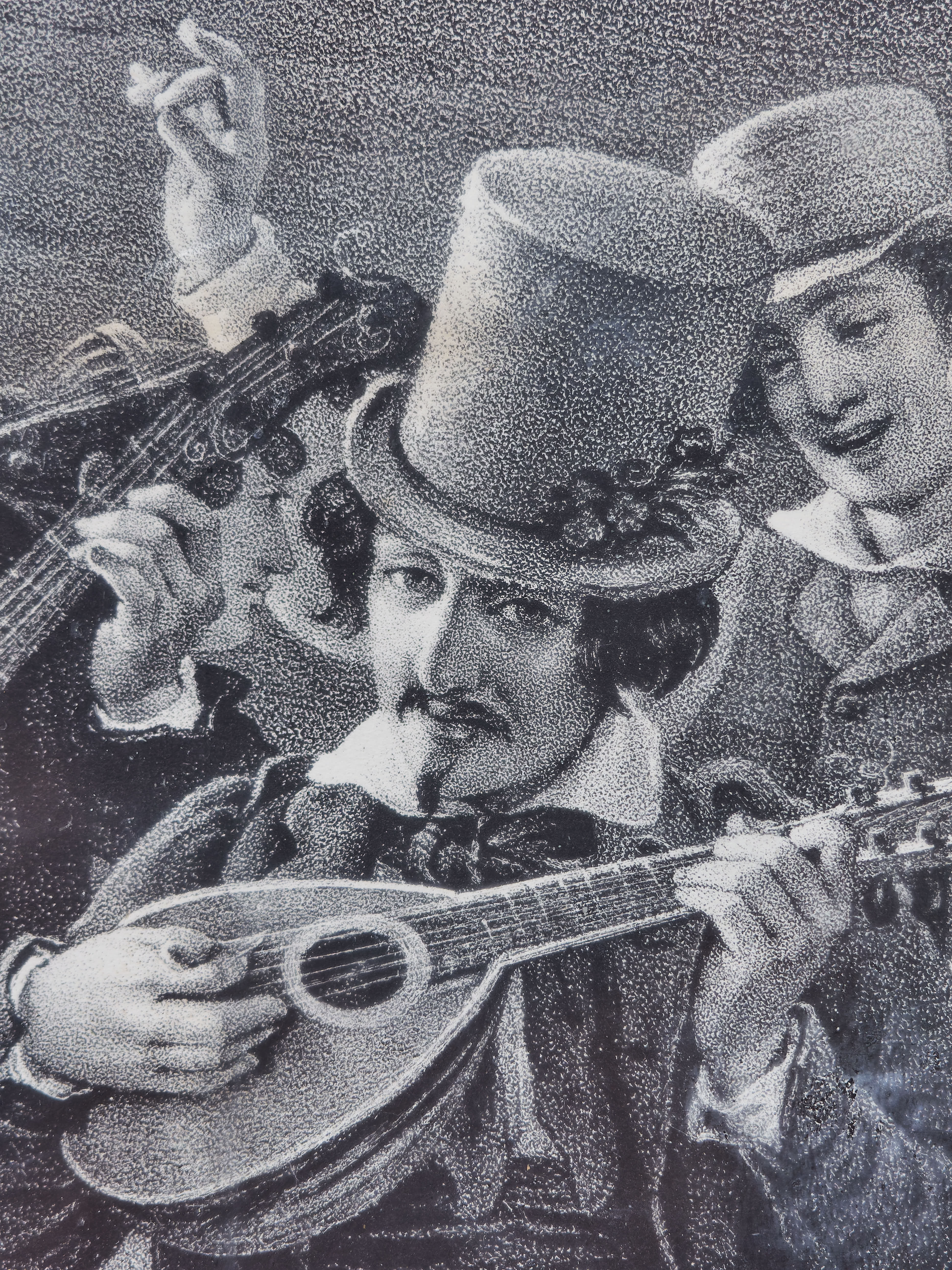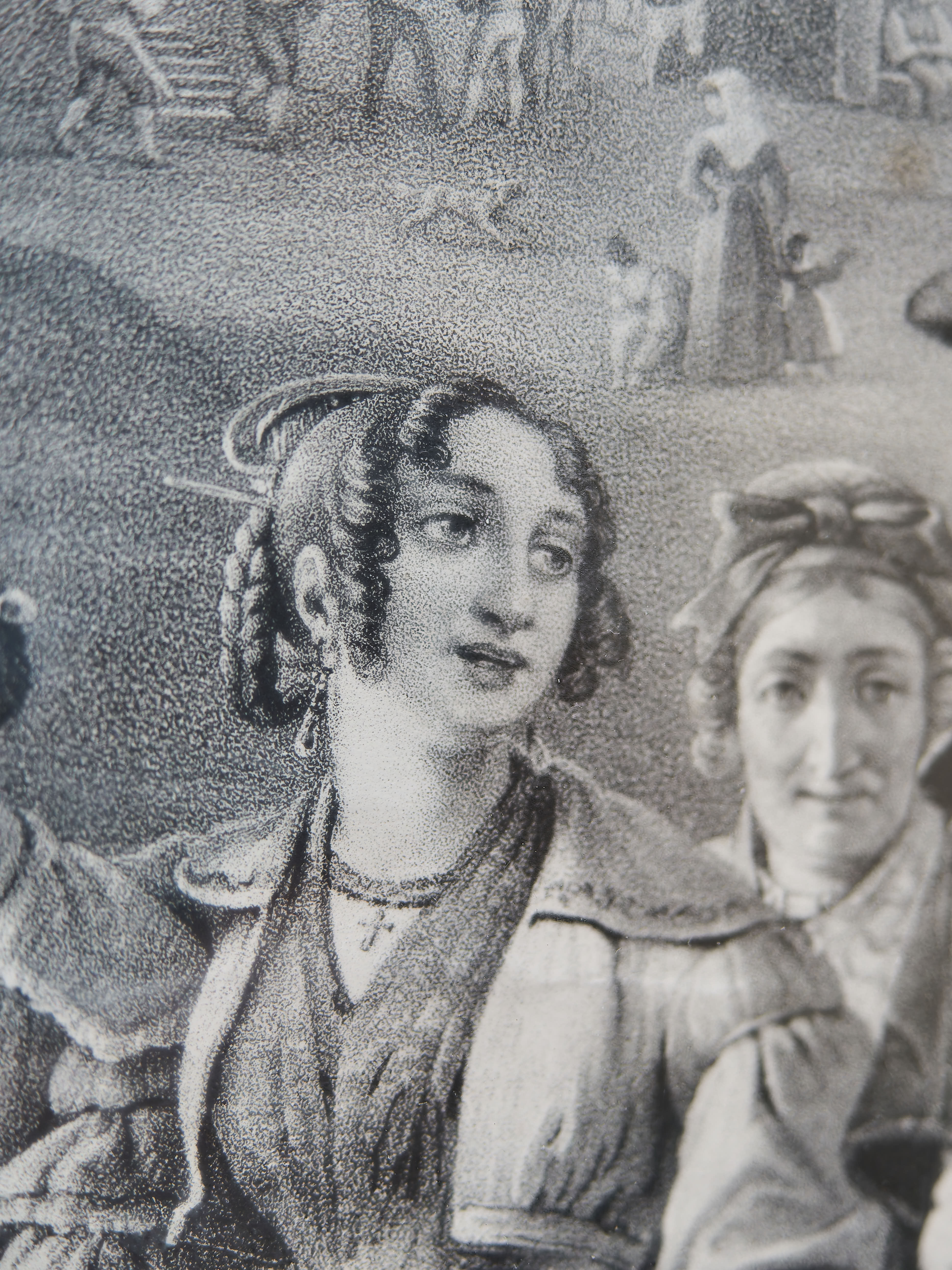 Originální litografie s názvem „Scena říjnové slavnosti římské“ podle obrazu dánského malíře Wilhelma Marstranda z roku 1841. Tisk vznikl roku 1842 v dílně významného německého litografa Franze Hanfstaengla v Drážďanech. Kompozice zachycuje živou pouliční scénu s tancem, hudbou a veselím, která je typickým příkladem romantického zájmu o lidové slavnosti a žánrové výjevy. Litografie je opatřena nápisy v němčině i češtině a je zasazena do dobového rámu se zadní deskou. Na listu jsou patrné stopy stáří a mírné skvrny, které však neubírají na historické hodnotě.