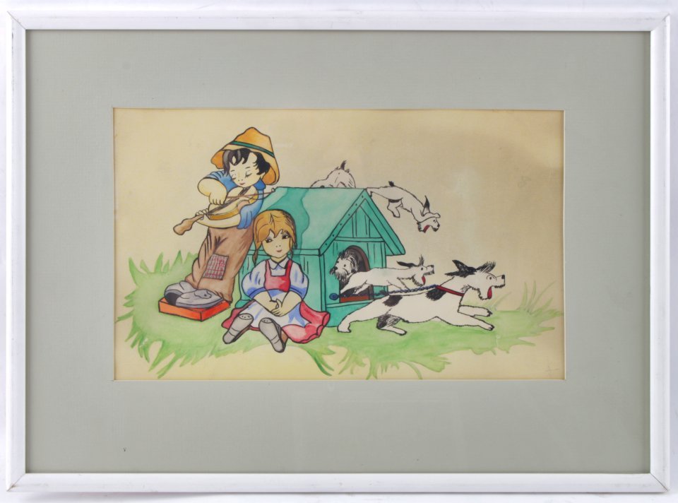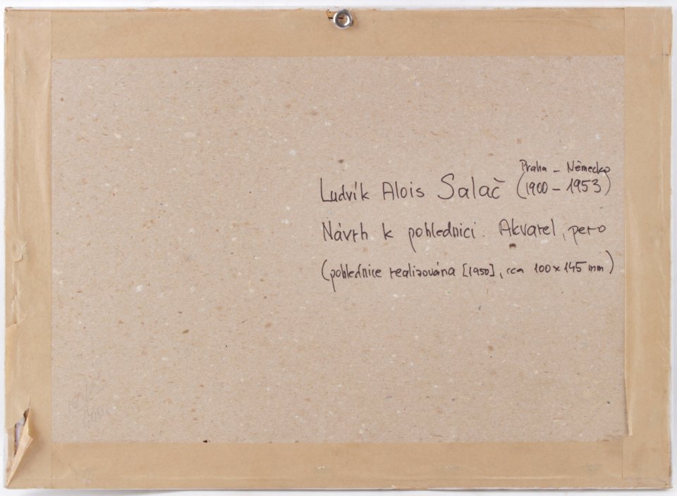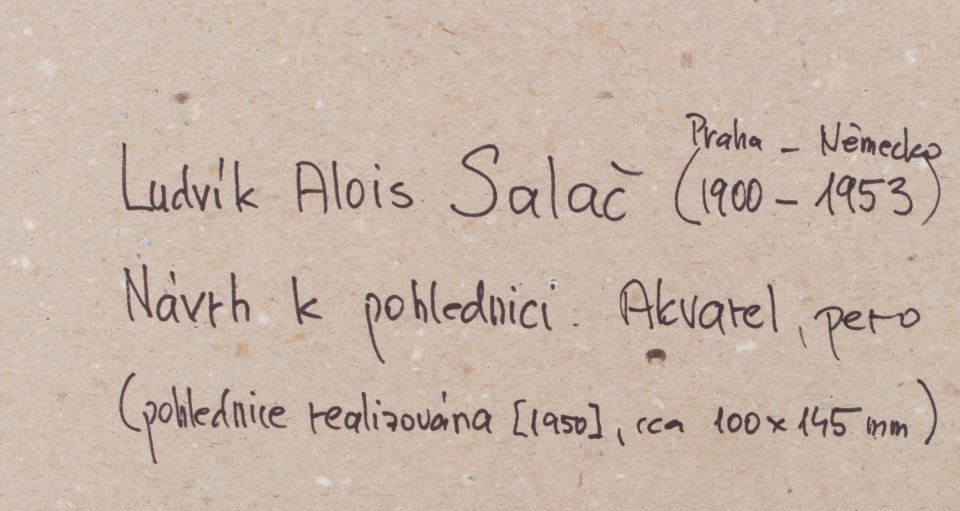 Akvarel na papíře od Ludvíka Aloise Salače. Jedná se o návrh pohlednice (pohlednice realizována 1950 v rozměru cca. 100 x 145 mm) z roku 1950. Nesignováno. Rámováno a paspartováno.