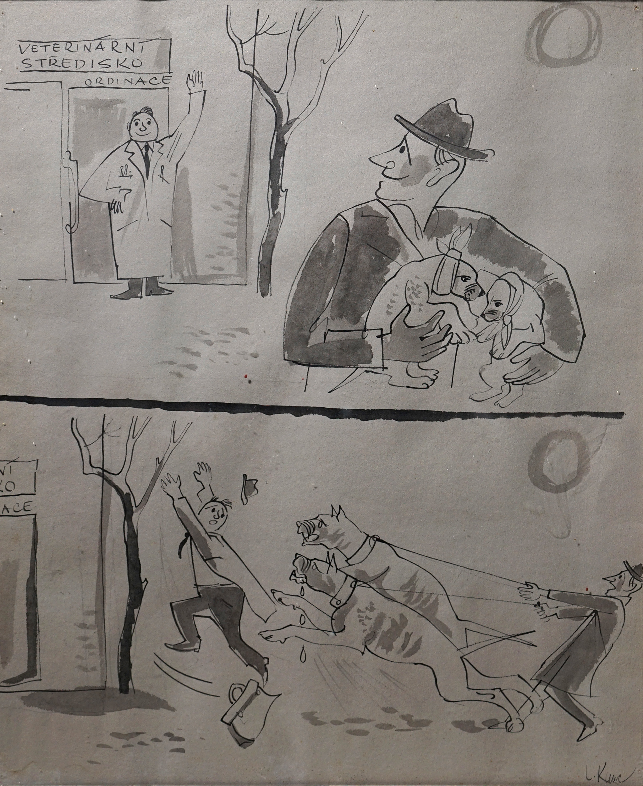 Technika: Kresba tuší Výška: 55 cm, šířka: 45 cm, rámování: 57,3 x 47,3 cm Stav: Mírně poškozeno Signatura: signováno