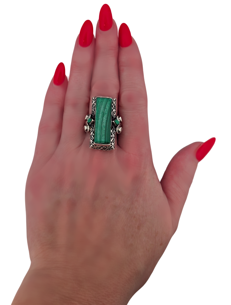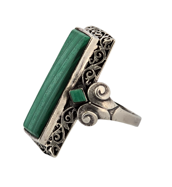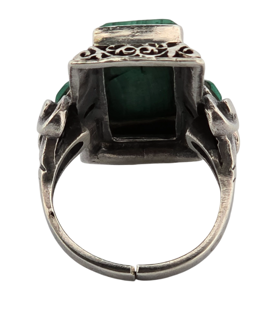 Popis: Luxusní masivní art deco starožitný prsten, ze stříbra, zdoben vyřezávanými ozdobnými ornamenty. Vykládaný velkým malachitem a dvěma menšími malachity. Prsten má variabilní velikost (obruba není na pevno – viz foto).