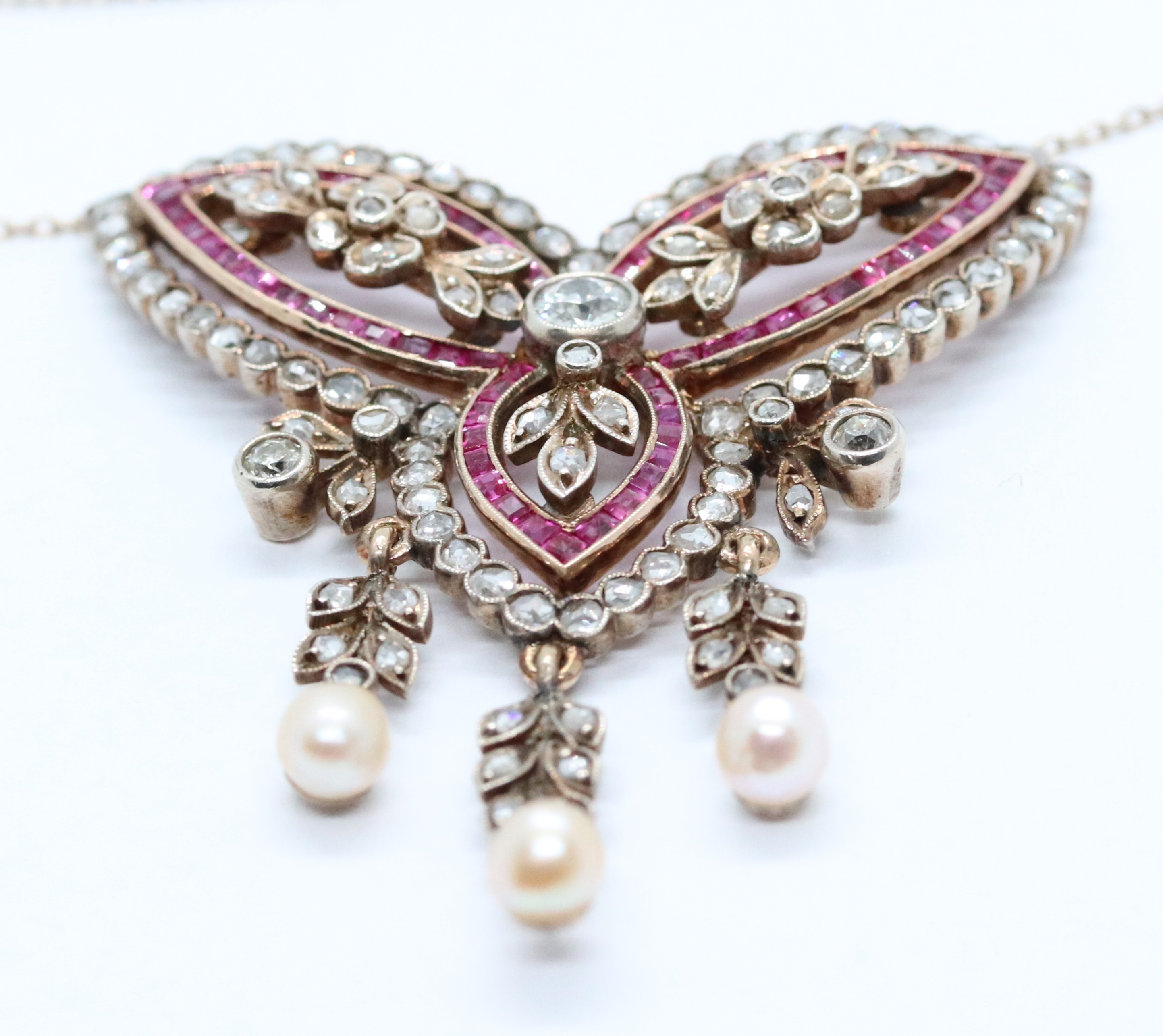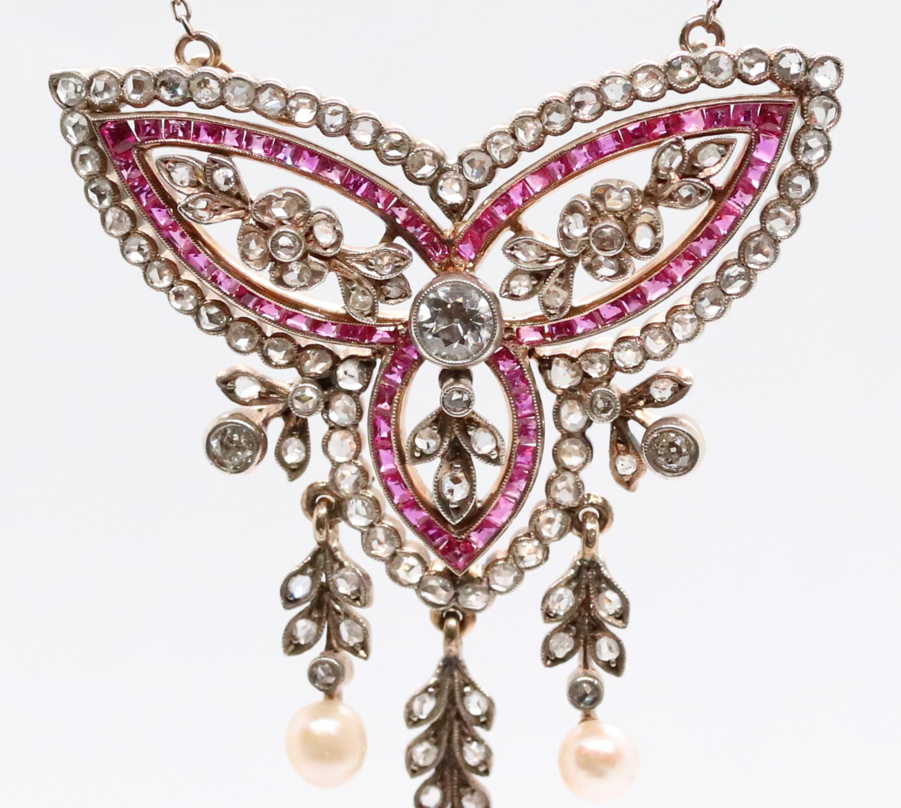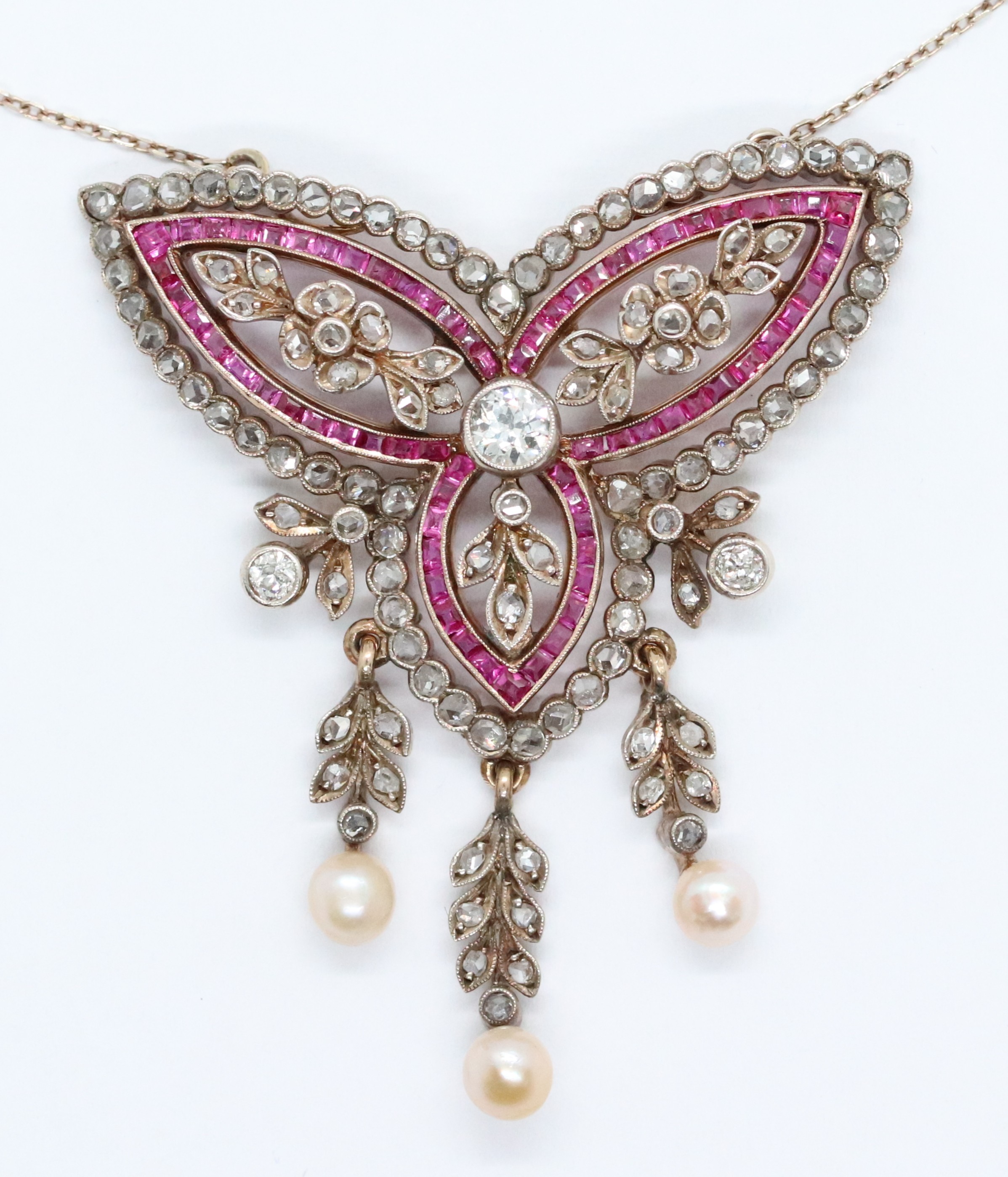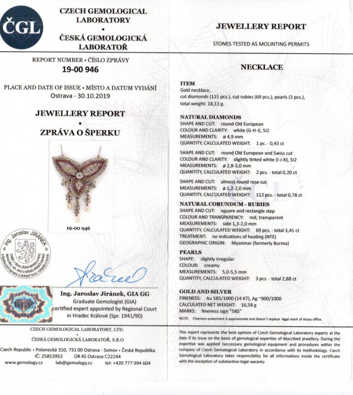 Velmi luxusní náhrdelník zdobený barmskými rubíny (Myanmar – Barma) nejvyšší kvality, diamanty a perlami. Náhrdelník je zlatý v kombinaci s řetízkem ze stříbra, Au+Ag btto 18,15g/585+500/925/1000. Dimanty starého evropského brusu a diamantové routy o celkové hmotnosti 0,75 ct, rubíny v počtu 69 ks o celkové hmotnosti 3,45 ct, tři perly v celkové hmotnosti 2,88 ct, kolem roku 1920; délka řetízku 40 cm, délka závěsu 6 cm, šířka závěsu 5 cm.
