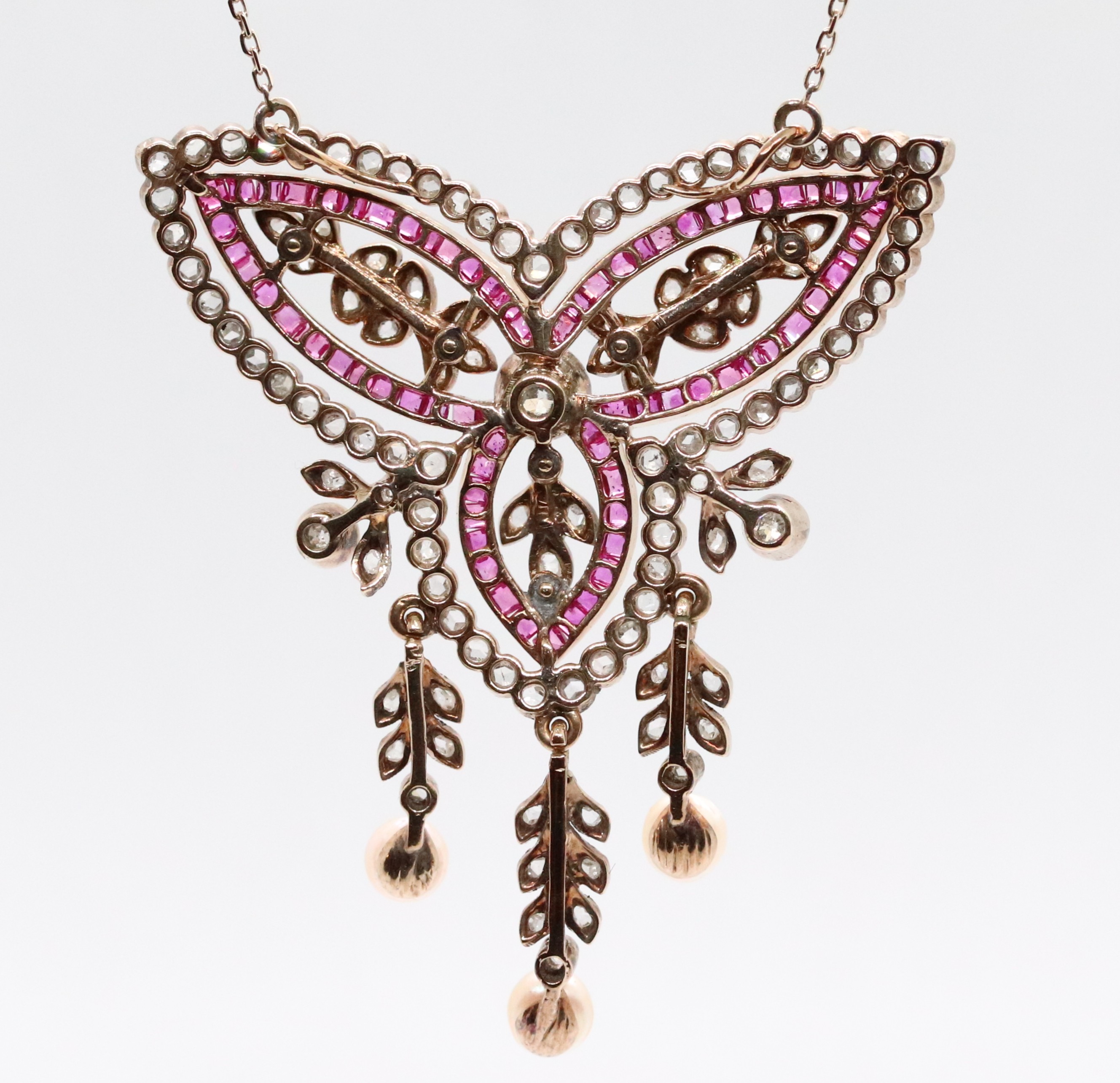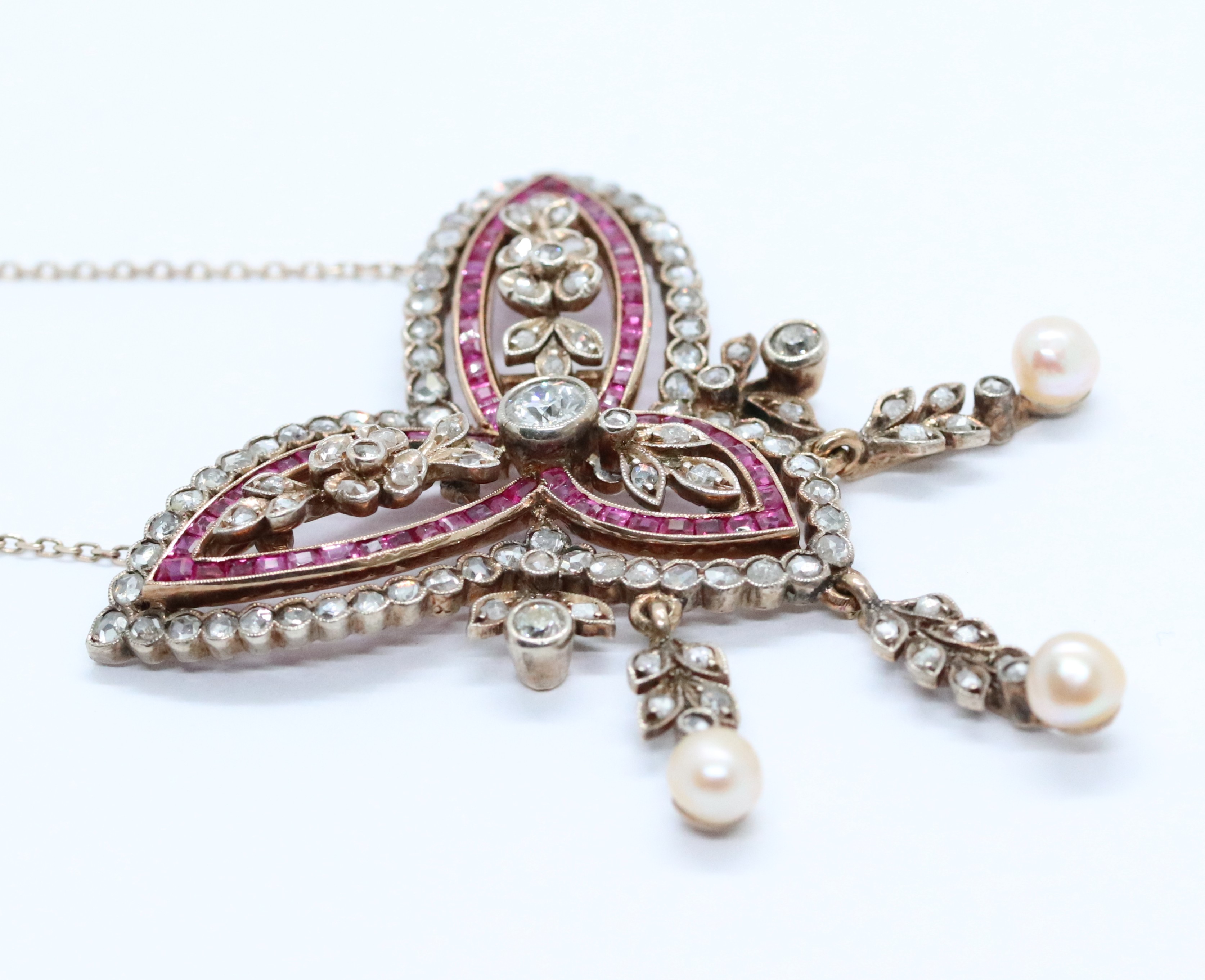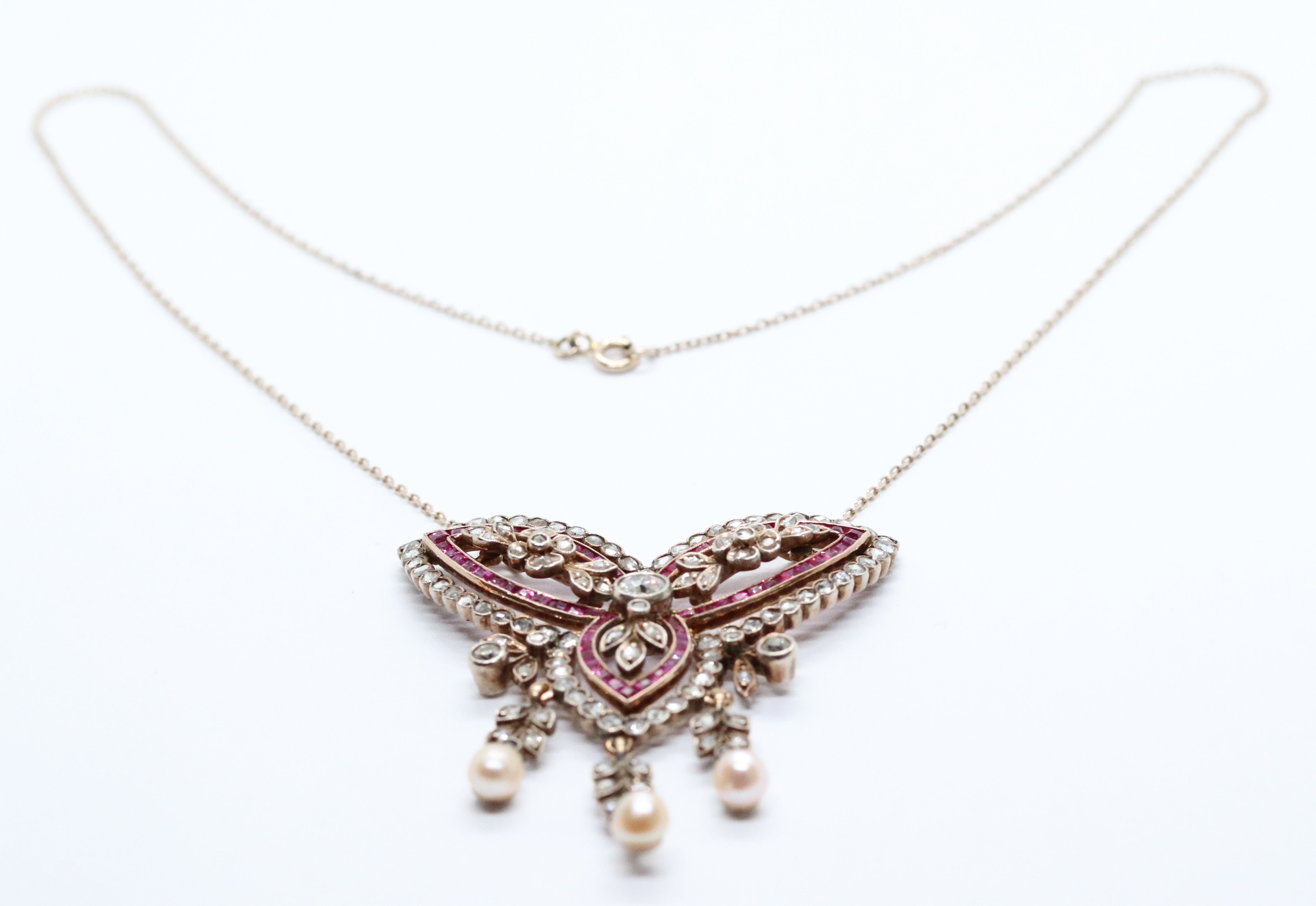 Velmi luxusní náhrdelník zdobený barmskými rubíny (Myanmar – Barma) nejvyšší kvality, diamanty a perlami. Náhrdelník je zlatý v kombinaci s řetízkem ze stříbra, Au+Ag btto 18,15g/585+500/925/1000. Dimanty starého evropského brusu a diamantové routy o celkové hmotnosti 0,75 ct, rubíny v počtu 69 ks o celkové hmotnosti 3,45 ct, tři perly v celkové hmotnosti 2,88 ct, kolem roku 1920; délka řetízku 40 cm, délka závěsu 6 cm, šířka závěsu 5 cm.