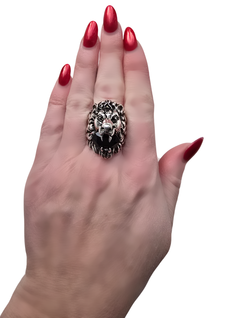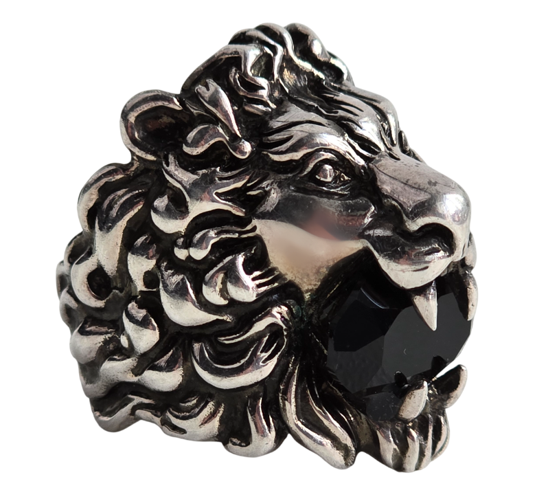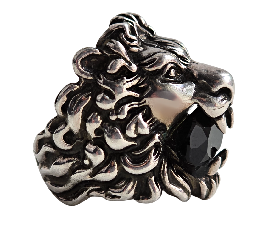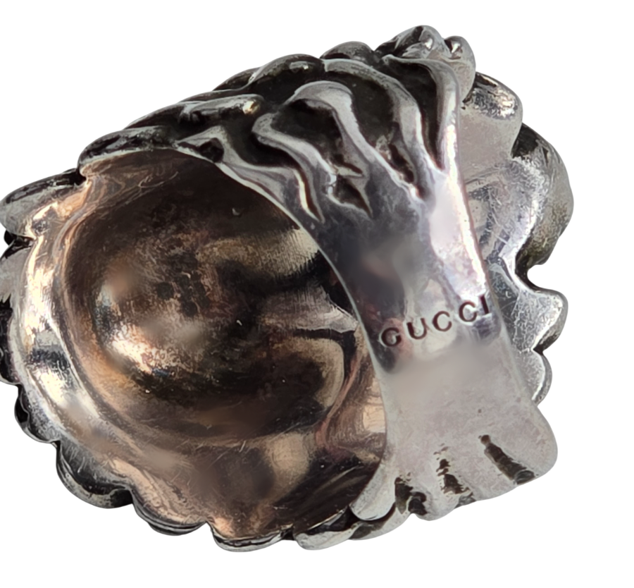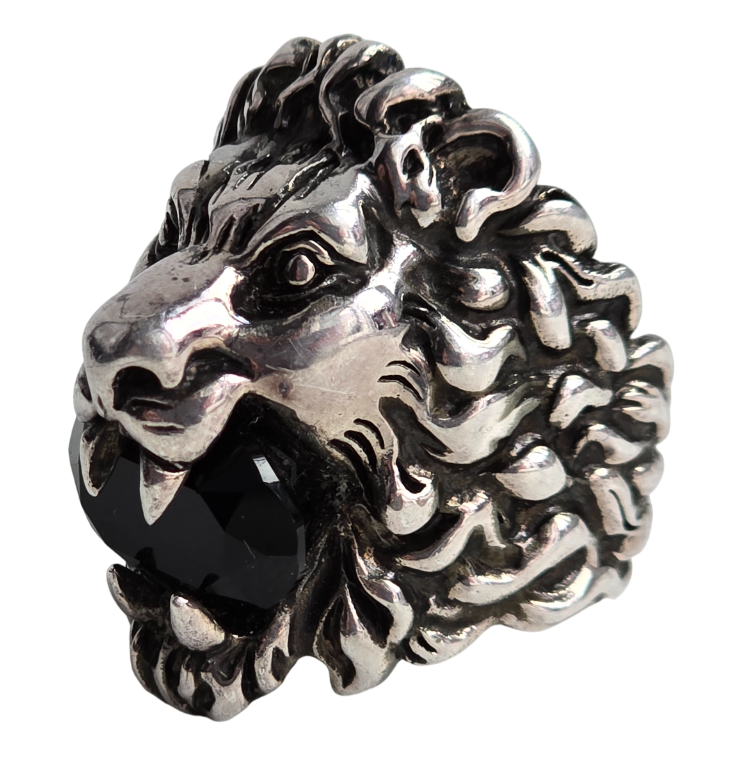 Popis: Luxusní robustní prsten zn. Gucci ve tvaru divoké šelmy. Velmi detailní a propracovaný. V zubech šelma drží broušený obsidián. Obecný kov. Na zadní straně prstenu vyražena signace GUCCI.