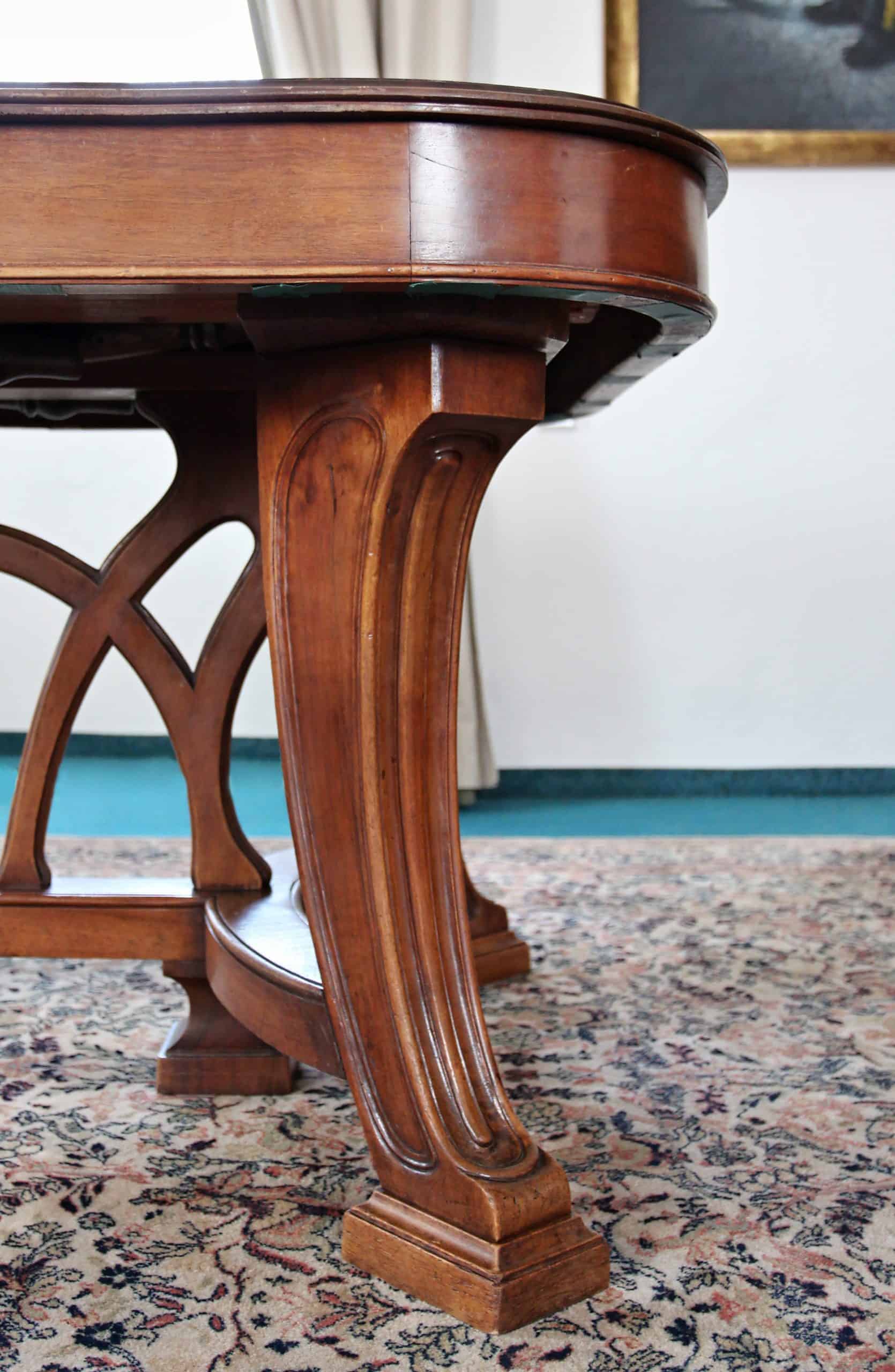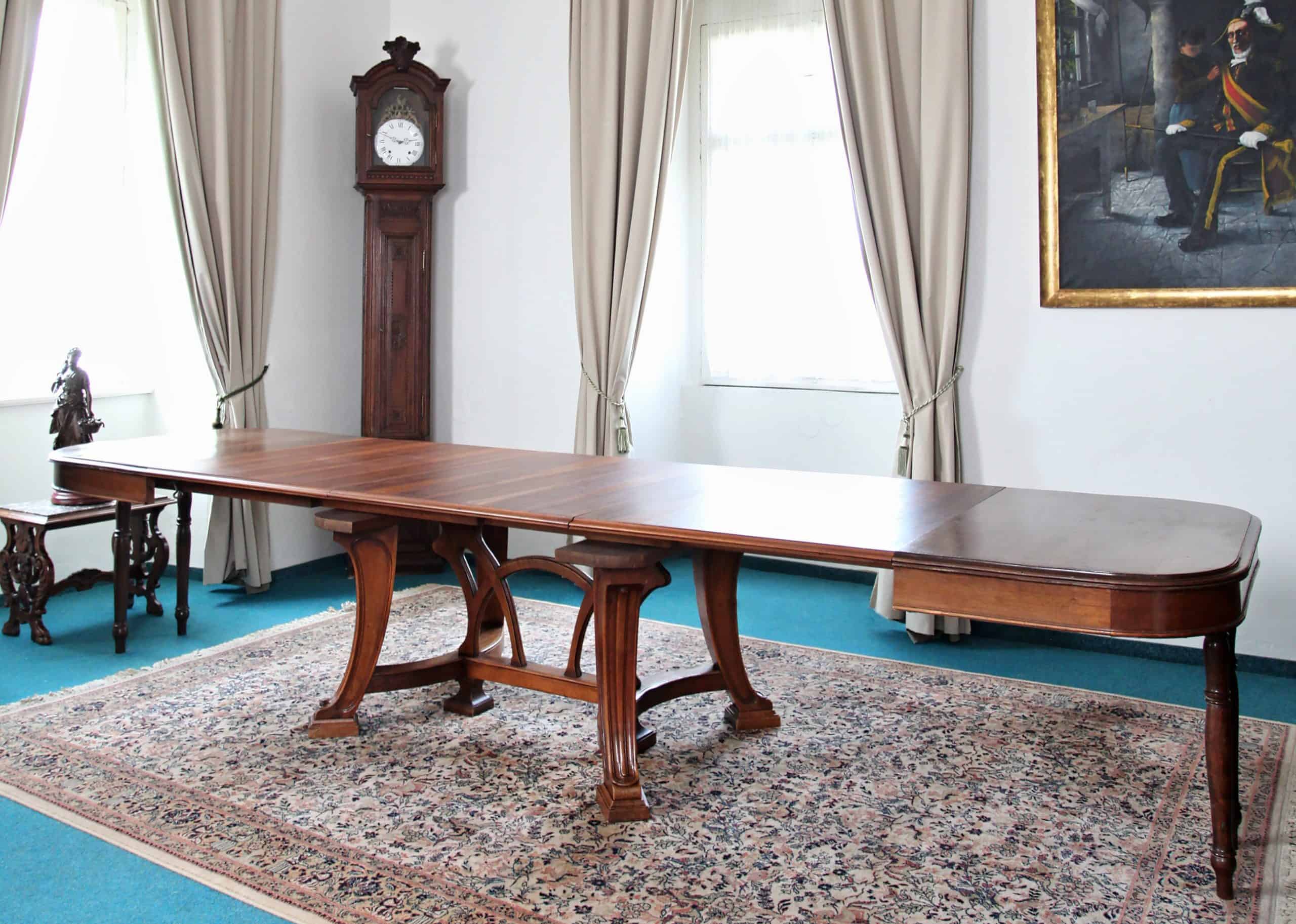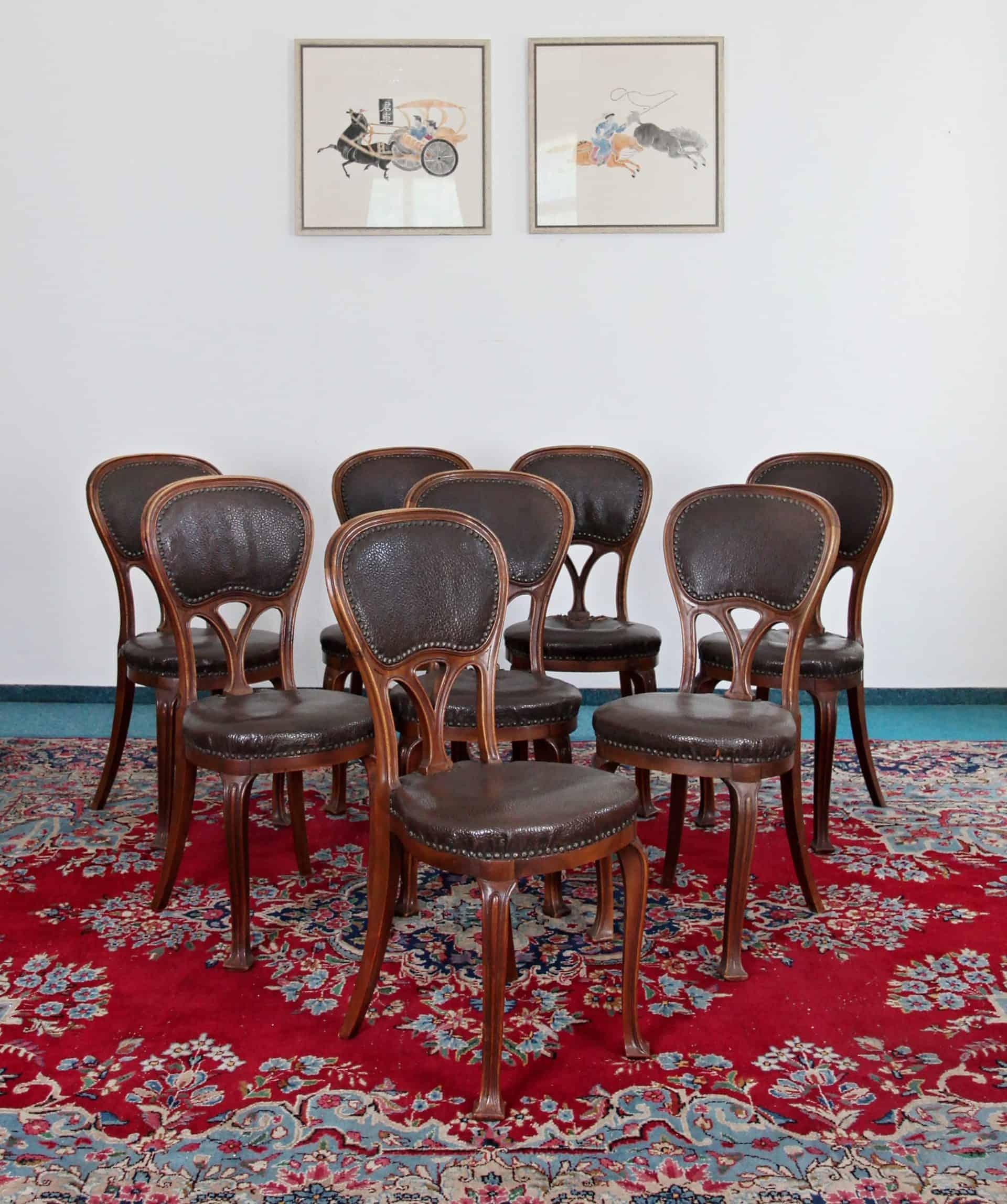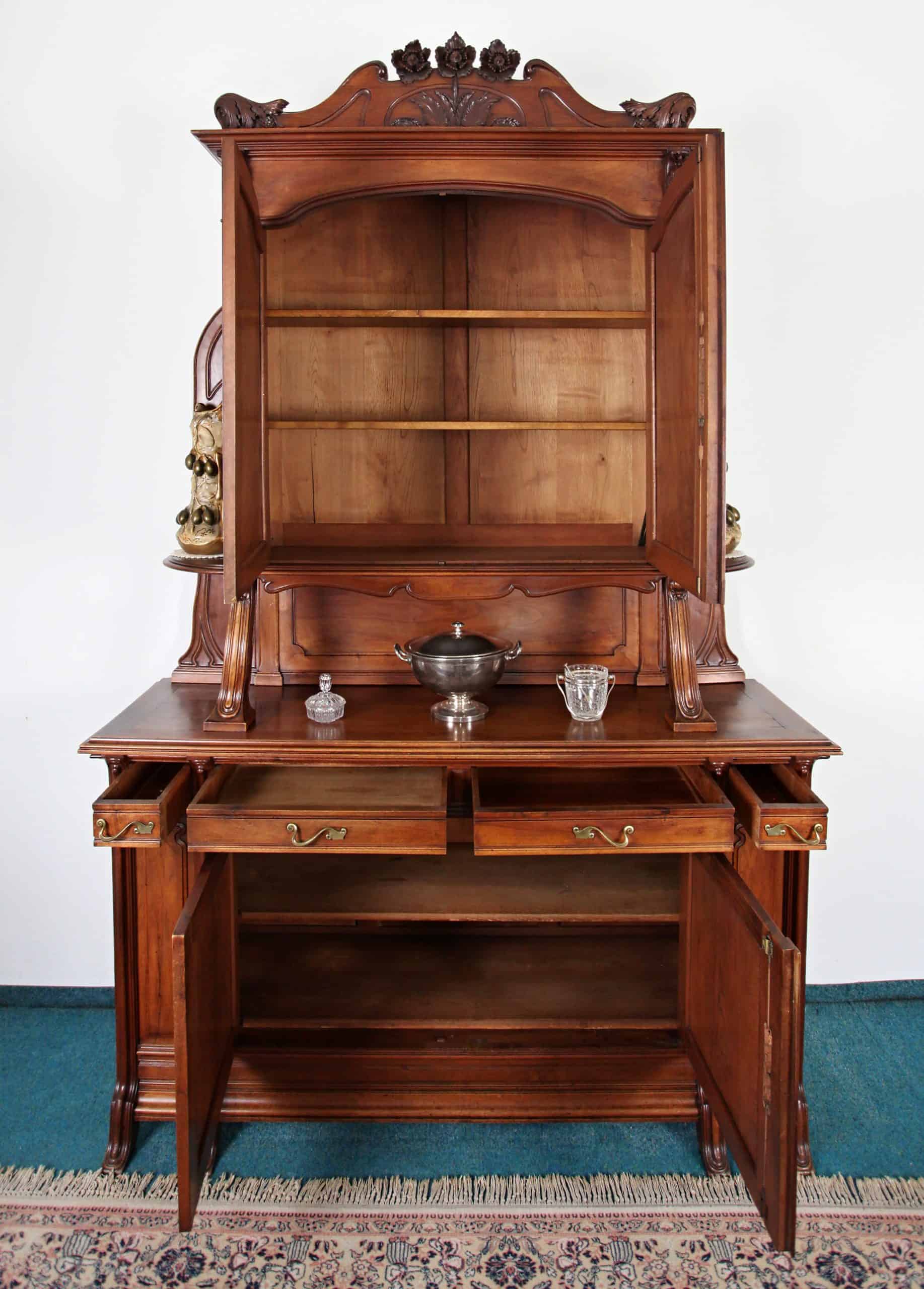 Jídelna byla částečně prezentována na zemské výstavě v Paříži v roce 1904 a vyskytuje se v publikaci salon 1904. Celá jídelna je ručně vyrobena z masivního ořechu s bohatým rostlinným dekorem s mosaznými madly v témže provedení. Byla to nejlepší umělecko-řemeslná kvalita té doby, která se dala objednat. Jídelna byla vyrobena pro jednu francouzskou vilu velmi bohaté rodiny. Vše je propracováno do detailu. Jedná se o komplet rozkládacího jídelního stolu s osmi židlemi, velký příborník a bufet s nástavbou. Židle mají původní kožené čalounění – není v dobrém stavu a zajistíme restaurování dle požadavku ( kůže nebo látka), Ke stolu jsou nově dodělané rozkládací mezidíly – původně to byly jen dřevěné desky, které při rozložení stolu překrýval ubrus. K bufetu i příborníku jsou dodělané klíče – zámky jsou funkční. Dřevo není napadeno dřevokazným hmyzem. Po přečalounění židlí bude jídelna v perfektním stavu – vhodná k dennímu užívání. Podobná kvalita se objevuje jen zřídka. Provenience: Francie.