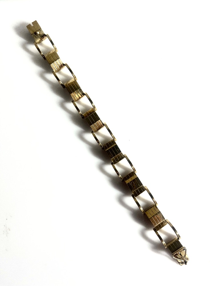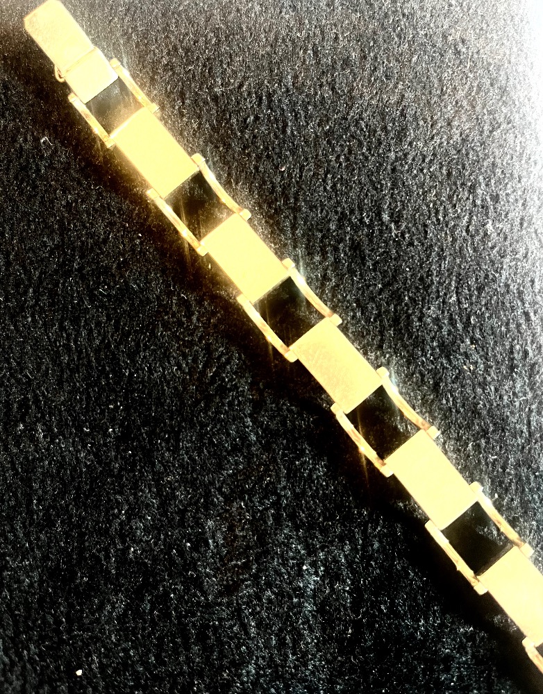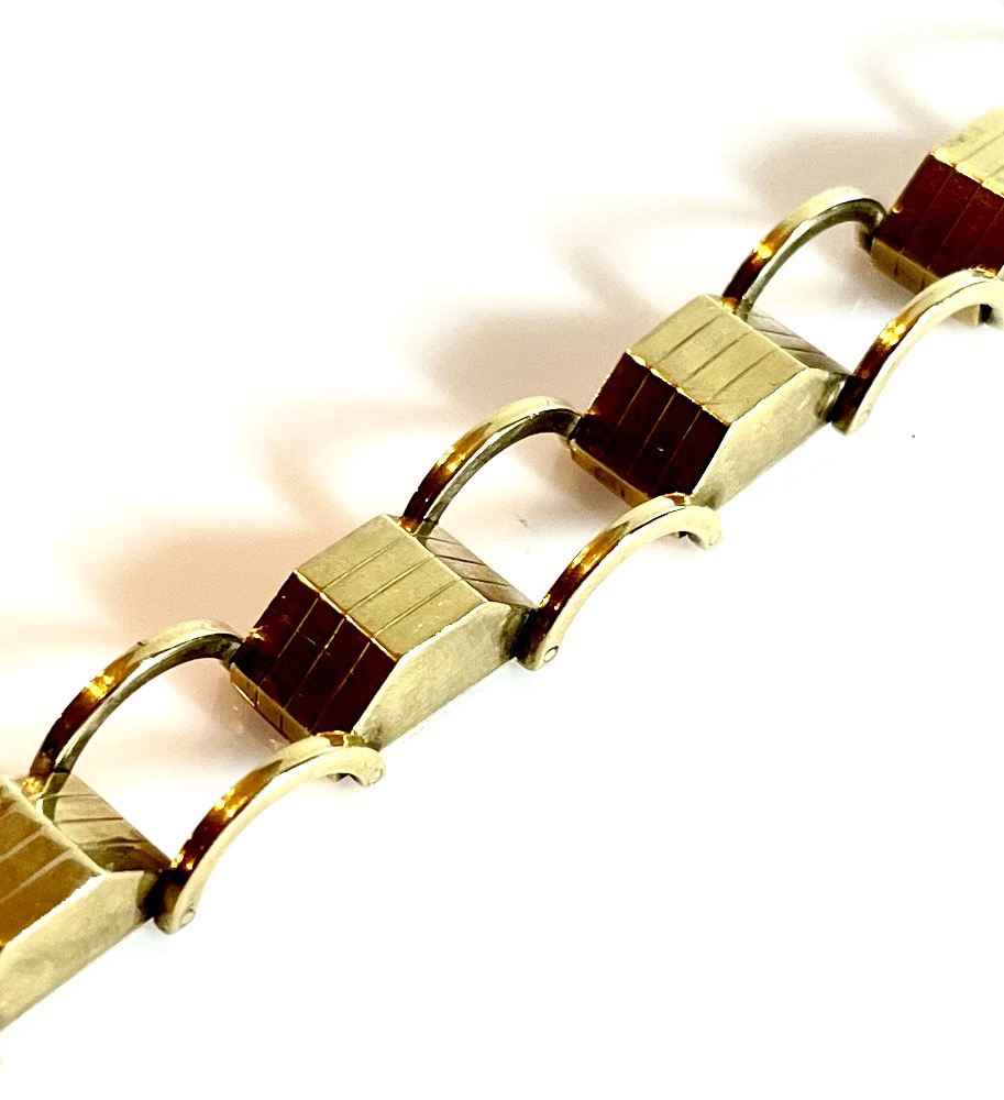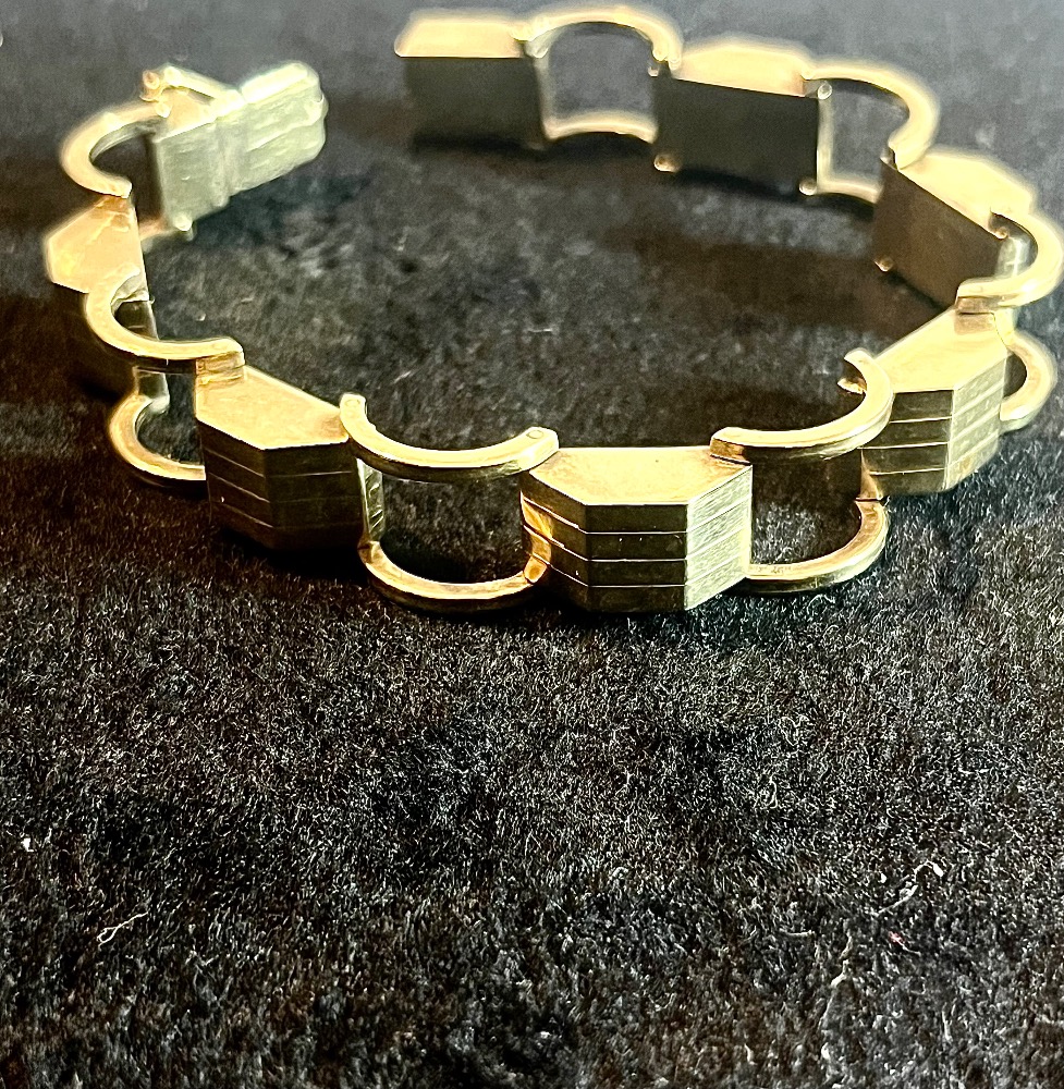 Originální starožitný náramek ze žlutého 14 karátového zlata AU 585/1000 ve stylu art deco z období první republiky, přibližně kolem roku 1930, označený mistrovskou výrobní značkou JV a historickým dobovým puncem Lvíček. Zapínání na jazýček navíc s boční pojistkou. Váha náramku 19,970 gramů. Délka náramku na ruce po zapnutí je 19 cm, v otevřeném stavu s vysunutým zapínáním 20 cm. Náramek je v perfektním stavu.