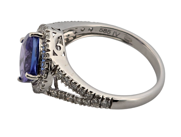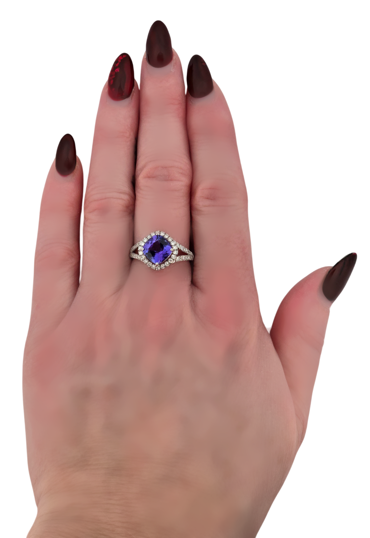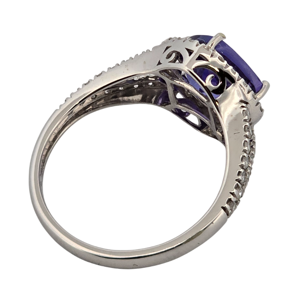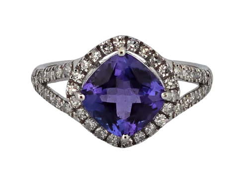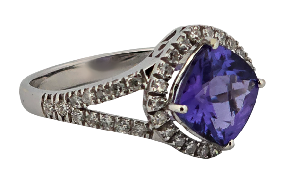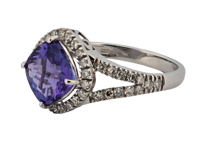 Popis: Luxusní tanzanitový prsten z bílého zlata s diamanty. Centrální kámen je přírodní tanzanit překrásně sytě modré barvy s fialovým pleochroismem, smíšeného brusu \“antik\“ – nahoře briliantový, dole portugalský. Kvalita brusu je velmi dobrá a váha kamene je cca 2,3 ct (rozměr kamene je 7,8 x 7,8 x 4,82 mm). Na prstenu je dále osazeno 46 kusů přírodních diamantů briliantového a jednoduchého brusu. Kvalita je velmi dobrá a váha je cca 0,48 ct. Na vnější straně prstenu je signace IV – jedná se o prsten z dílny Harry Ivens (slavná šperkařská dílna známá pro své výtvory, které často kombinují exotické drahokamy s klasickými vzory). Jedná se elegantní luxusní šperk, vhodný také na investici.
