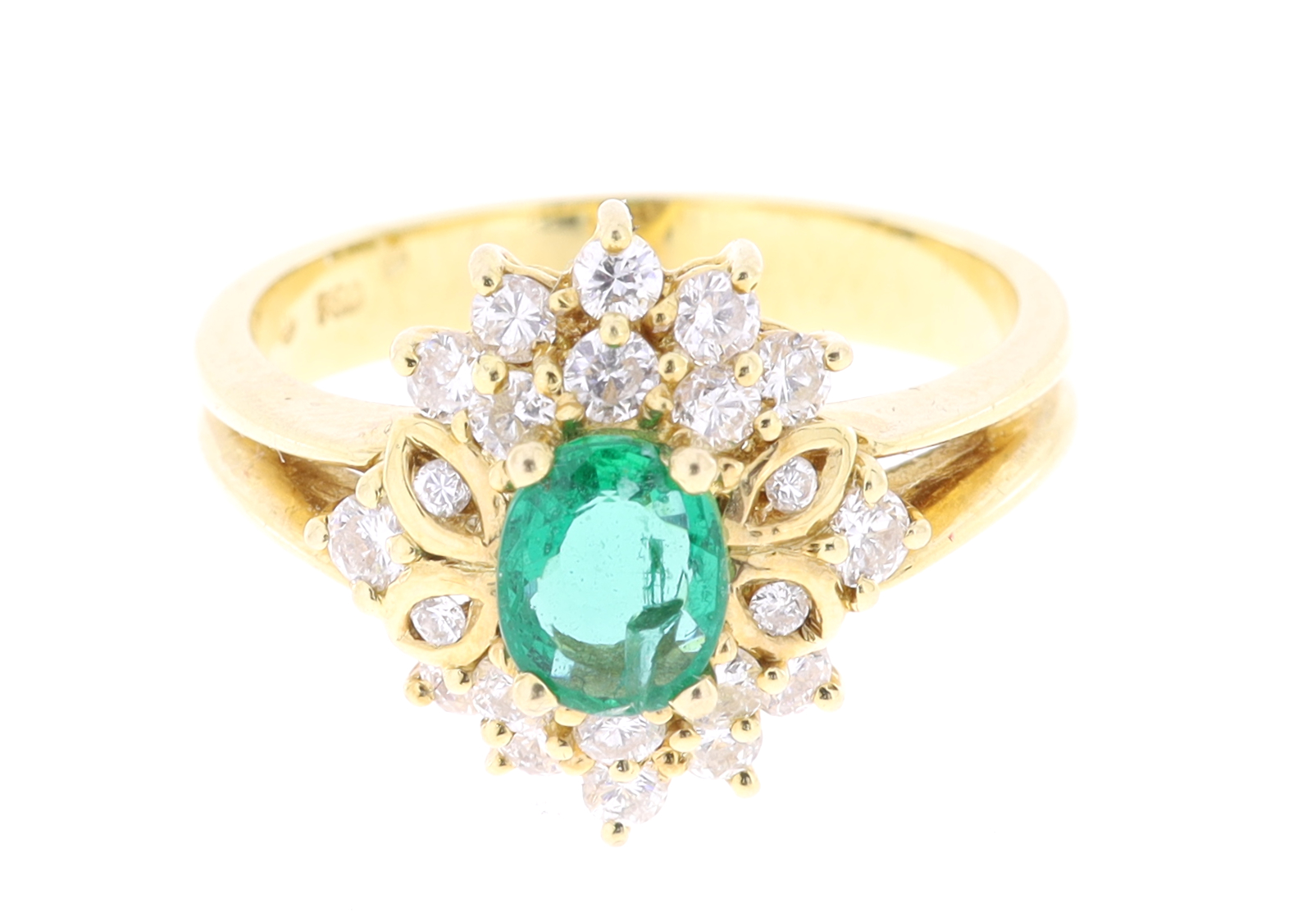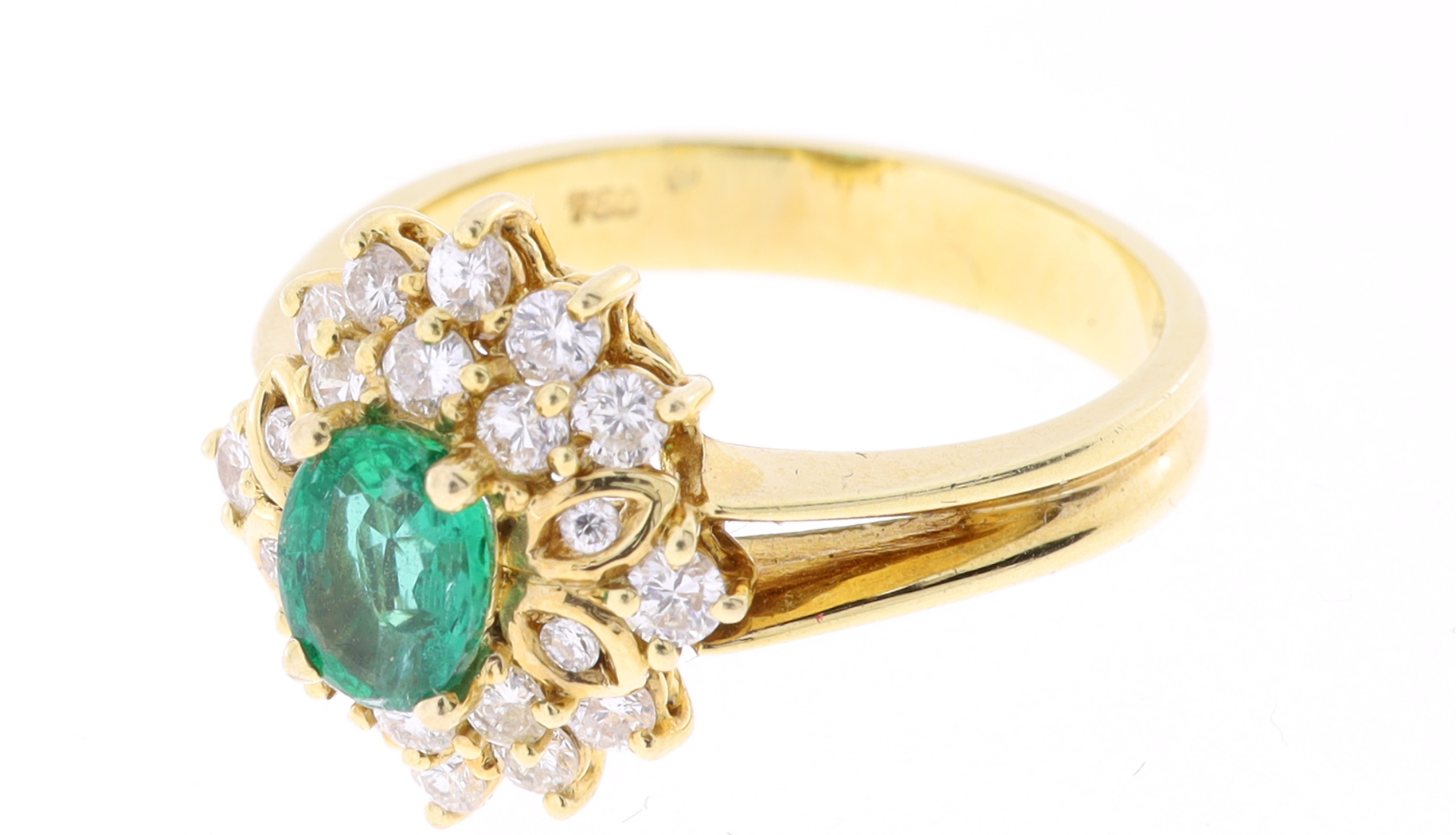 Elegantní prsten z 18karátového žlutého zlata (750/1000) zaujme na první pohled svým nadčasovým designem a precizním zpracováním. Dominantou šperku je velice čistý smaragd o přibližné hmotnosti 0,5 ct, který svou sytou barvou dodává prstenu jedinečný charakter. Smaragd je harmonicky obklopen 22 přírodními diamanty o celkové hmotnosti cca 0,48 ct, jejichž velmi dobrá kvalita podtrhuje celkový luxusní dojem. Tento nádherný prsten je ideální volbou pro milovníky výjimečných šperků i jako hodnotný dárek. Součástí šperku je také odborný posudek od Dr.Jaroslava Hyršla.