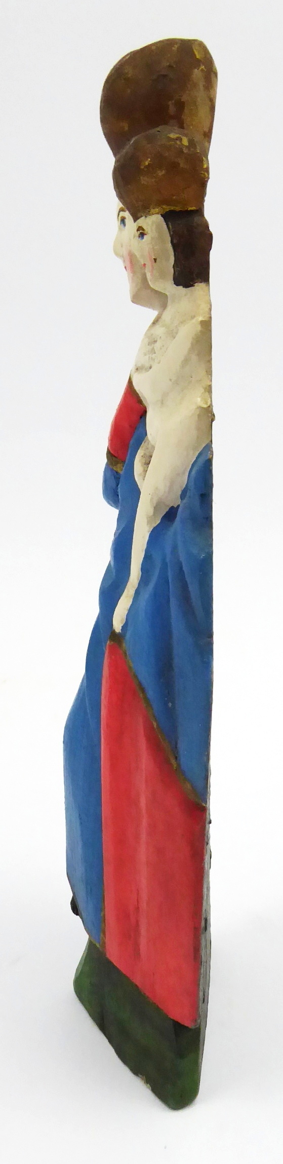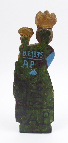 Socha stojící Panny Marie s nahým Ježíškem na levé ruce je zpodobněním Panny Marie Svatohorské. Madona je oblečená v červených šatech a modrém plášti. Obě postavy jsou korunovány. Na jednoduchém zeleném podstavci. Zadní strana plochá a na ní ručně psaný modrý nápis O.P.1935 a písmena AP. Čechy, rok 1935. Výška 21 cm.