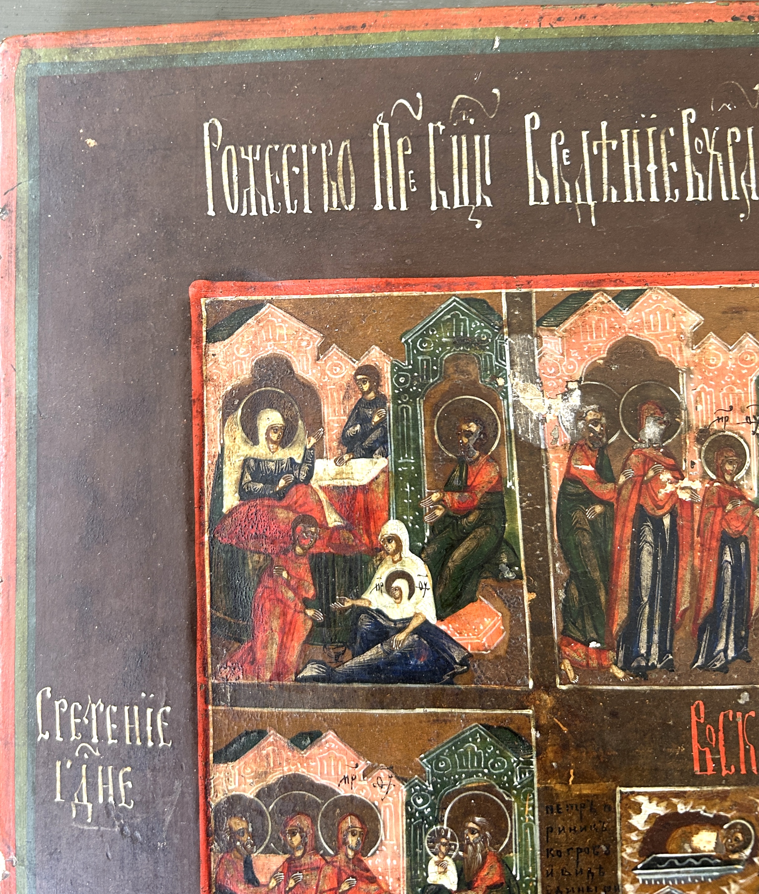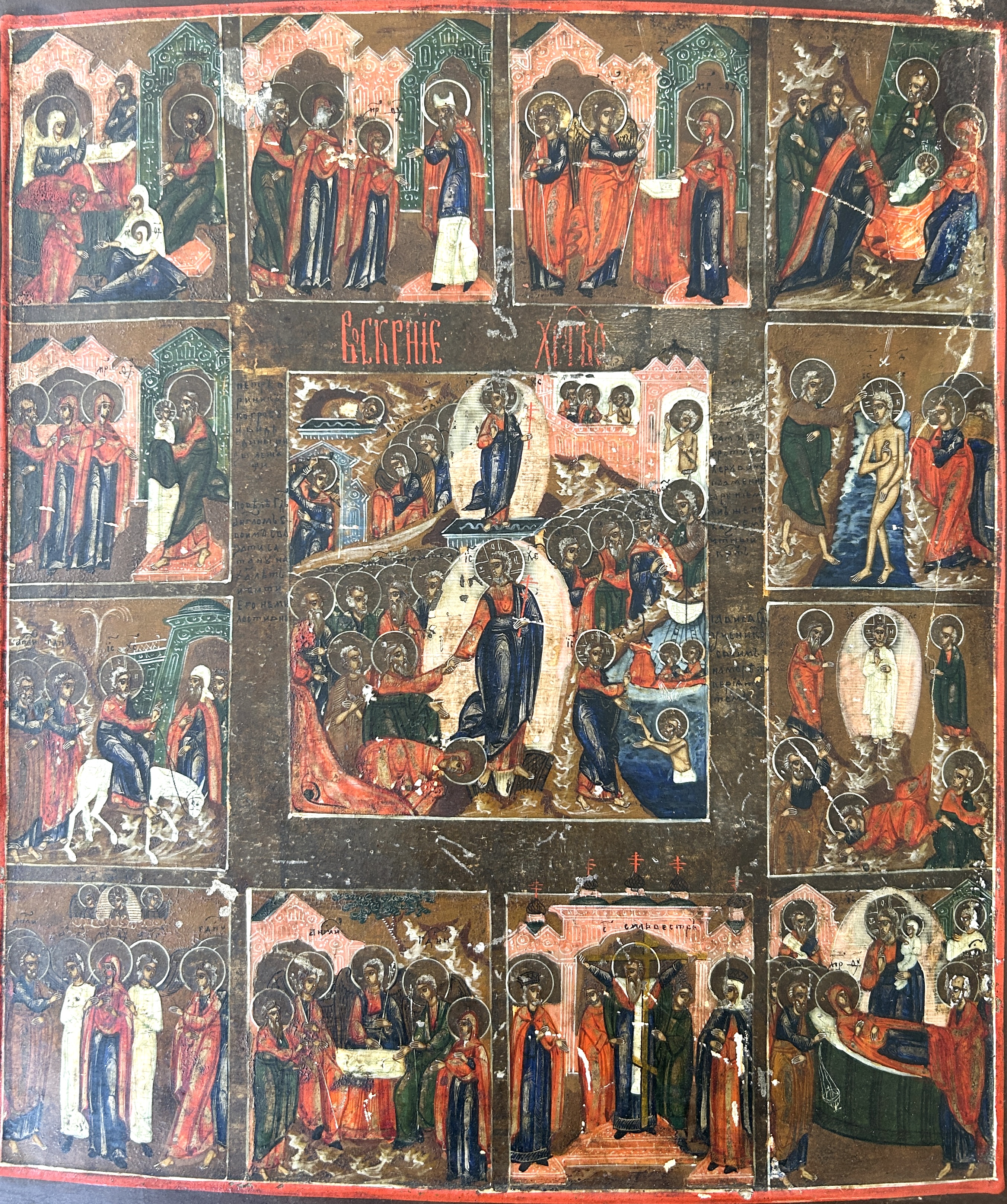 Obraz, resp. ikona s 12 velkými pravoslavnými svátky s ústředním výjevem Nanebevstoupení Krista, pořadí jednotlivých výjevů (Narození Přesvaté Bohorodice, Uvedení Přesvaté Bohorodice do chrámu, Zvětšování Přesvaté Bohorodice, Uvedení Páně do chrámu, Příchod Páně do Jeruzaléma, Nanebevstoupení Páně, Křest Páně, Proměnění Páně, Zesnutí přesvaté Bohorodice, Svatá Trojice, Povýšení svatého Kříže). Celkem 13 výjevů členěno do jednotlivých obdélných okének, vnější červené a zelné tlustší linie, po stranách opatřeny nápisy v azbuce, u významných postav i malý přípis s jejich jmény. Stylové pojetí zcela poplatné tradičnímu způsobu malovaných pravoslavných ikon, jež čerpá ze silné byzantské tradice. Strnulejší postavy s tmavším inkarnátem a lineárně stavěnou drapérií zasazeny do schématického architektonického rámce. Roucha postav zejména v modro-červeném zbarvení, odkazující pro křesťanství významně symbolickým a ceněným pigmentům. Kvalitní tradičně pojatá malba, deska patrně původně zasazena do oltáře sloužícího k domácí zbožnosti. Dle ústního posouzení experta na pravoslavné ikony datováno do 18. století s ruskou proveniencí.