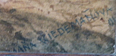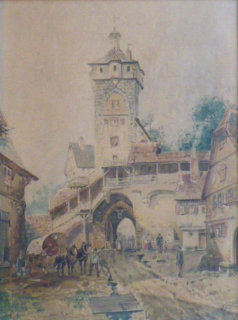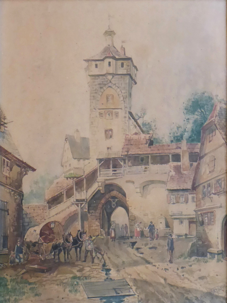 Akvarel na papíru 33,5 cm x 25,5 cm. Signováno vpravo dole s nečitelnou datací. Scenérie s postavičkami a koňským povozem pod starodávnou usedlostí s vysokou kamennou věží. V odstupňovaném rámu s patinou, s paspartou a sklem. Čechy, přelom 19. a 20. století. Celkový rozměr s rámem 43 cm x 36 cm.