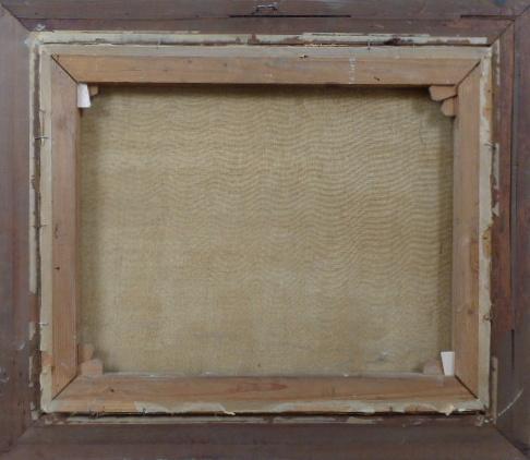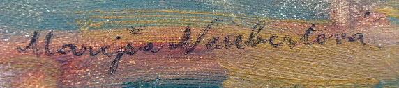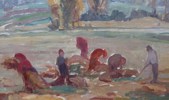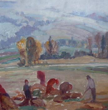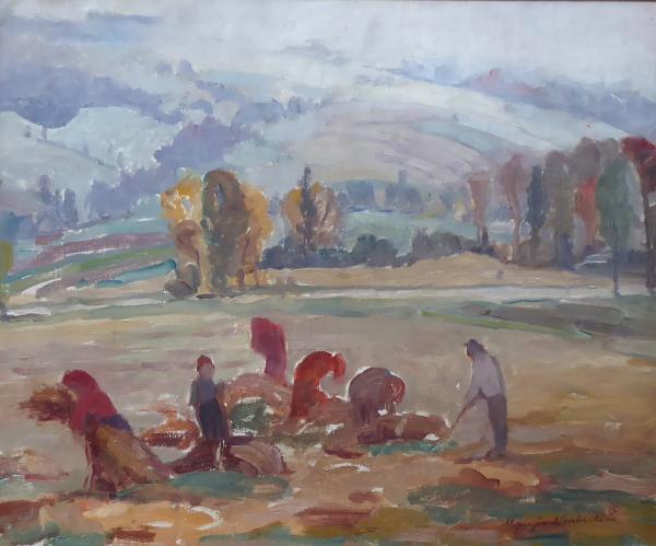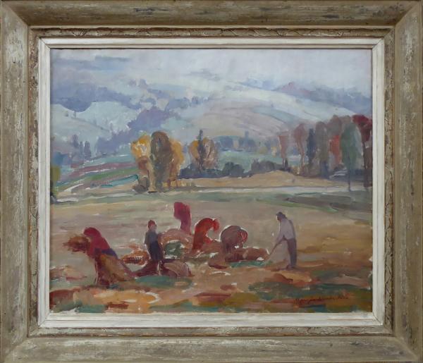 Olej na plátně 50 x 61 cm. Ženy vázající povříslem obilí do snopů na poli, s výhledem do kopcovité krajiny za mlžného dne. Signováno vpravo dole. Československo 1930 – 1945. Originální umělecký patinovaný rám s bílou vnitřní linkou. Celkový rozměr s rámem 65 x 76 cm.